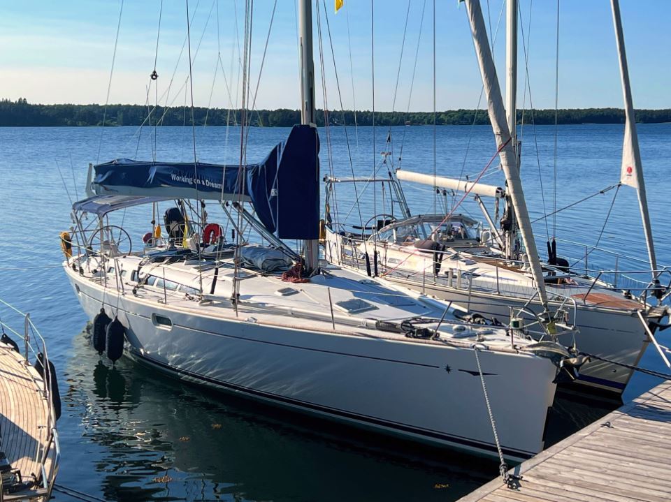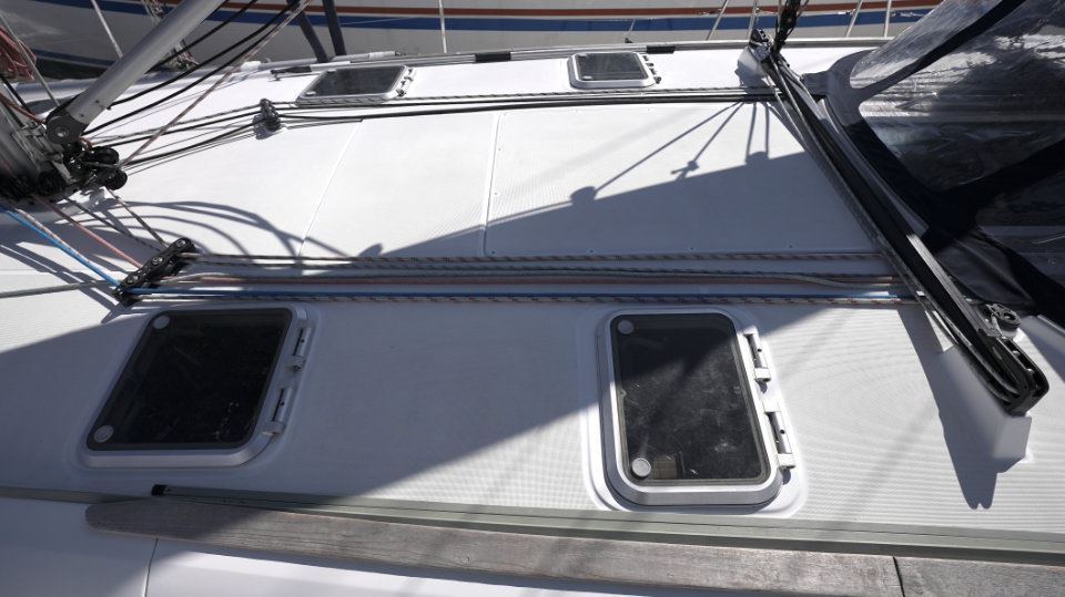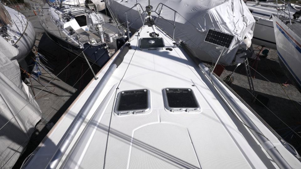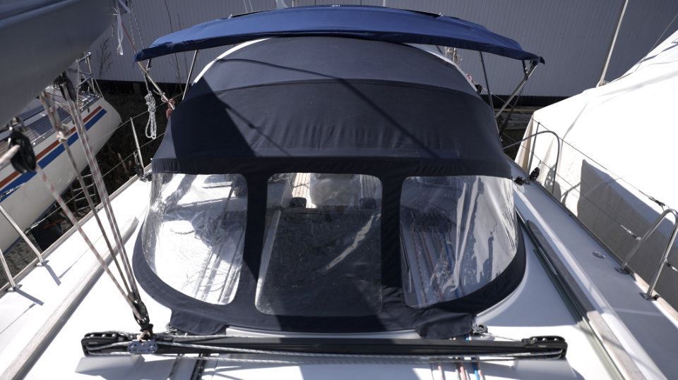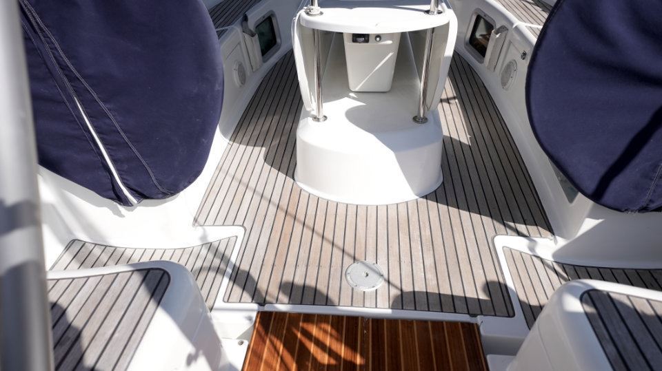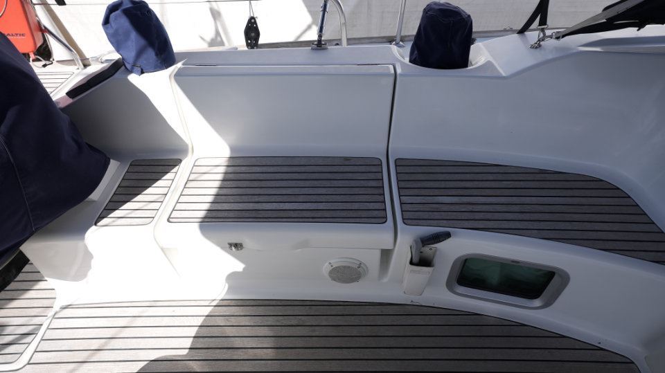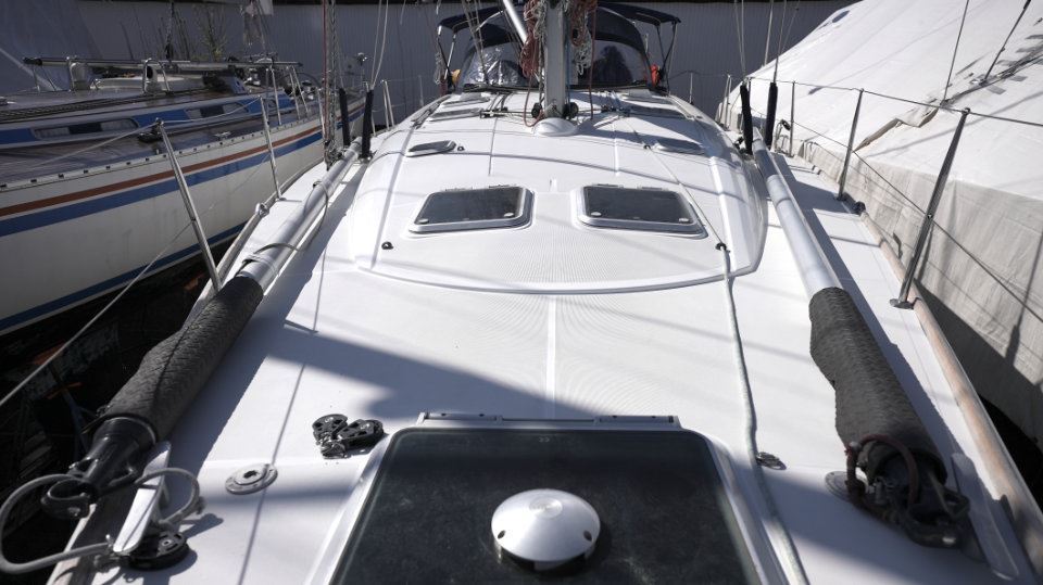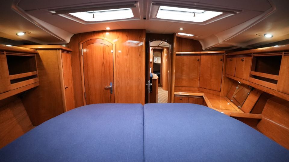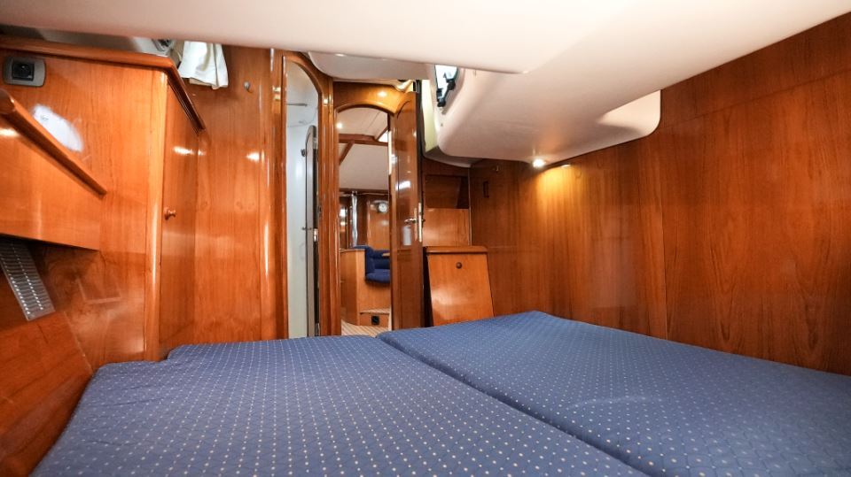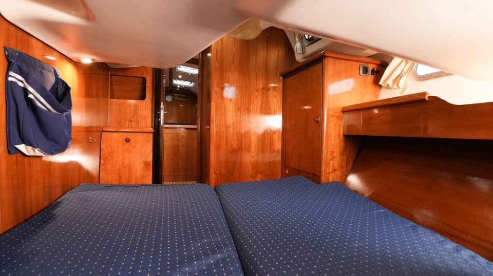 Craftsmanship is evident throughout this boat, with quality woodwork, upholstery, and fittings. Numerous hatches and portholes provide good natural light and ventilation. The deck layout is designed for comfort and ease of use, with twin wheels for better visibility and helming. The large cockpit easily hosts eight crew members and includes a fixed table that doubles as a secure brace when the boat heels. A walkthrough transom in the stern makes water access easy and simplifies dinghy handling. Additional features include electric winch, a lot of sails, a bow thruster for better maneuverability, and a sturdy sprayhood and bimini for protection and visibility.