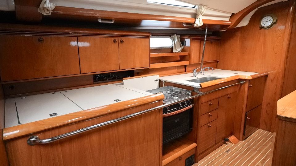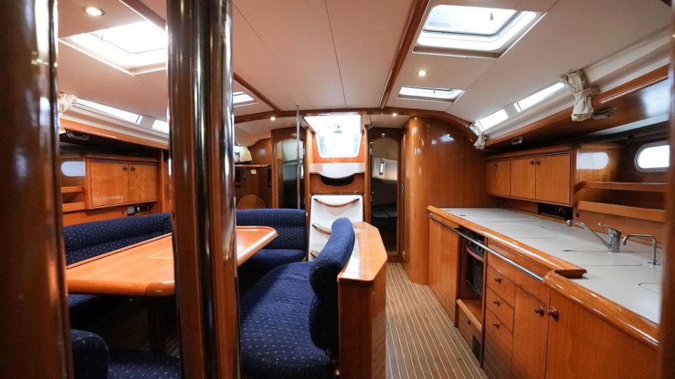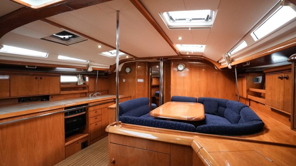 In the centre, you find a large and bright saloon that features a U-shaped dining area with a wooden table and spacious sofa. The galley is fully equipped with a large countertop, gas stove, oven, refrigerator, and double stainless-steel sinks, offering ample space for meal preparation. The navigation station has a large desk for charts, storage, integrated electronics, and a comfortable chair, perfect for short naps during night shifts.