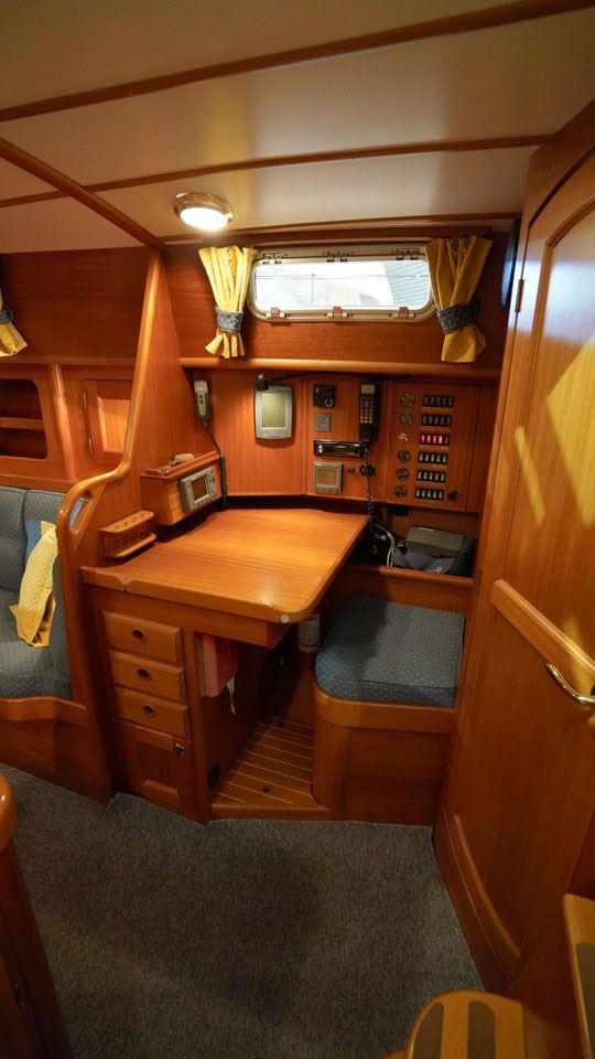 The layout includes two cabins with double berths, and a large saloon with two sofas and an extendable table. The galley is located to port of the entrance. The navigation area and the head with shower are located to starboard of the entrance. The amount of storage throughout the yacht is amazing. The interior is built in mahogany to the highest Malö finish.