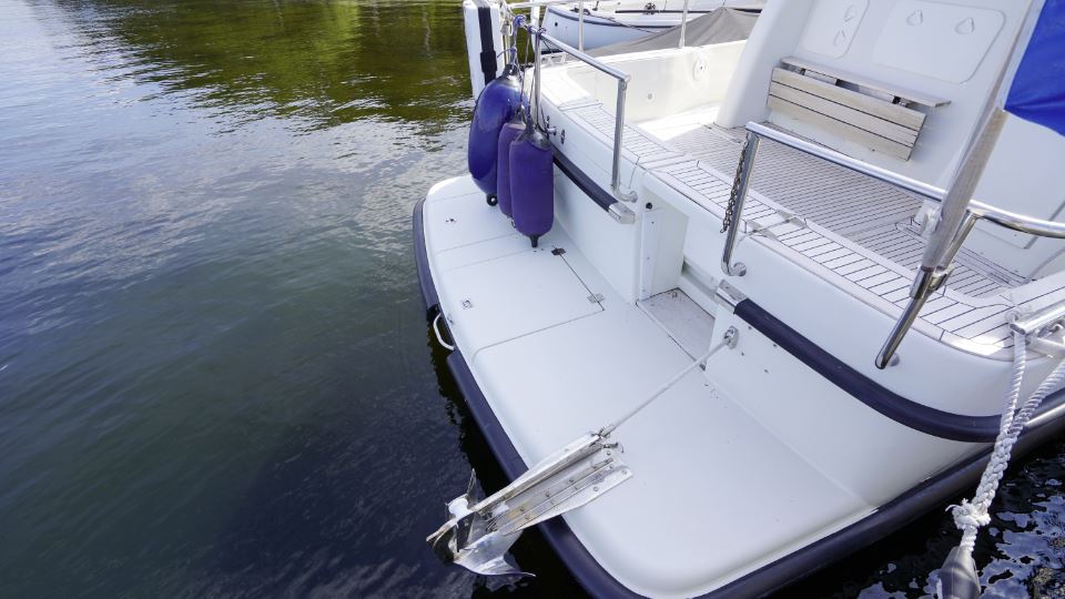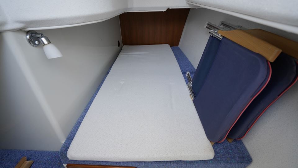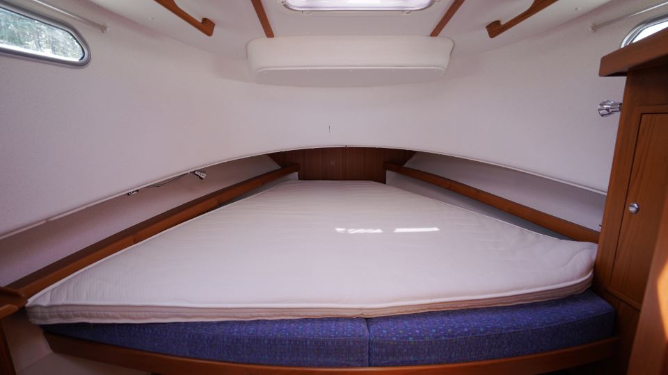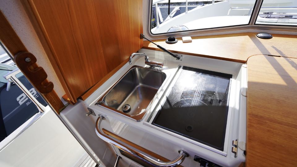 The layout offers two cabins, consisting of a forward cabin and an aft cabin. The owner’s cabin in the bow has a V-shaped double berth and a longitudinal single berth. In the bow, there is also a spacious and bright bathroom with shower. The aft cabin, accessible from the cockpit and the salon, features a spacious longitudinal berth on the starboard side and a transverse single berth. The aft cabin also serves as excellent additional storage space if the other large storage compartments are not sufficient. The best feature of the boat is, of course, the spacious pilothouse with sliding entrance doors on both sides and a large skylight. At the aft end of the pilothouse is the salon with a spacious sofa and a full-length pole for the table. At the helm station, there are forward-facing comfortable chairs and an unbeatable view through the fixed windows. Naturally, you can adjust the seat and steering wheel to your preferred driving position. On the port side, there is a small but practical galley with a diesel hub, microwave, and refrigerator. There is plenty of storage space, good ventilation, and natural light. The aft deck features a secure cockpit with high railings and a solid stainless-steel guardrail. Large gas-spring-assisted hatches cover the spacious engine room and storage compartments at the stern. Through a door in the railing, you can reach the swim platform, which also serves excellently when lifting your lobster pots.