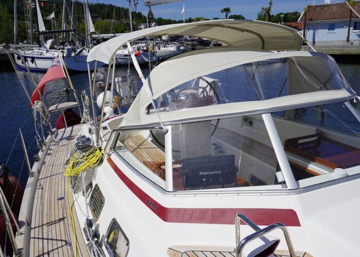 Najad 440 VENTURE has been used for family sailing in Scandinavian, mainly Swedish waters. It is in good condition for its age, well equipped and continuously updated. It has always been professionally serviced and kept inside during winter times – at Orust Yacht Service.