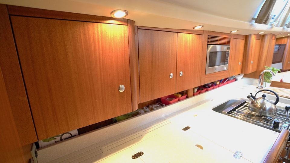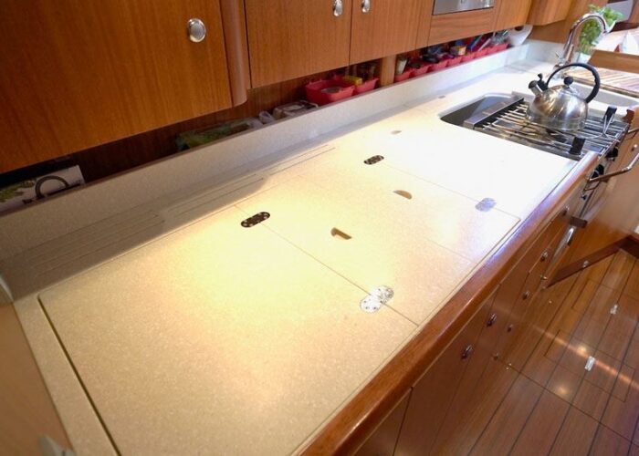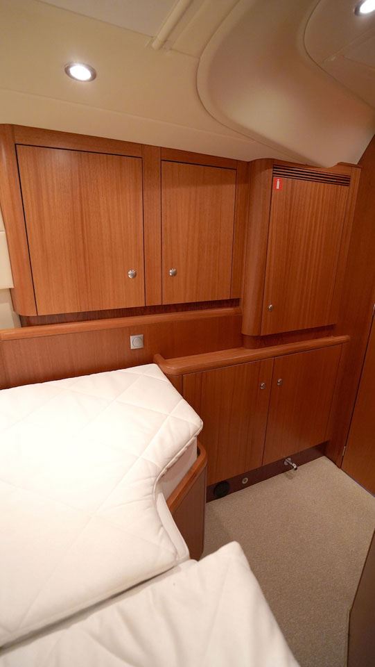 The interior layout offers a large owner’s aft cabin with double berths and en suite toilet with shower. The forward guest cabin also offers a double berth, en suite toilet with shower and plenty of storage space. A large longitude galley is located to port of the entrance extending aft wards and the navigation table with a comfortable seat is located directly to starboard of the entrance. The saloon has a L-sofa to port and two chairs to starboard. A superb layout for an ocean-going yacht!