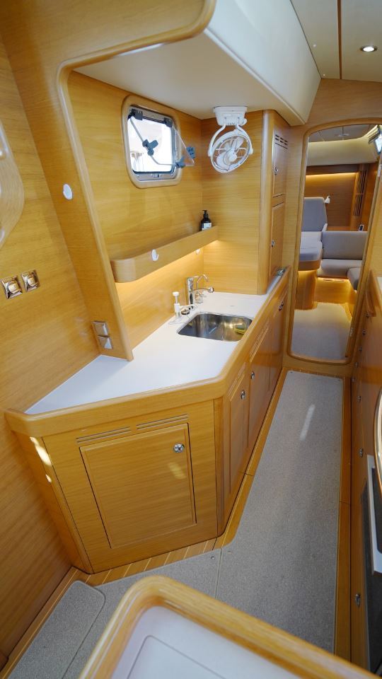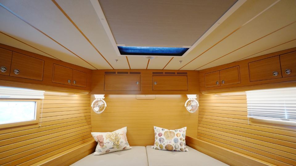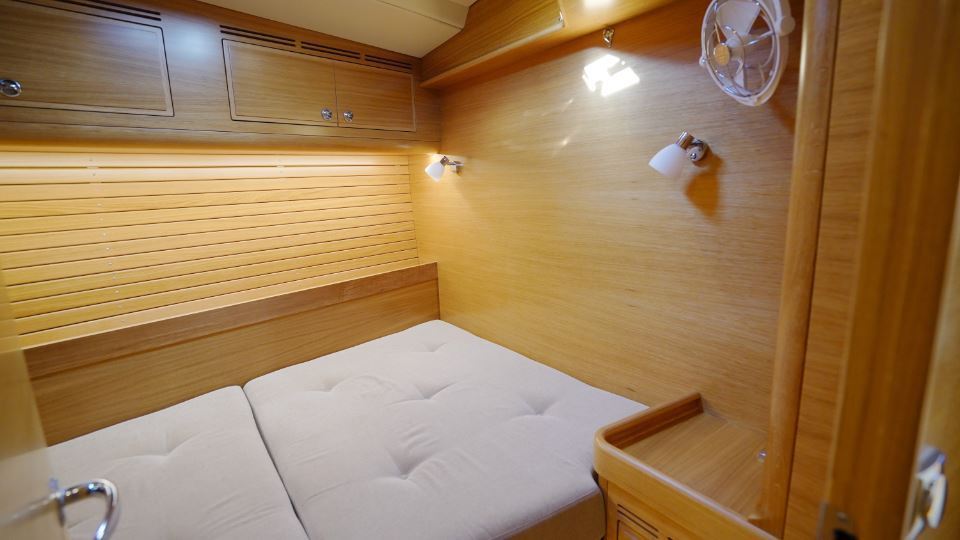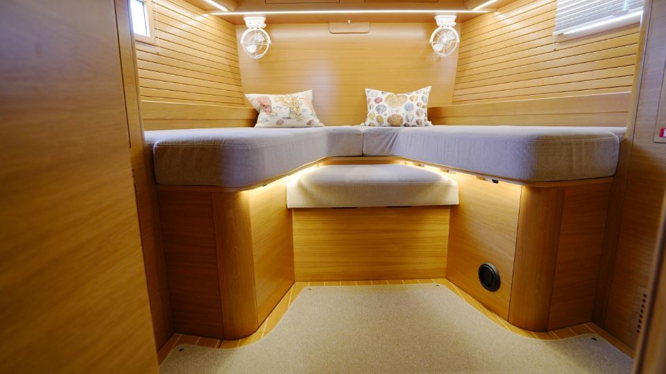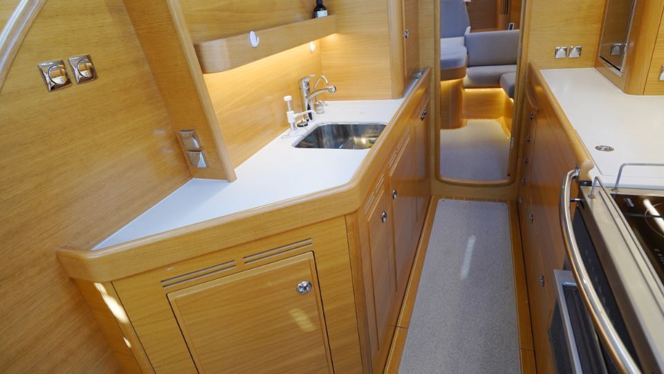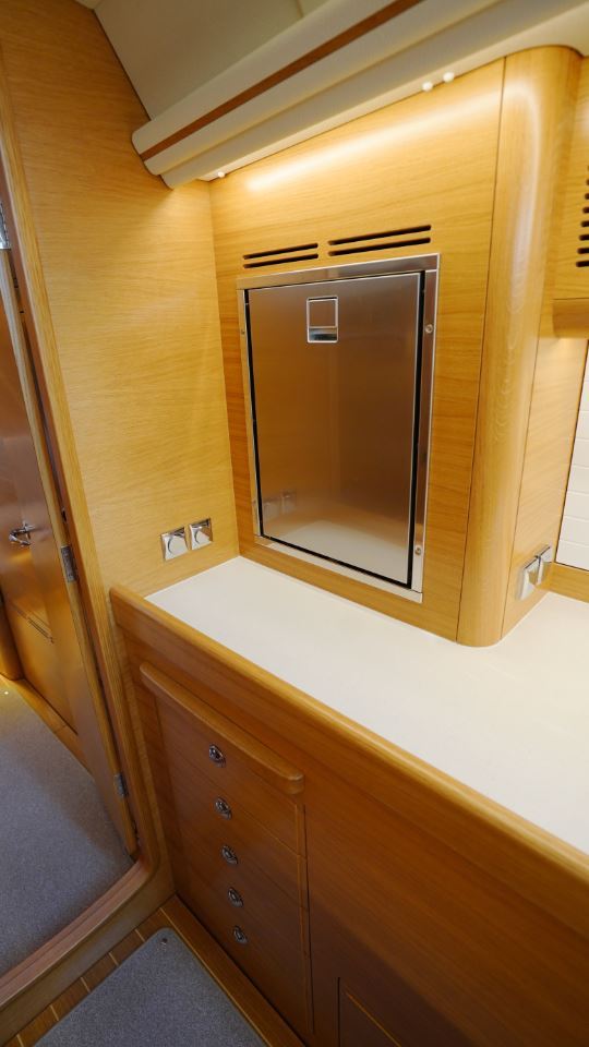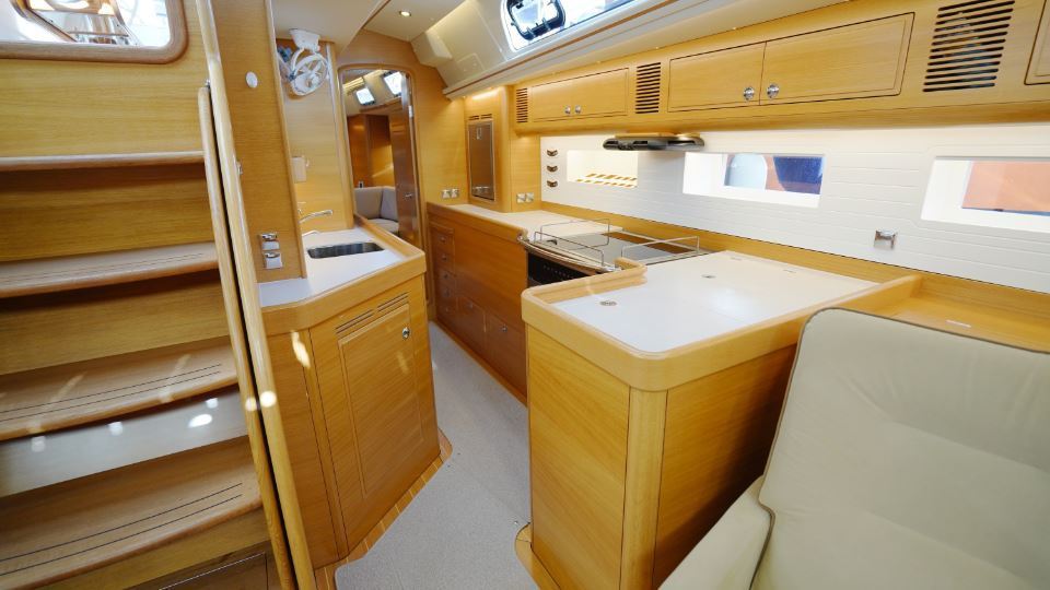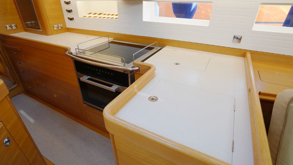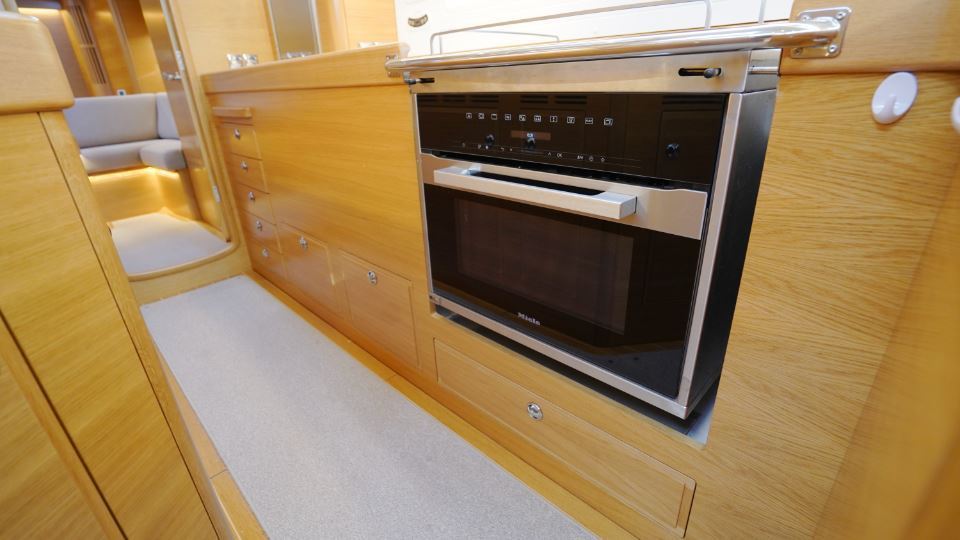 Below deck, the interior is finished in light European oak, creating a bright and inviting atmosphere. The saloon features an L-shaped sofa and two comfortable armchairs upholstered in light Alcantara. There is a UHD TV in the aft cabin and a retractable UHD TV in the saloon. MALINCO offers three cabins, all with double berths and sprung mattresses for maximum comfort at sea. All cabins and the saloon are air-conditioned with three independently controlled units. The galley is fully equipped for extended cruising, with a Miele induction stove, extractor hood, three top-loading fridge/freezers and an additional front-opening refrigerator. A washer-dryer is located in the aft head and both heads feature electric towel warmers. A watermaker adds further independence for long voyages.