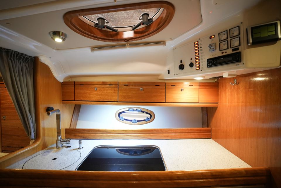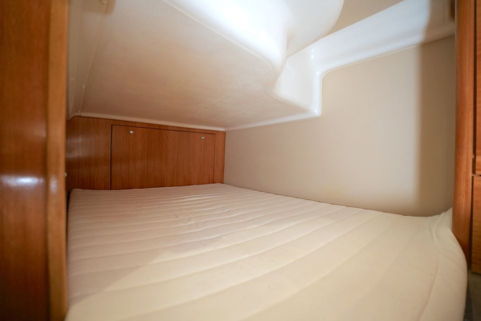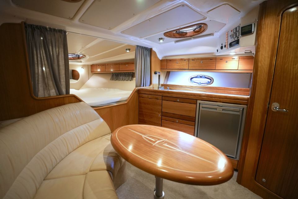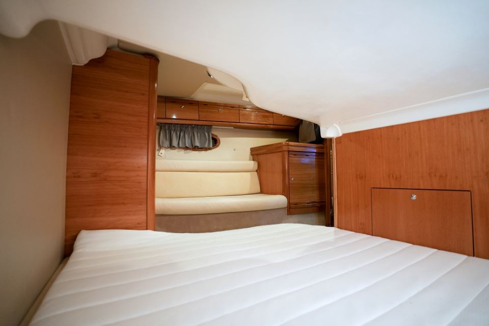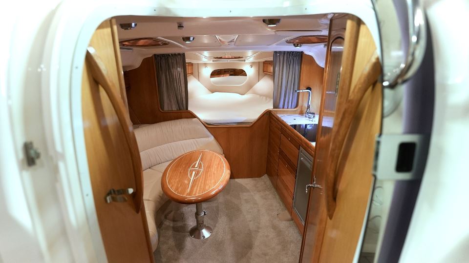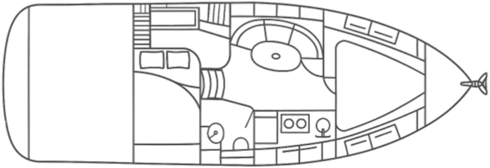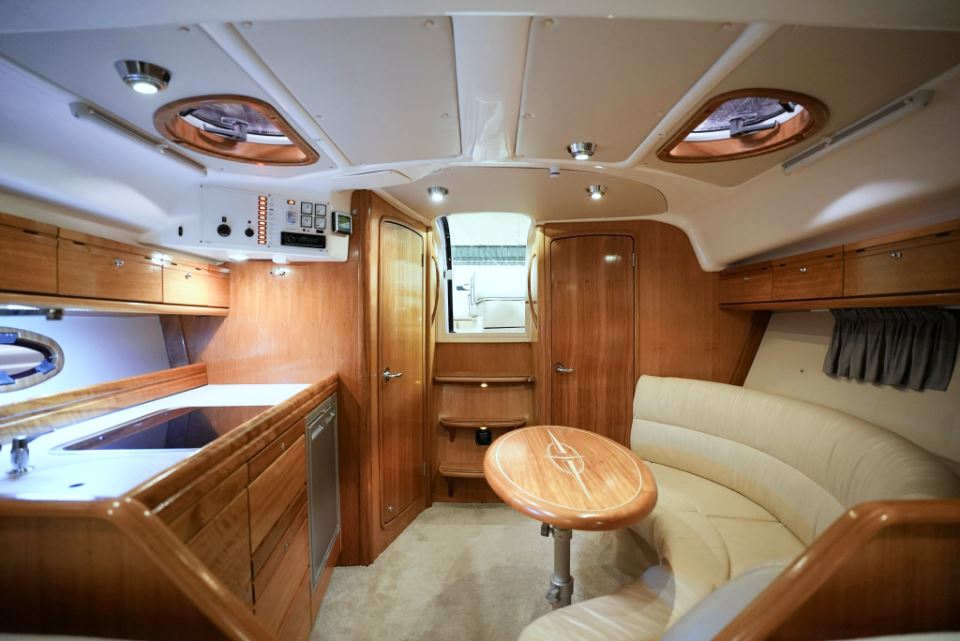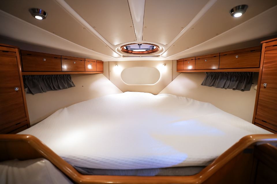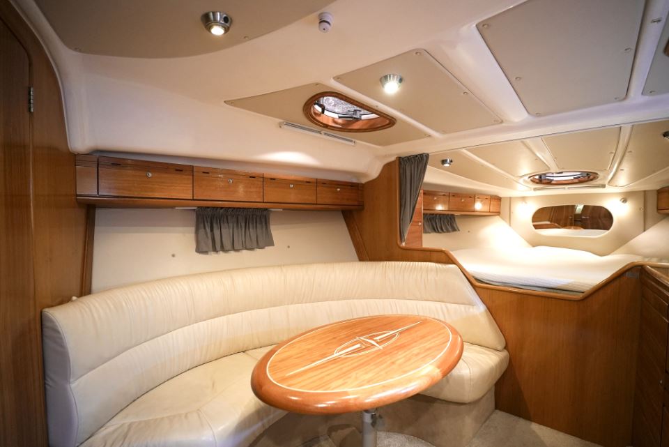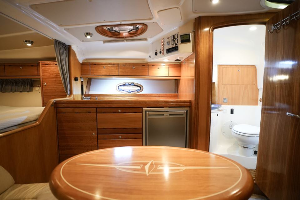 Sittbrunnen fungerar som båtens samlingspunkt, med teakdurk, bred badplattform och en sittgrupp i aktern som skapar en trivsam och social mötespunkt med bra accerss till vattnet. Under däck möts man av en ljus och rymlig salong med pentry, toalett och rymlig förpik. Akterut finns en enskild akterkabin med bred dubbelkoj och separat garderob och soffa. Layouten gör längre vistelser ombord möjliga och bekväma trots sin storlek.