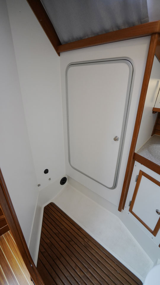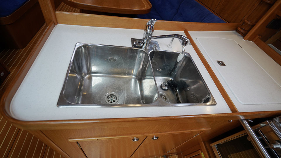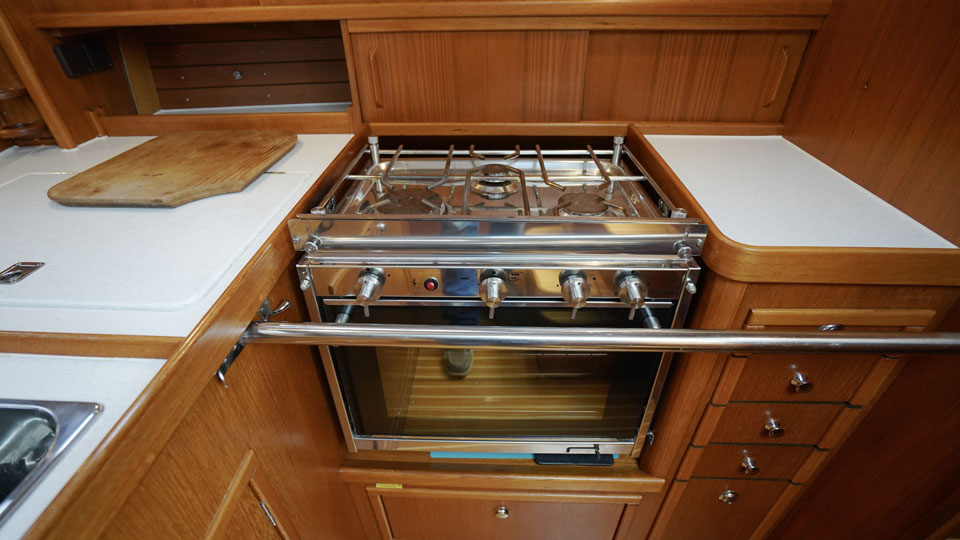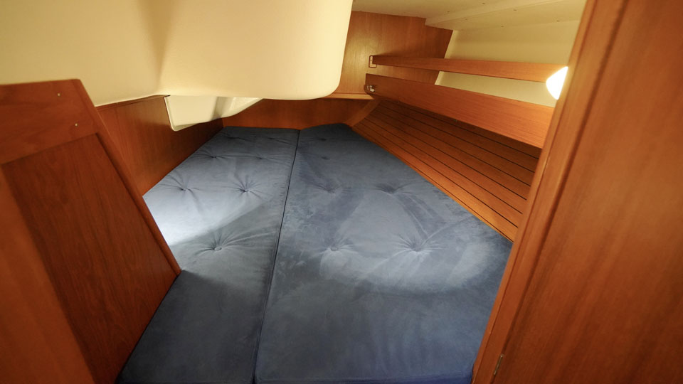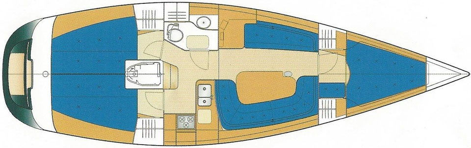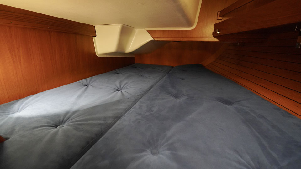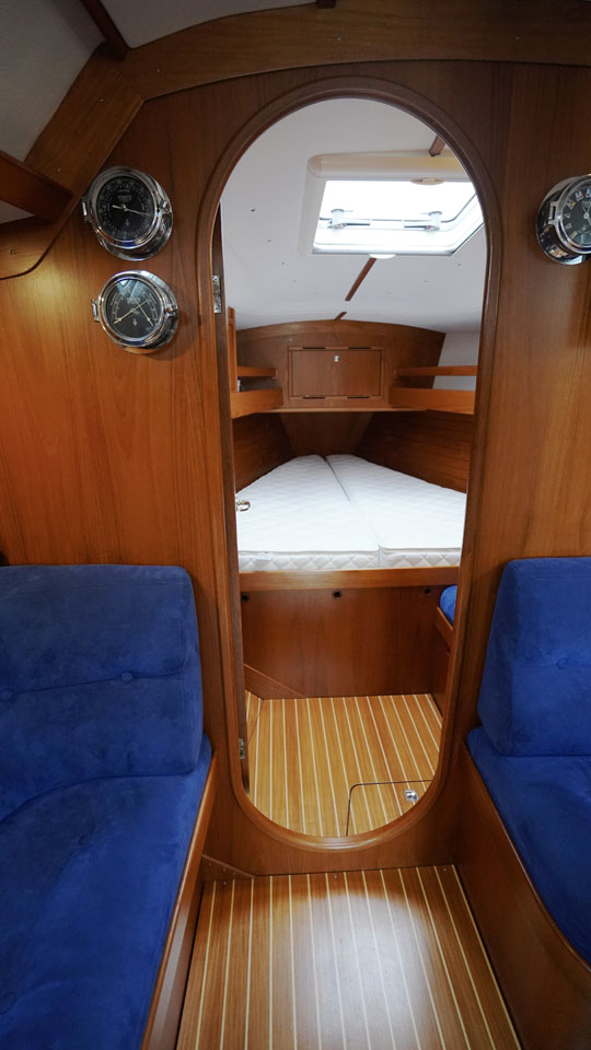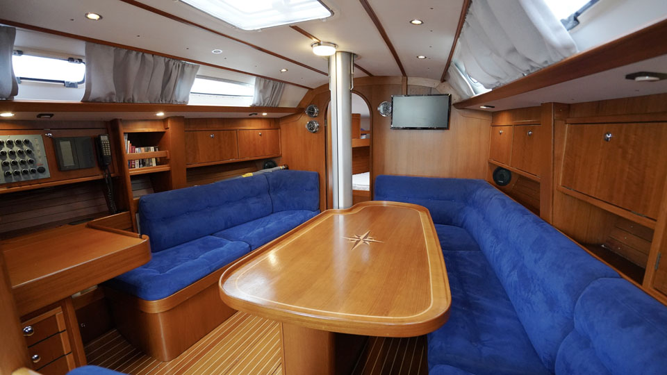 Segelhanteringen är väldigt smidig där alla fall, skot och kontrolllinor leds akterut till den rymliga sittbrunnen. Här har rorsman bra överblick över hela båten och det finns gott om sittplats för alla ombord. Under däck möts man av en öppen salong med ett L-format pentry direkt till styrbord och toaletten på babord sida. I förskeppet ligger Owners cabin med en rymlig v-formad dubbelbädd och sittplats. Salongen har två soffor och navigationsplatsen är vänd akterut. Dom båda akterkabinerna är symmetriska och ger god plats till gäster eller barnen i familjen.