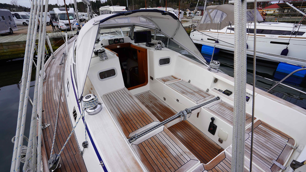 Denna moderna Hallberg-Rassy erbjuder utmärkta seglings- och sjöegenskaper och är lätt att hantera av liten besättning. Det förhållandevis stora storseglet och den något överlappande genuan gör seglingen superkul, även på kryss i smala farleder. Rorkulten ger en utmärkt känsla och bidrar till att sittbrunnen är mycket rymlig i hamn. Sittbrunnen erbjuder även bekväma sittplatser och bra skydd med sina höga ryggstöd.