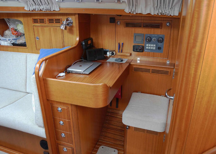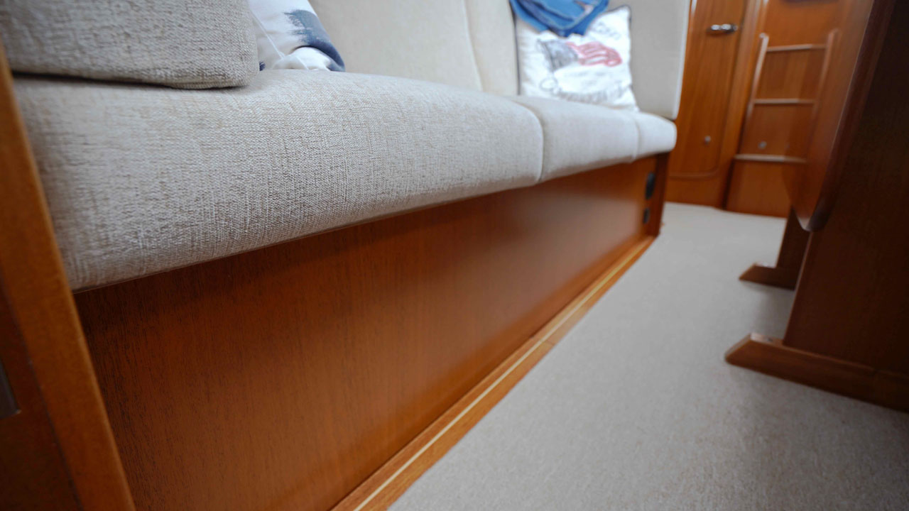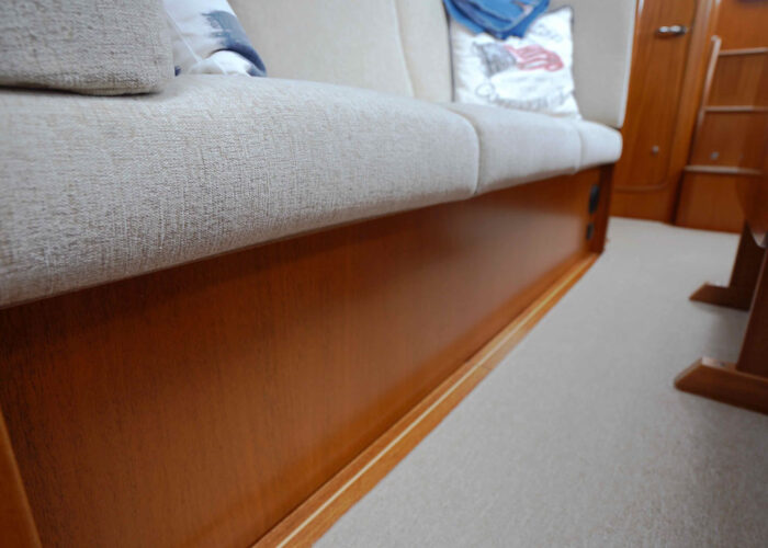 Inuti finns två hytter med dubbelkojer, salongen med två soffor och ett fällbart bord är ljust och mysigt. Ett rymligt kök, navigationsplats och toalett med dusch ligger i direkt anslutning till den solida och eleganta nedgångstrappan. Det finns gott om förvaringsutrymmen. Ventiler på däck, 12 öppningsbara portlights och två skylights borgar för god ventilation.