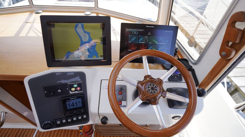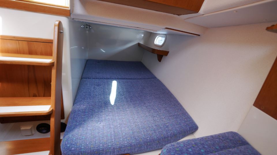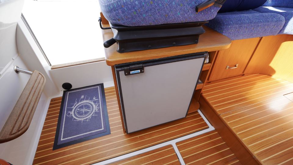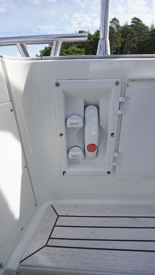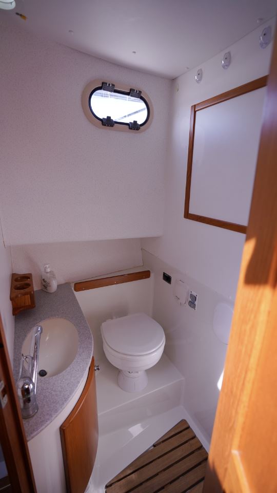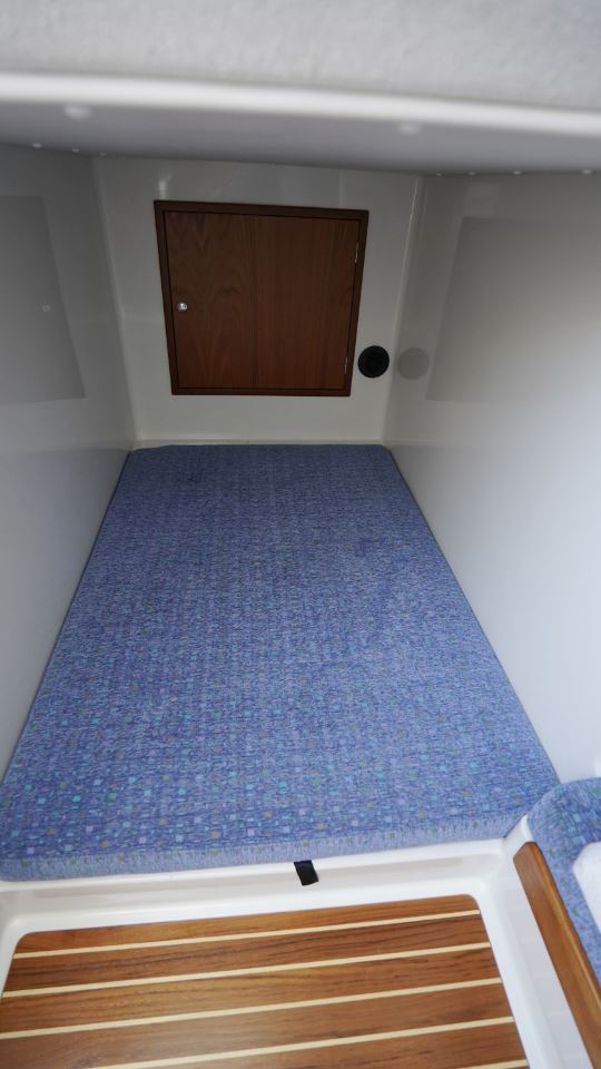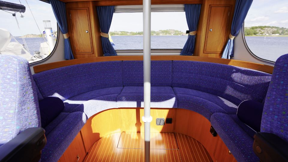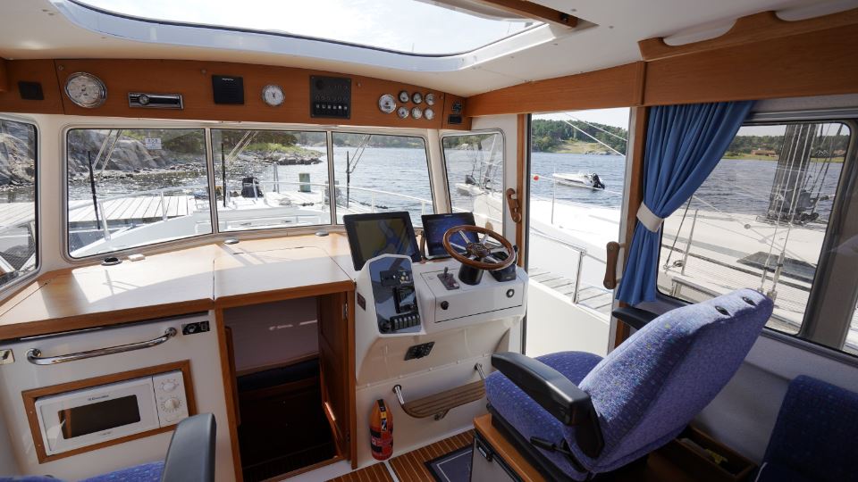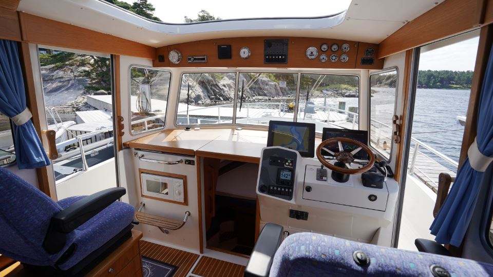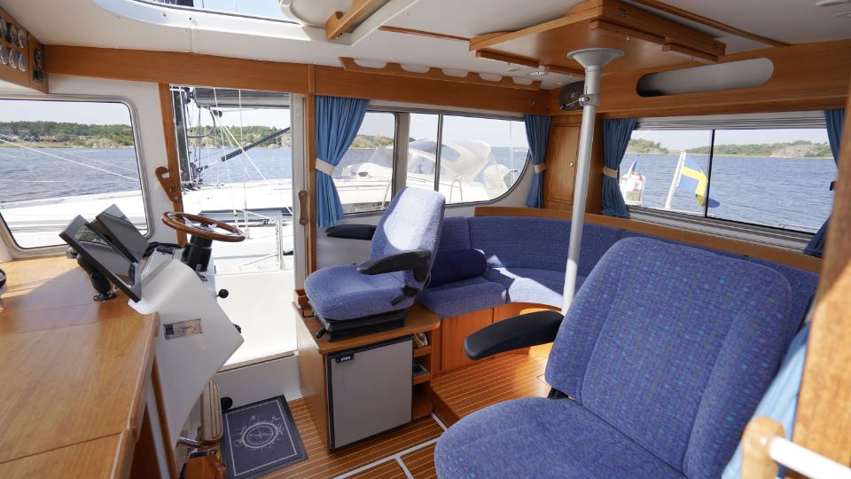 Layouten erbjuder två kabiner fördelat på en förpik och en akterkabin. Owner’s cabin i fören har en V-formad dubbelkoj och även en längsgående singel koj. I fören finns även en rymlig och ljus toalett med dusch. Den aktre kabinen med ingång från sittbrunnen, och åtkomst från salongen, har en rymlig längsgående koj på styrbordssidan och en tvärgående enkelkoj. Akterkabinen fungerar även utmärkt som extra förvaringsutrymme om inte de andra stora stuvfacken räcker till. Det bästa med båten är så klart det rymliga pilothuset med ingång via skjutdörrar på båda sidor och en stor taklucka. I akterkant av styrhytten finns salongen med en rymlig soffa och hel stång för bordet. Vid styrposition finns framåtvända bekväma stolar och en oslagbar utsikt genom dom fasta fönstren, självklart kan du justera stol och ratt efter din egen körställning. På babord sida finns ett litet men praktiskt pentry med dieseldriven häll, mikrovågsugn och kylskåp. Det finns gott om förvaringsmöjligheter, god ventilation och naturligt ljus. På akterdäck möts du av en säker cockpit med hög reling och solid rostfritt räcke. Stora gasfjäderförsedda luckor täcker det rymliga motorrummet och stuvfacken i aktern. Genom en dörr i relingen når man badplattformen som även fungerar utmärkt när du ska lyfta upp dina hummerburar.