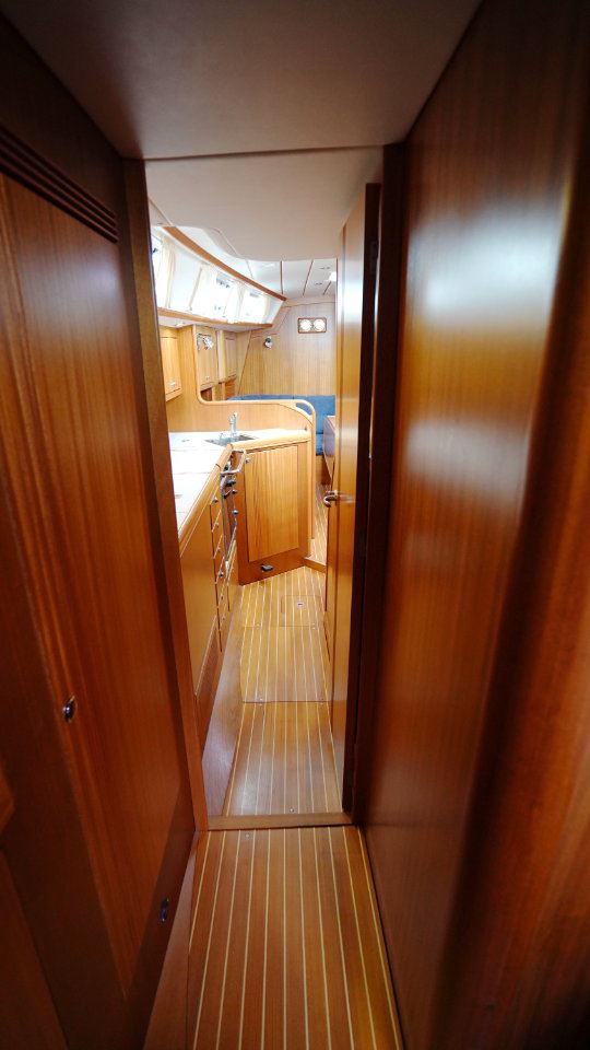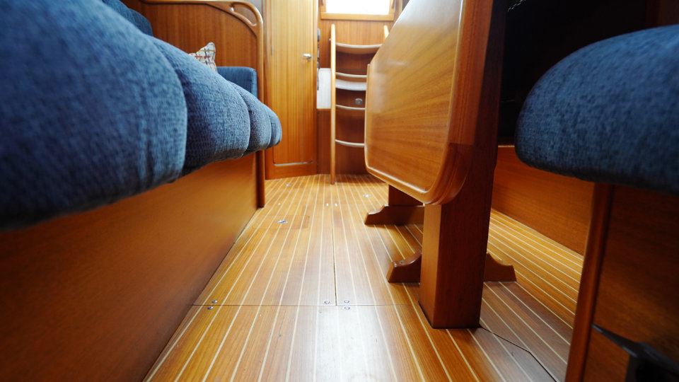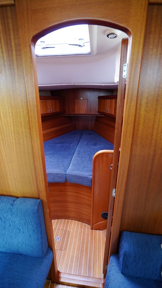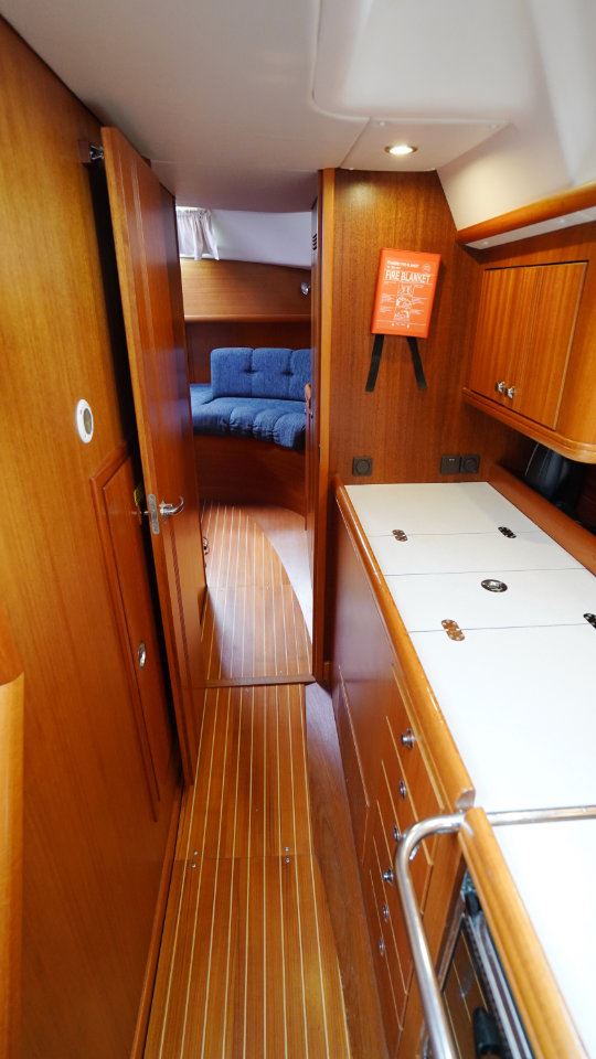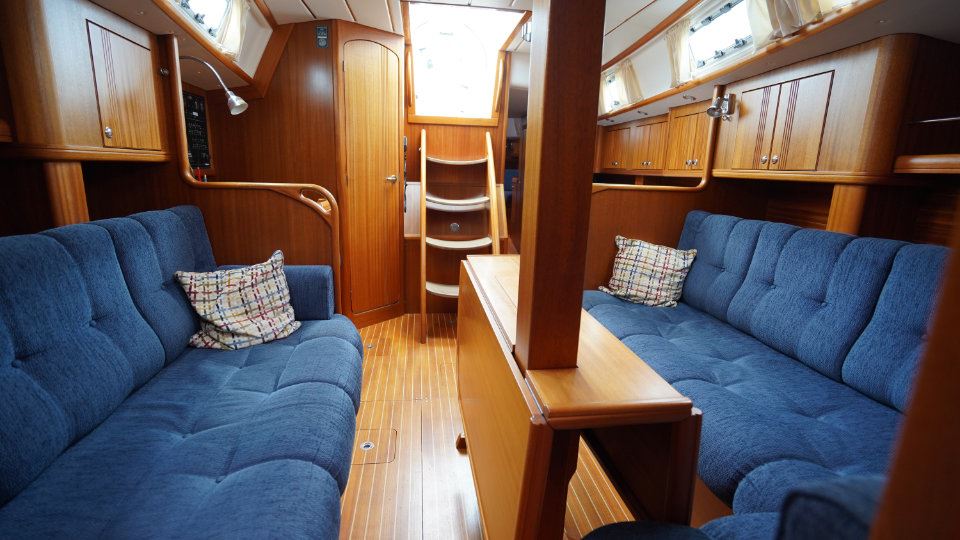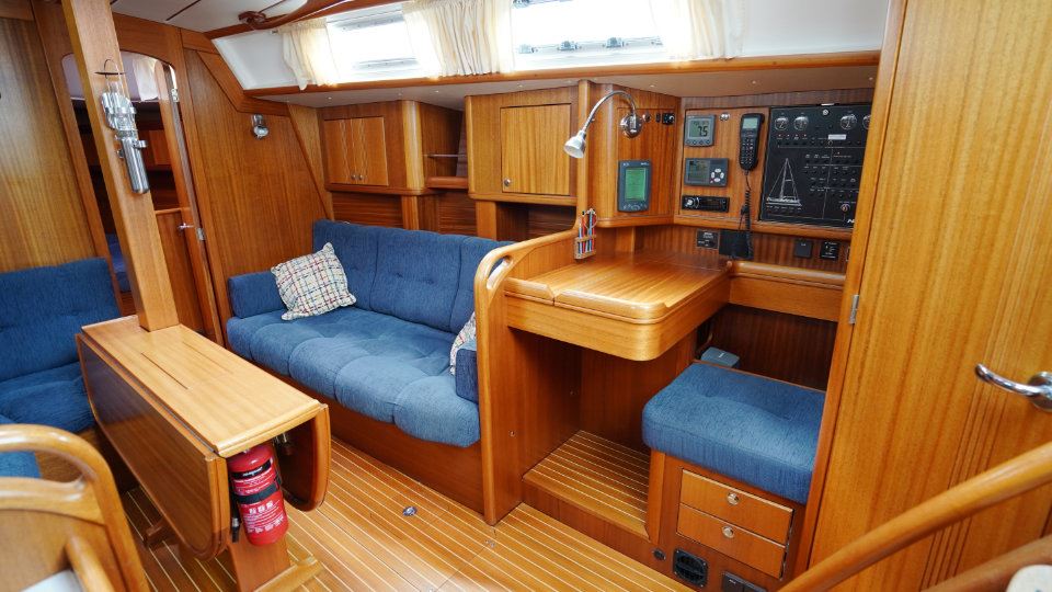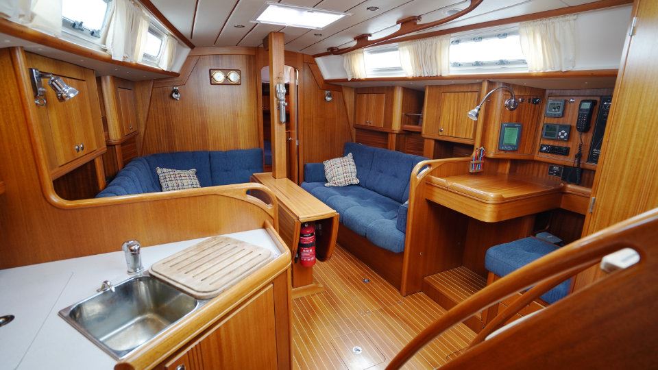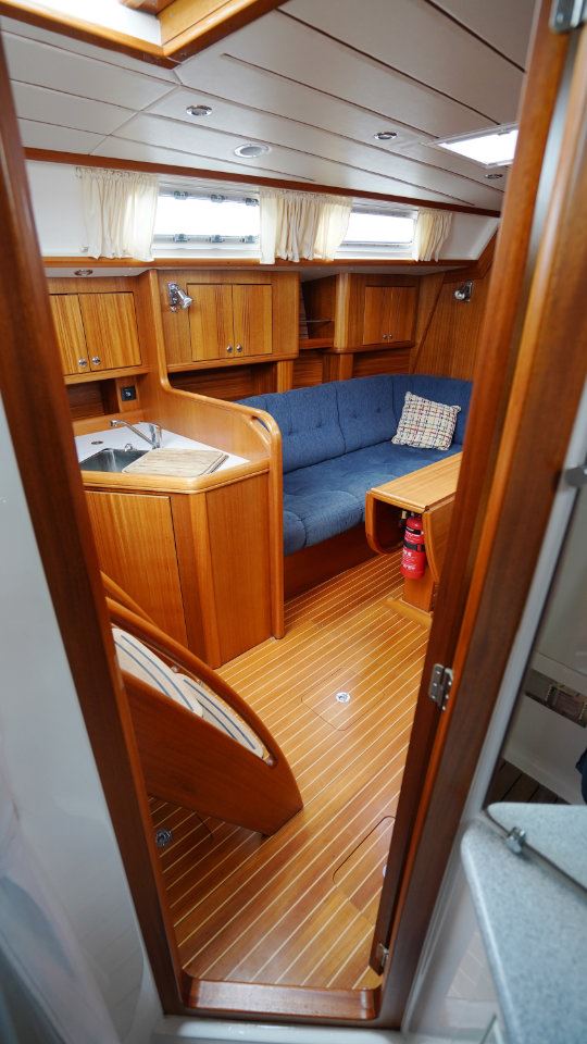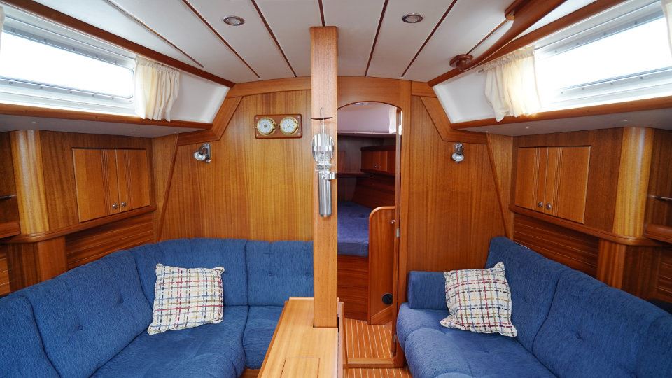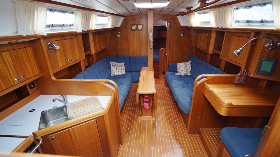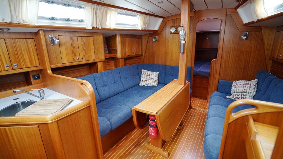 Direkt i anslutning till nedgångstrappan finns navigationsplats, toalett med dusch och längsgående kök. Det finns en rymlig akterhytt och en gästhytt i fören, båda med dubbelkojer. Salongen har ett bord med fällbara sidor och två soffor. Inredningen är tillverkad av mattlackerad mahogny.