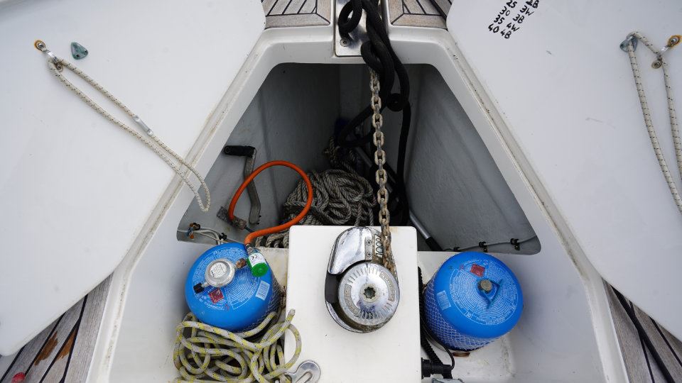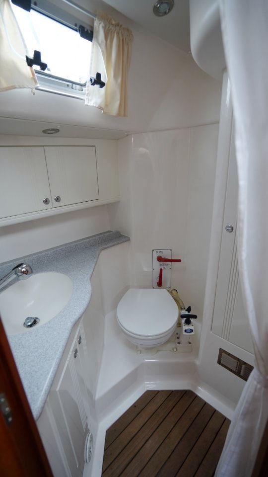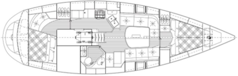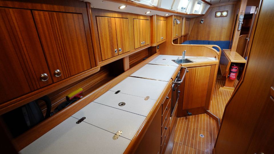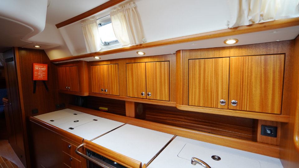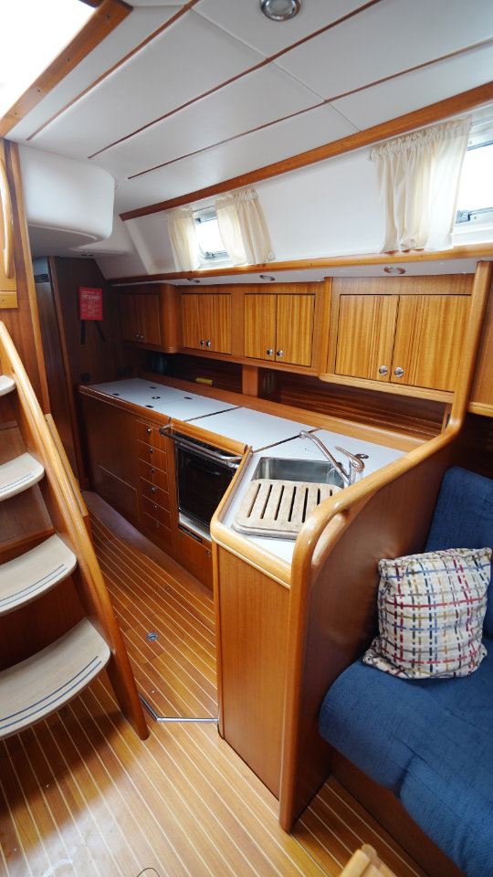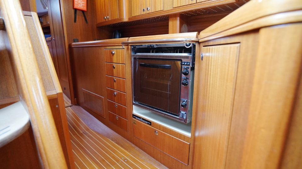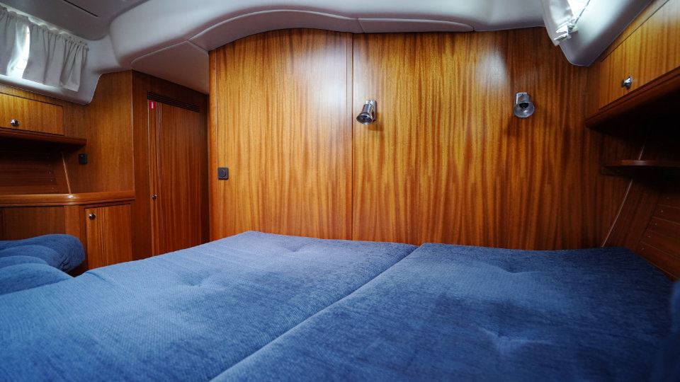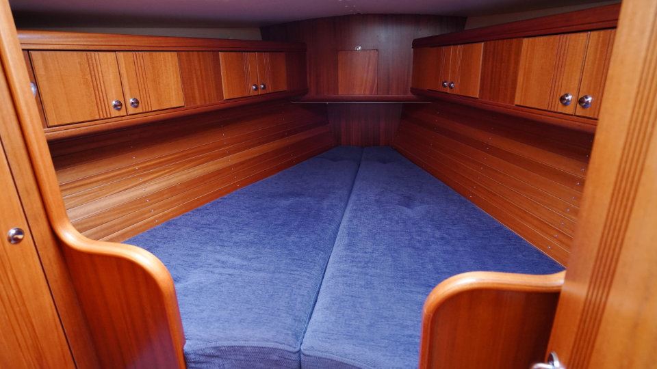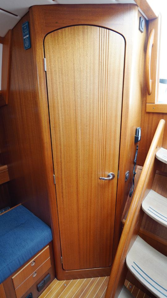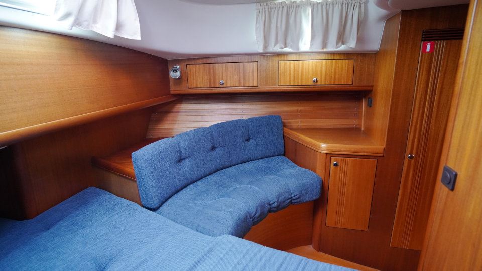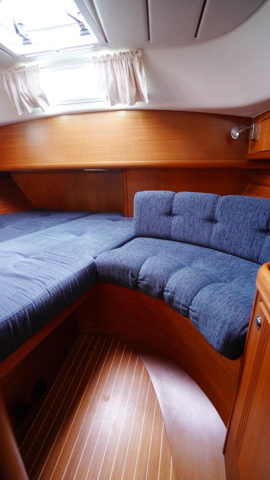 Direkt i anslutning till nedgångstrappan finns navigationsplats, toalett med dusch och längsgående kök. Det finns en rymlig akterhytt och en gästhytt i fören, båda med dubbelkojer. Salongen har ett bord med fällbara sidor och två soffor. Inredningen är tillverkad av mattlackerad mahogny.