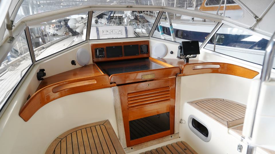 Skrovet är kraftigt och tryggt, med en form som ger både stabilitet och fart under segel. Den centrala sittbrunnen är djup, skyddad och utrustad med en fast vindruta, vilket ger en känsla av säkerhet även i grov sjö. Härifrån har rorsmannen god sikt och nära till vinschar och skot.