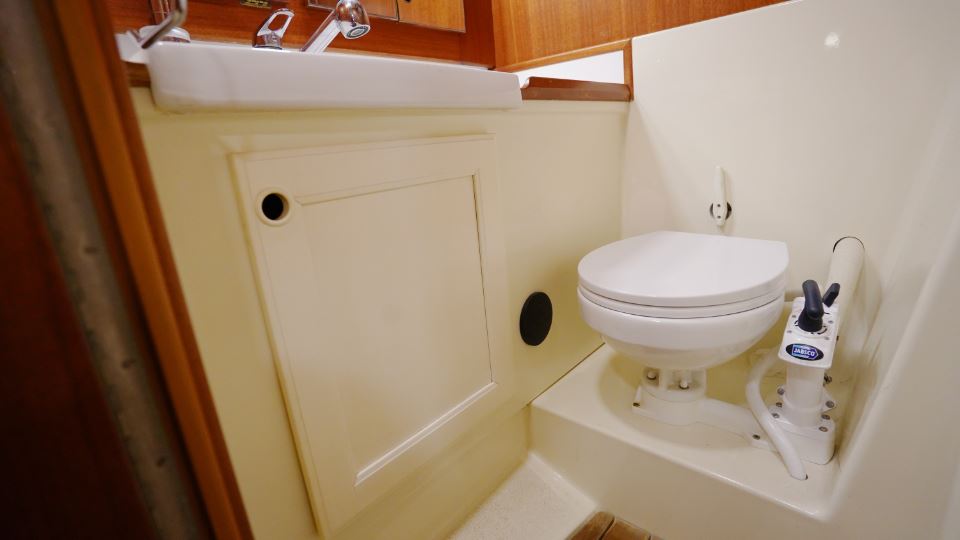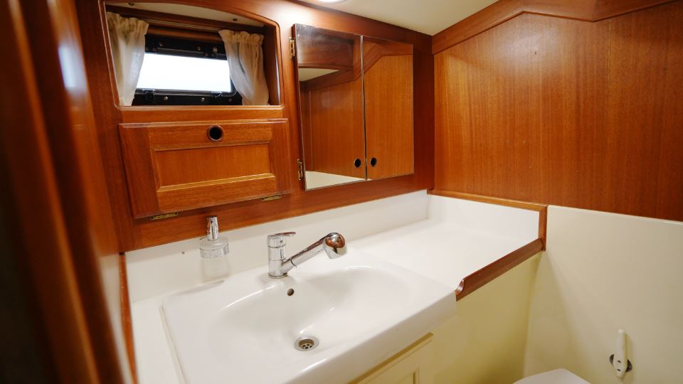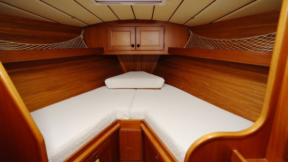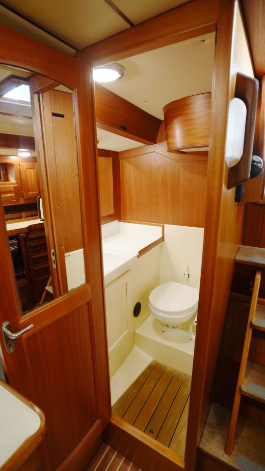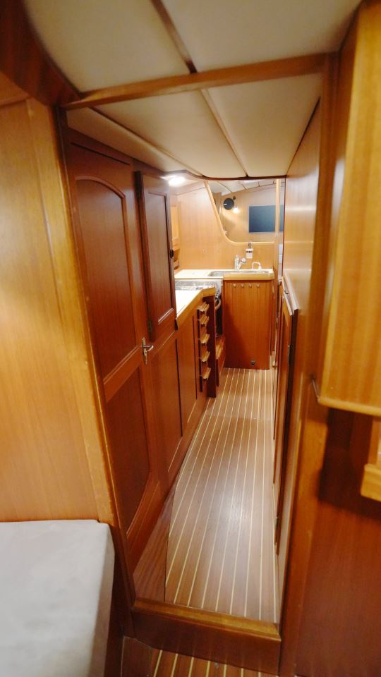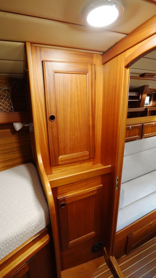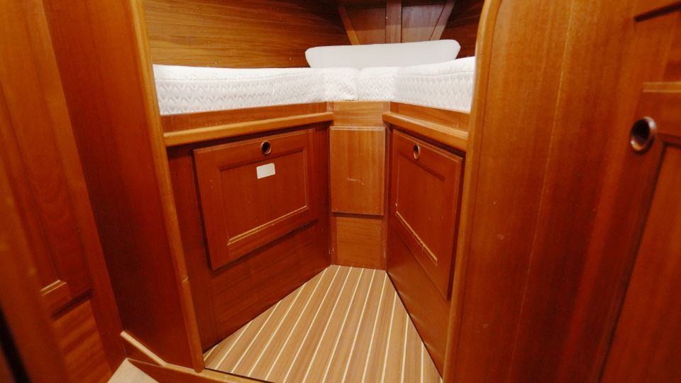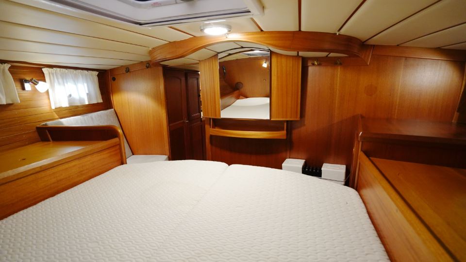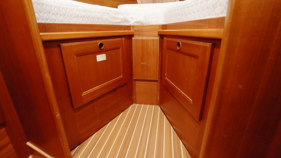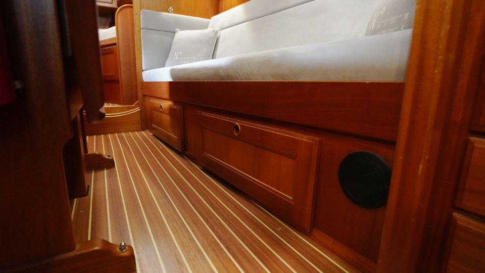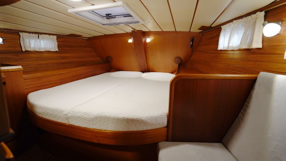 Akterut finns den generösa ägarkabinen. Här finns en dubbelkoj, gott om skåp och hyllor samt en känsla av avskildhet. För om salongen ligger förpiken med en bekväm V-kojer som med iläggsskiva blir en dubbelkoj och bra förvaringsplats, vilket gör den idealisk för gäster eller familjemedlemmar. I anslutning till nedgångstrappan finns toalett med dusch samt navigationsplats.