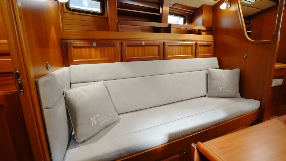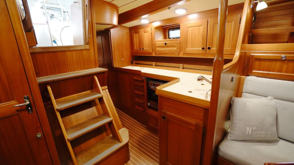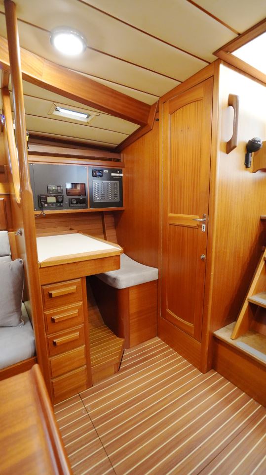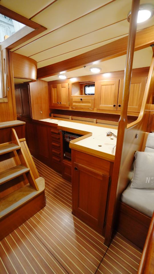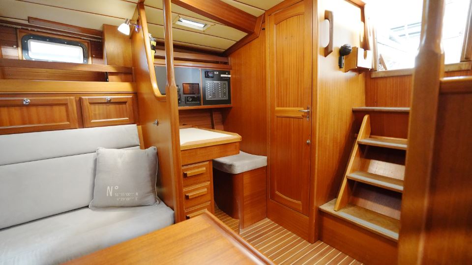 Under däck möts man av den klassiska Najad-atmosfären – varm, inbjudande och präglad av vackert hantverk i mahogny. Salongen är hjärtat i båten, med två soffor, som också kan fungera som kojer samt ett elegant salongsbord. Här finns god plats för långa kvällar med samtal, läsning och planering av nästa etapp.