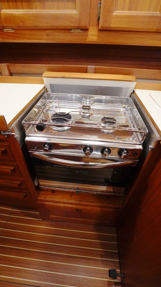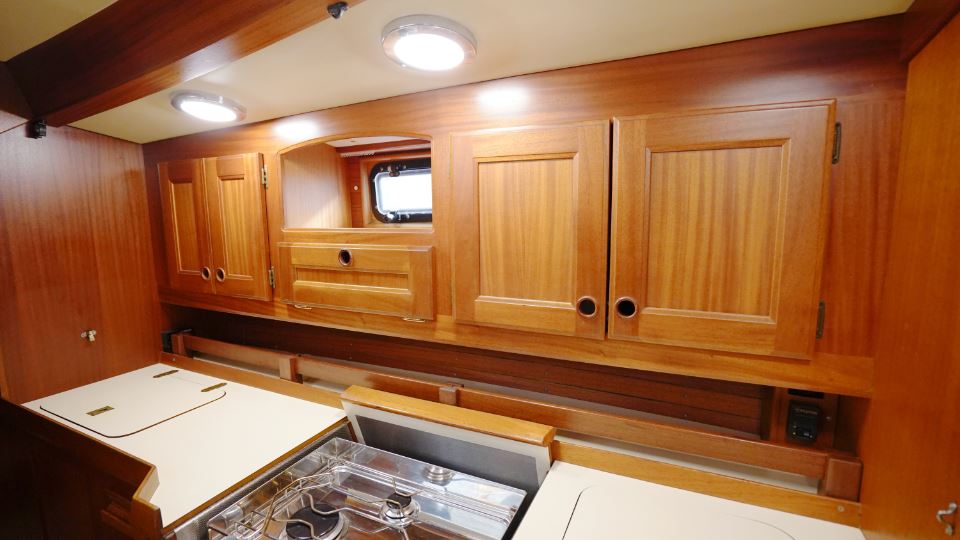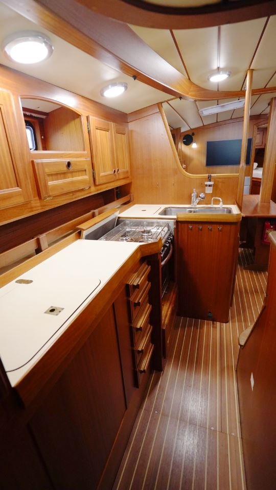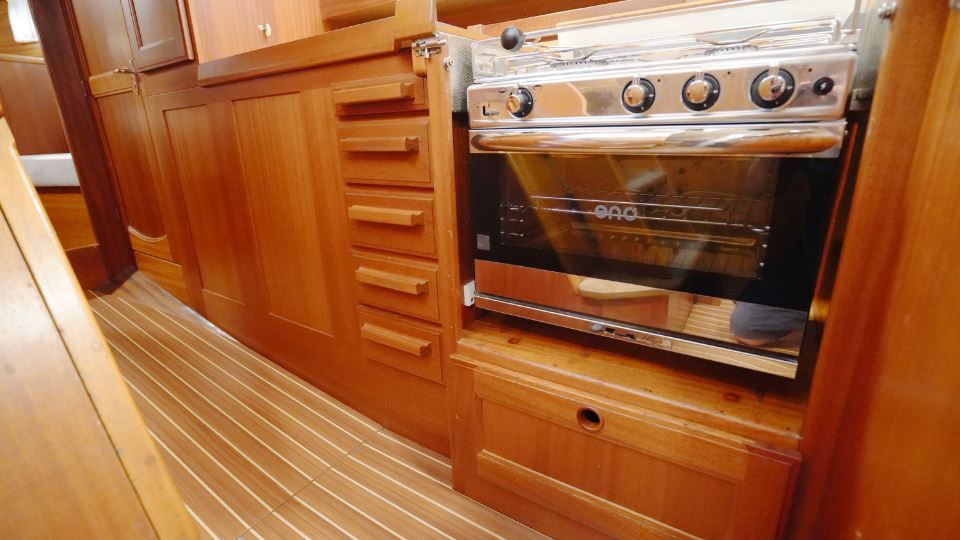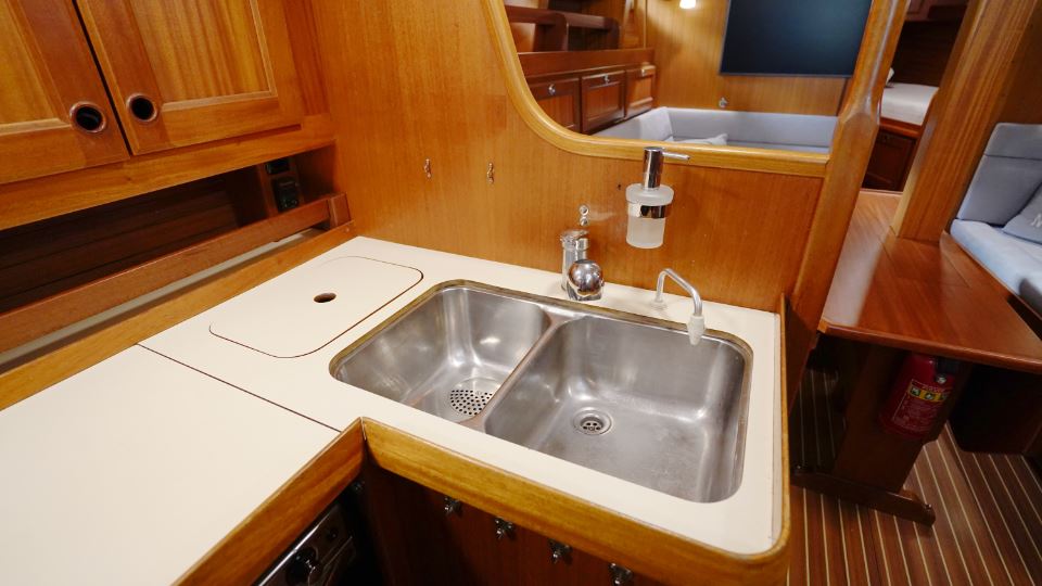 Pentryt är utformat med praktisk funktion i åtanke och ligger i passage mot aktern. Layouten gör att man står stadigt även under gång och alla ytor är utformade för att klara längre vistelser till havs. Det finns gott om stuvutrymmen, dubbla hoar och rejält arbetsutrymme – allt utfört med den typiska Orustprecisionen.