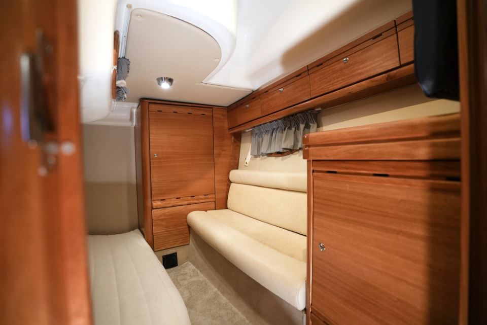 Sittbrunnen fungerar som båtens samlingspunkt, med teakdurk, bred badplattform och en sittgrupp i aktern som skapar en trivsam och social mötespunkt med bra accerss till vattnet. Under däck möts man av en ljus och rymlig salong med pentry, toalett och rymlig förpik. Akterut finns en enskild akterkabin med bred dubbelkoj och separat garderob och soffa. Layouten gör längre vistelser ombord möjliga och bekväma trots sin storlek.
