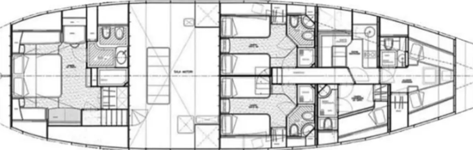 Interiören erbjuder en ”ägarhytt” akterut och en VIP-gästhytt föröver, båda med dubbelkojer. Midskepps finns två gästhytter, båda med 2 enkelkojer. Besättningshytten som finns i främre delen av båten har två enkelkojer. Alla hytter har eget badrum.