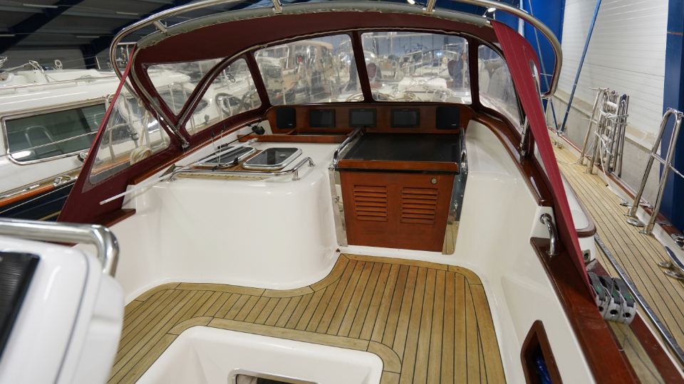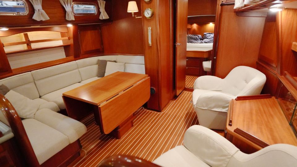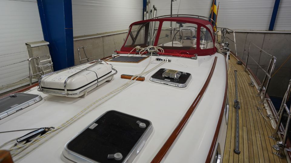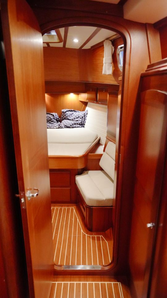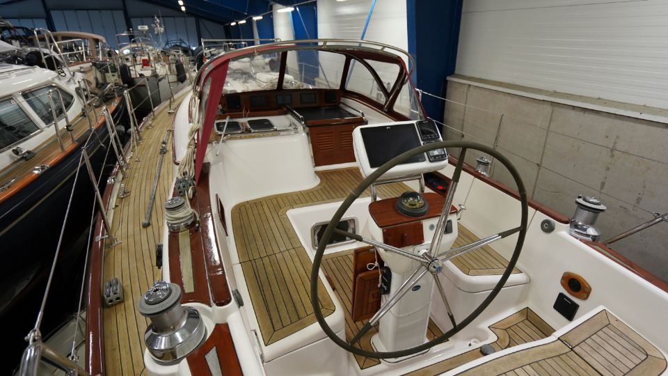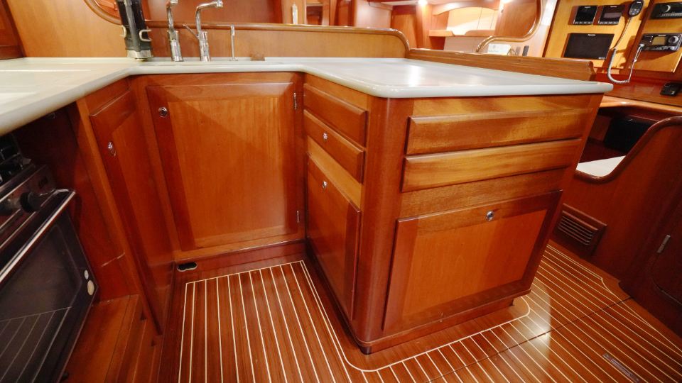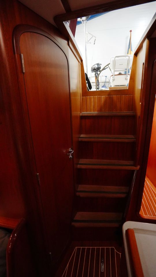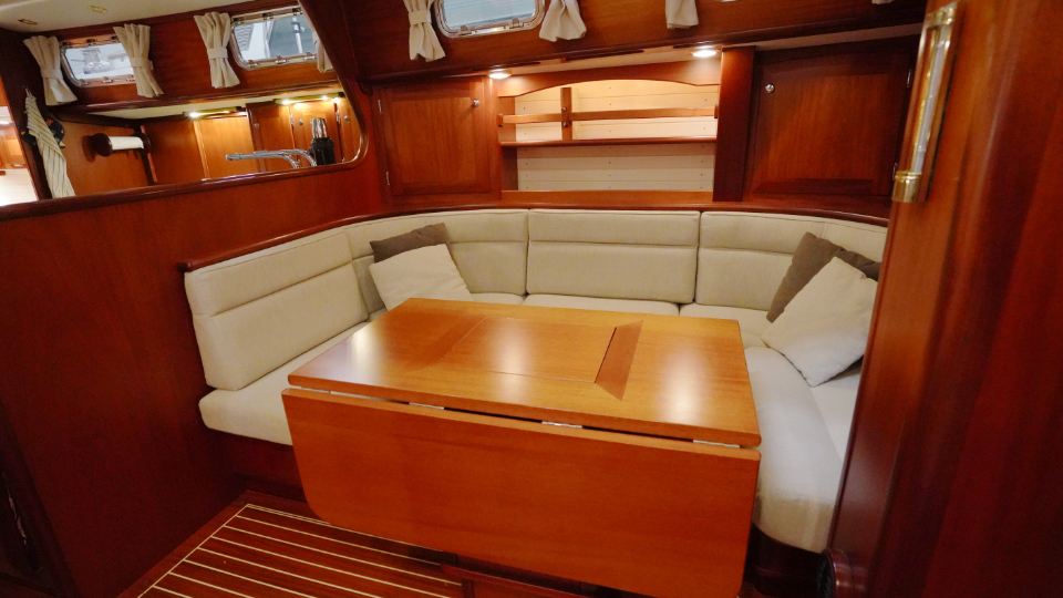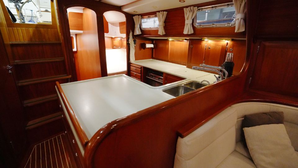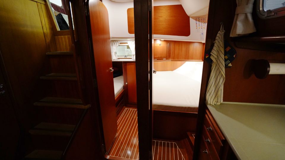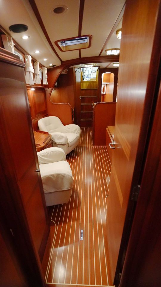 Invändigt erbjuder båten en välplanerad och funktionell layout. Förut finns en rymlig ägarkabin med bred dubbelkoj, gott om förvaring samt egen toalett med dusch. Akterut finns två gästkabiner med dubbelkojer. Direkt till babord om nedgången ligger ett stort och välutrustat pentry med generösa arbetsytor och goda förvaringsmöjligheter, anpassat för att fungera även i sjögång. Till styrbord finns en toalett med dusch samt en praktisk navigationsplats. Salongen är ljus och inbjudande med en stor C-formad soffa, ett rejält salongsbord, två bekväma fåtöljer samt gott om skåp och bokhyllor. Inredningen i teak ger en varm och gedigen känsla.