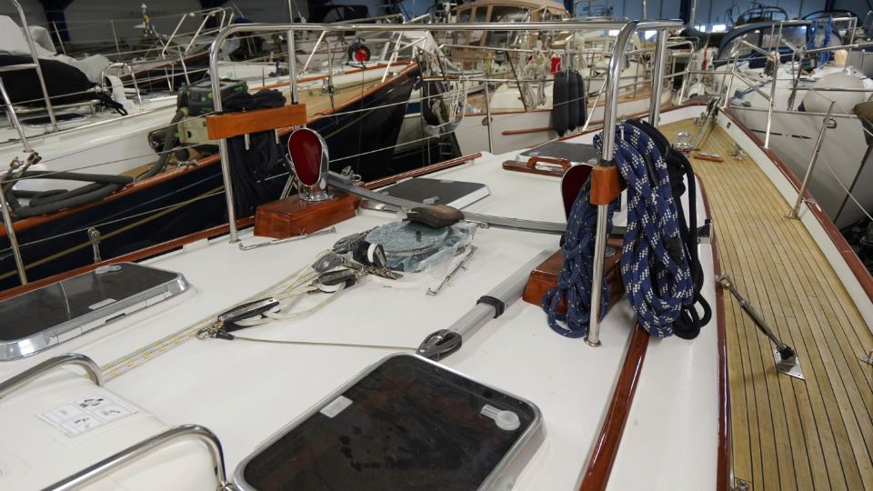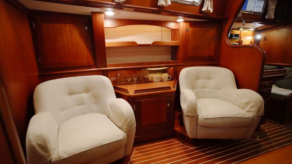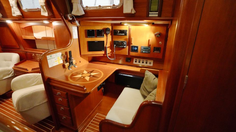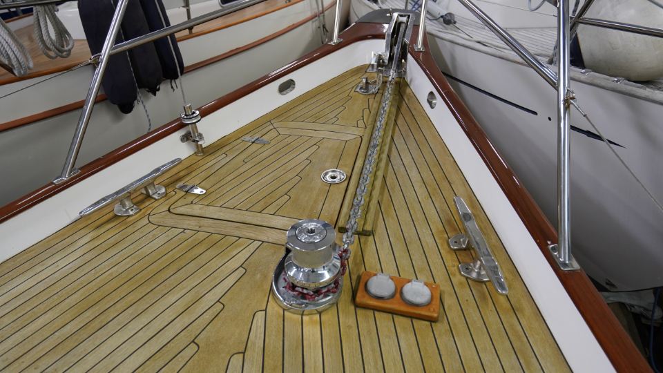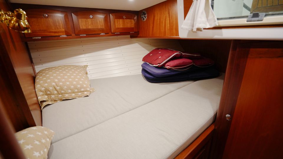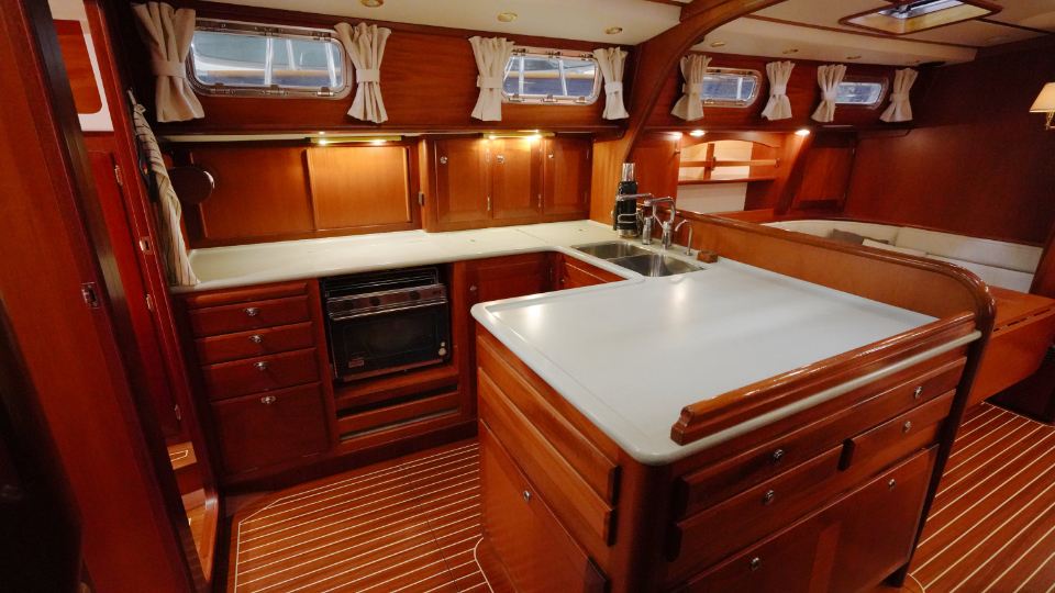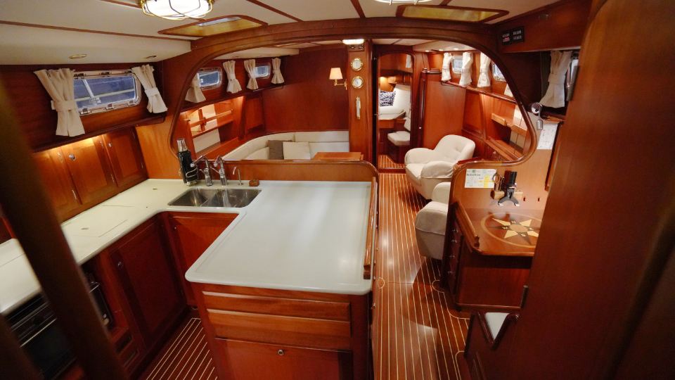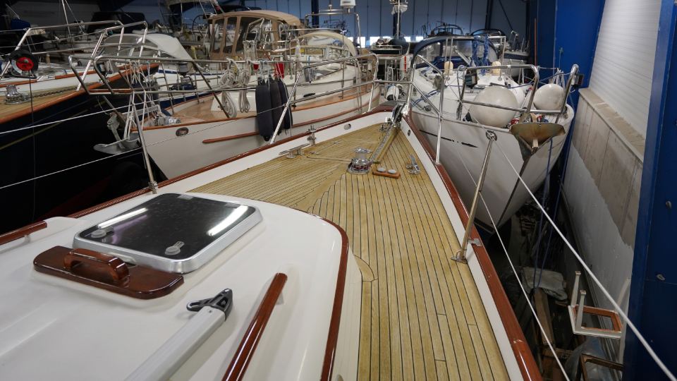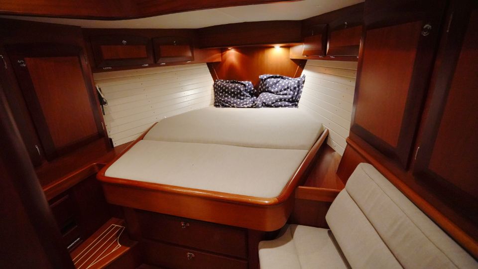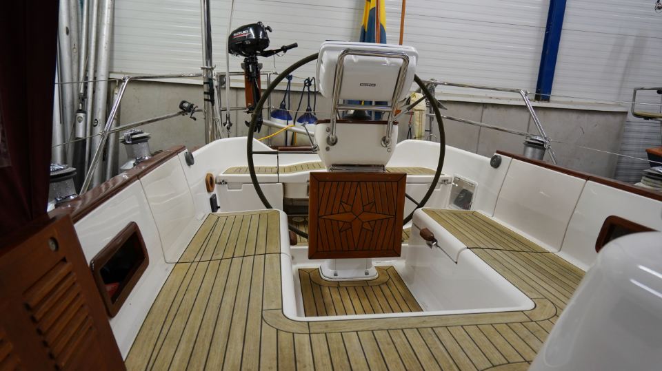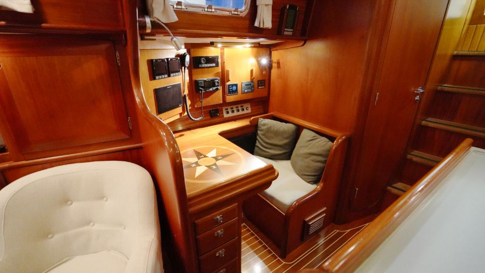 Invändigt erbjuder båten en välplanerad och funktionell layout. Förut finns en rymlig ägarkabin med bred dubbelkoj, gott om förvaring samt egen toalett med dusch. Akterut finns två gästkabiner med dubbelkojer. Direkt till babord om nedgången ligger ett stort och välutrustat pentry med generösa arbetsytor och goda förvaringsmöjligheter, anpassat för att fungera även i sjögång. Till styrbord finns en toalett med dusch samt en praktisk navigationsplats. Salongen är ljus och inbjudande med en stor C-formad soffa, ett rejält salongsbord, två bekväma fåtöljer samt gott om skåp och bokhyllor. Inredningen i teak ger en varm och gedigen känsla.
