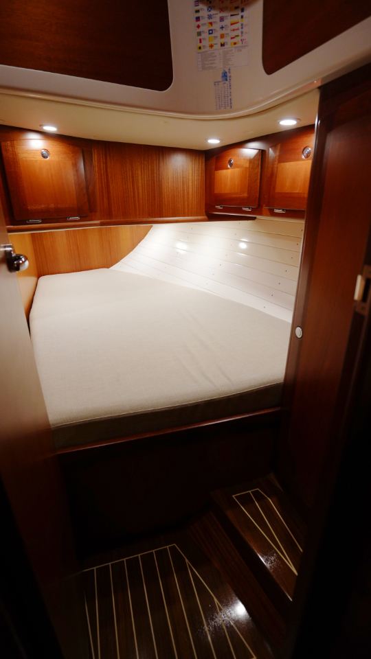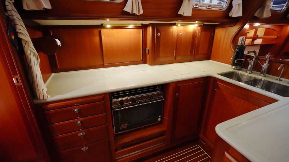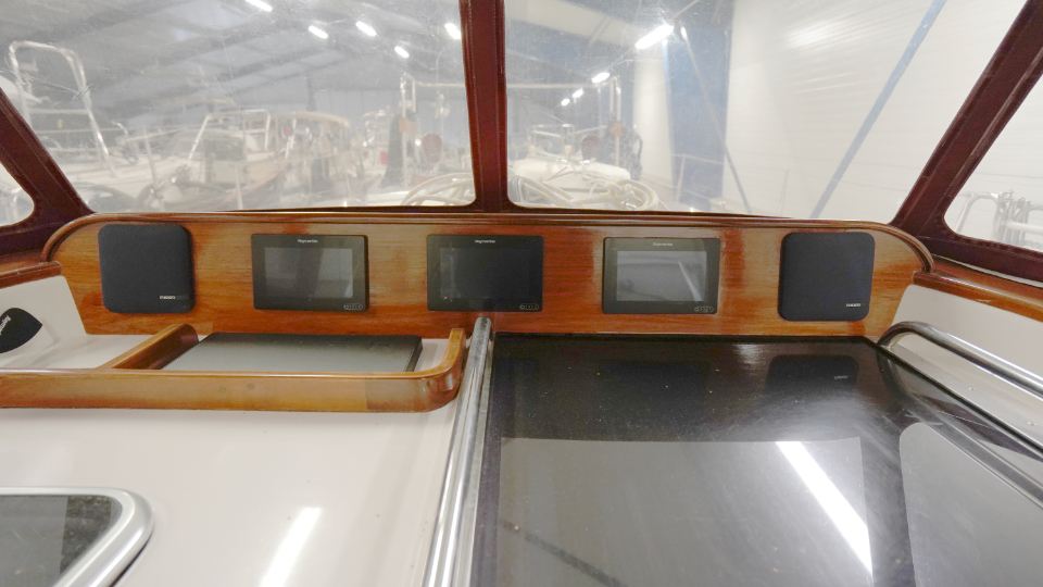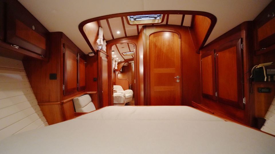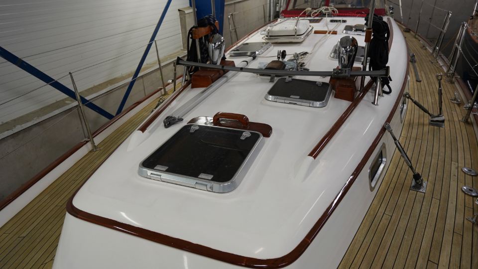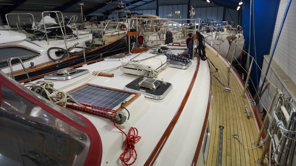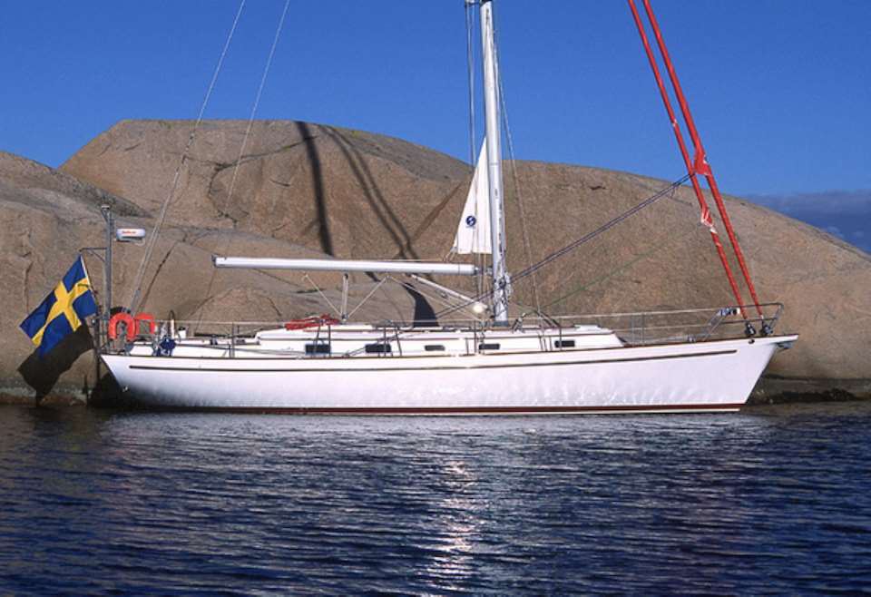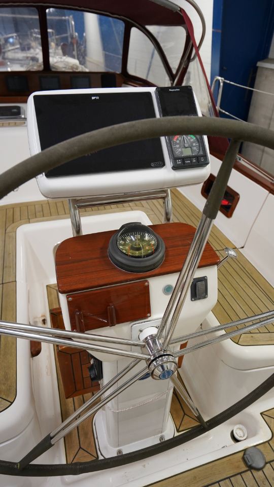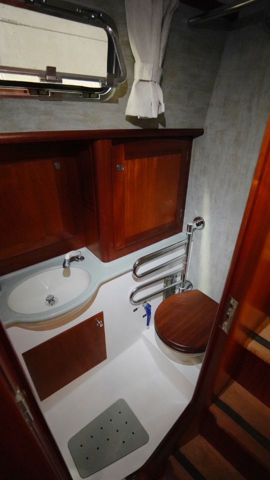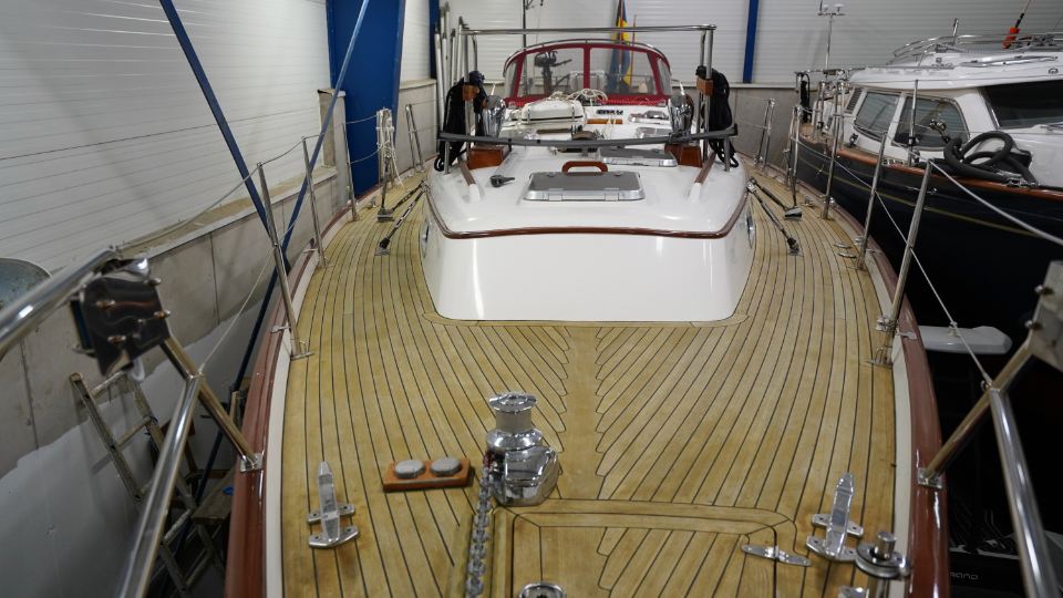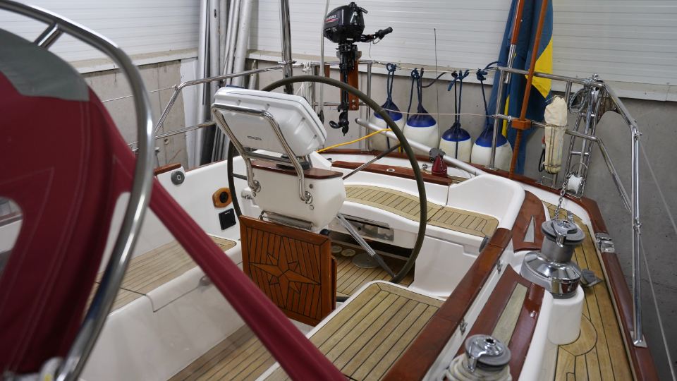 Invändigt erbjuder båten en välplanerad och funktionell layout. Förut finns en rymlig ägarkabin med bred dubbelkoj, gott om förvaring samt egen toalett med dusch. Akterut finns två gästkabiner med dubbelkojer. Direkt till babord om nedgången ligger ett stort och välutrustat pentry med generösa arbetsytor och goda förvaringsmöjligheter, anpassat för att fungera även i sjögång. Till styrbord finns en toalett med dusch samt en praktisk navigationsplats. Salongen är ljus och inbjudande med en stor C-formad soffa, ett rejält salongsbord, två bekväma fåtöljer samt gott om skåp och bokhyllor. Inredningen i teak ger en varm och gedigen känsla.