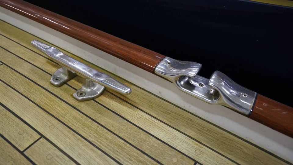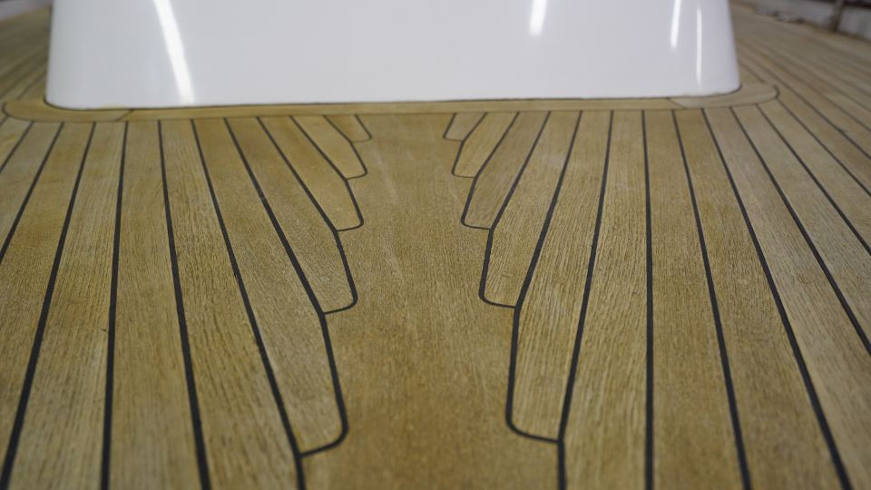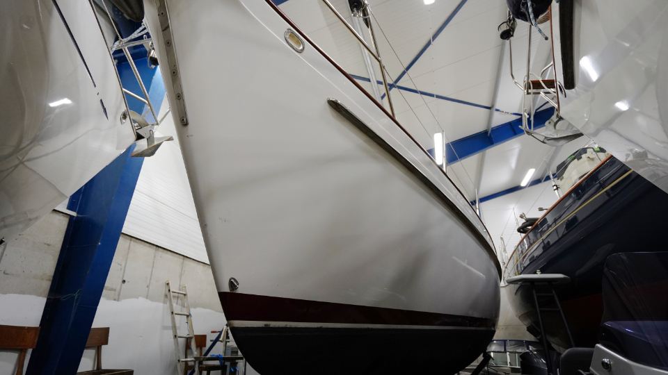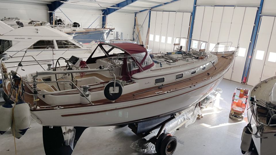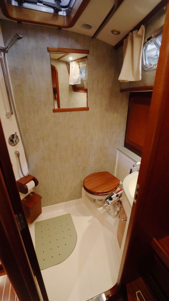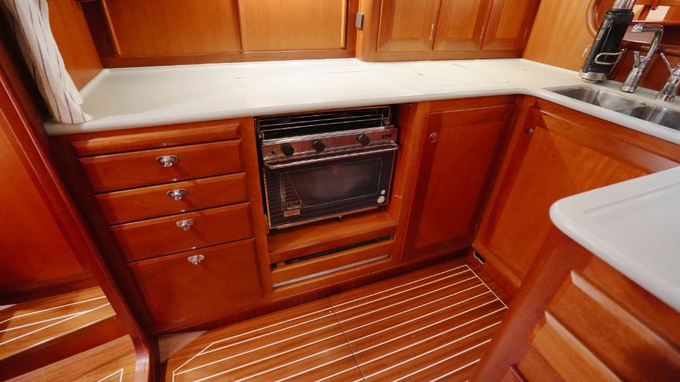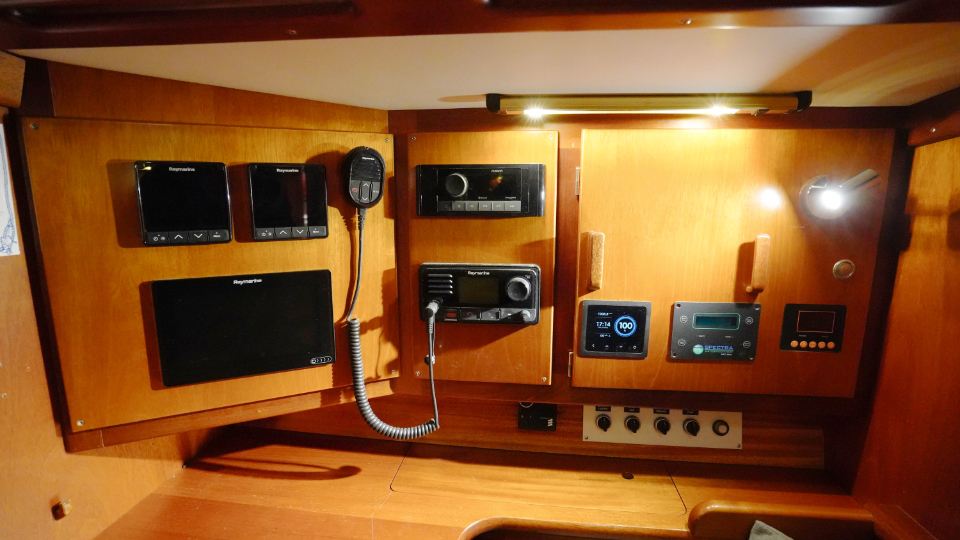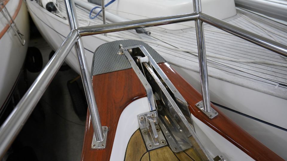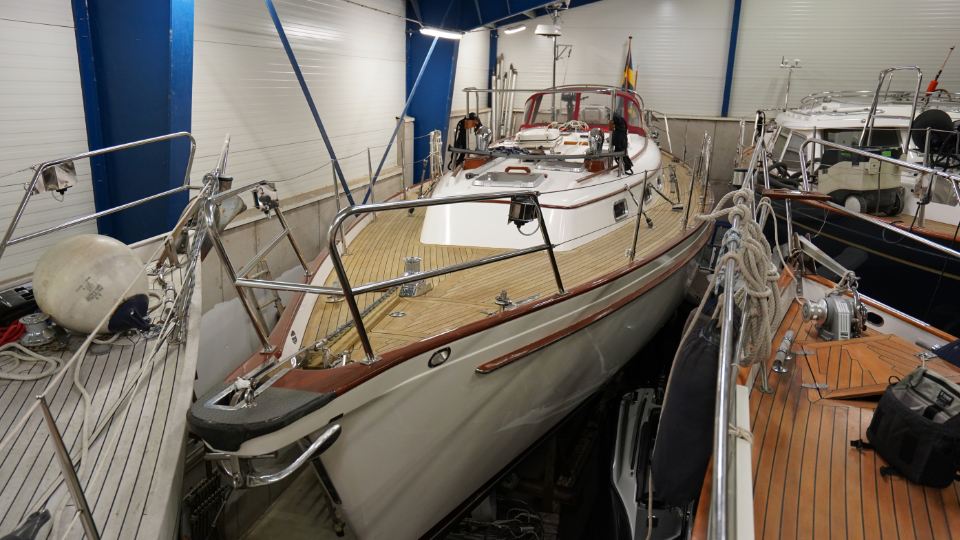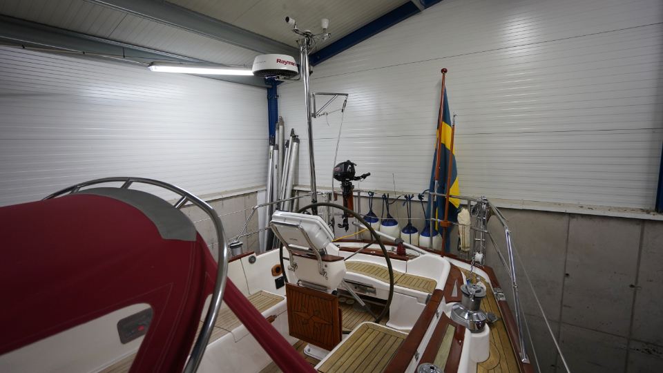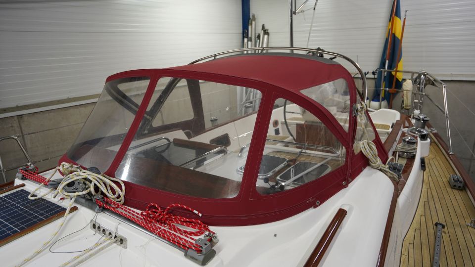 Invändigt erbjuder båten en välplanerad och funktionell layout. Förut finns en rymlig ägarkabin med bred dubbelkoj, gott om förvaring samt egen toalett med dusch. Akterut finns två gästkabiner med dubbelkojer. Direkt till babord om nedgången ligger ett stort och välutrustat pentry med generösa arbetsytor och goda förvaringsmöjligheter, anpassat för att fungera även i sjögång. Till styrbord finns en toalett med dusch samt en praktisk navigationsplats. Salongen är ljus och inbjudande med en stor C-formad soffa, ett rejält salongsbord, två bekväma fåtöljer samt gott om skåp och bokhyllor. Inredningen i teak ger en varm och gedigen känsla.