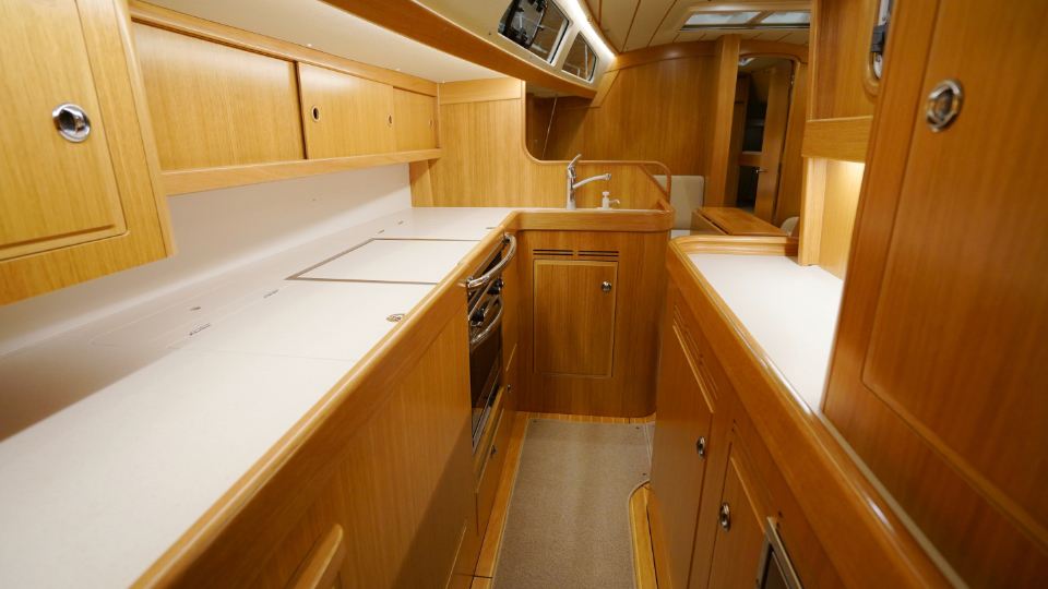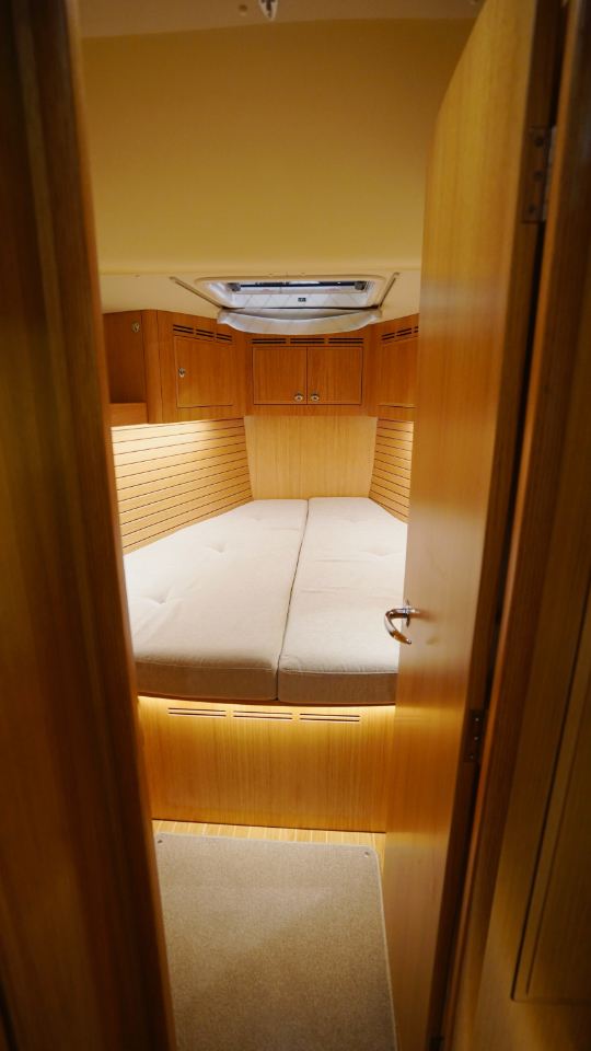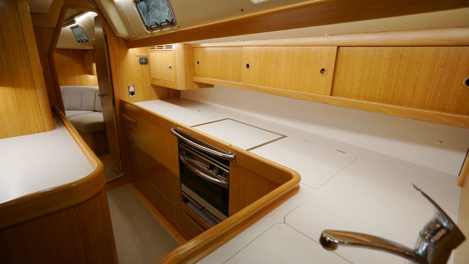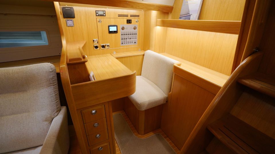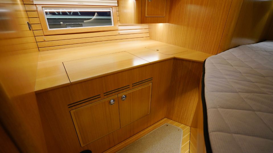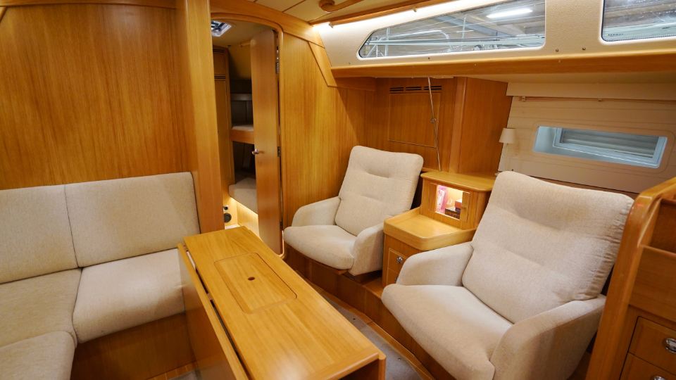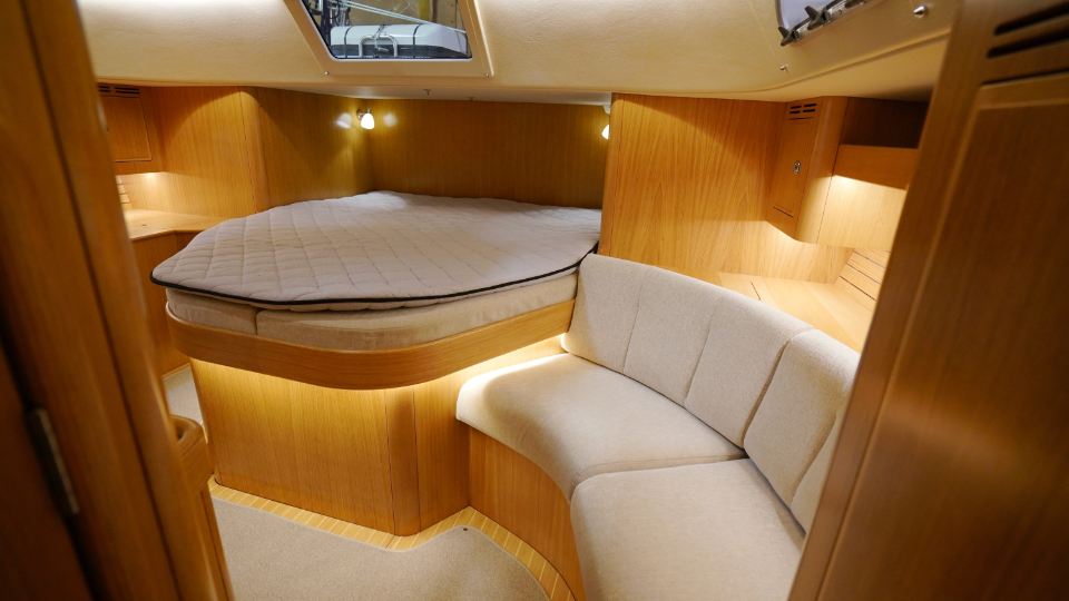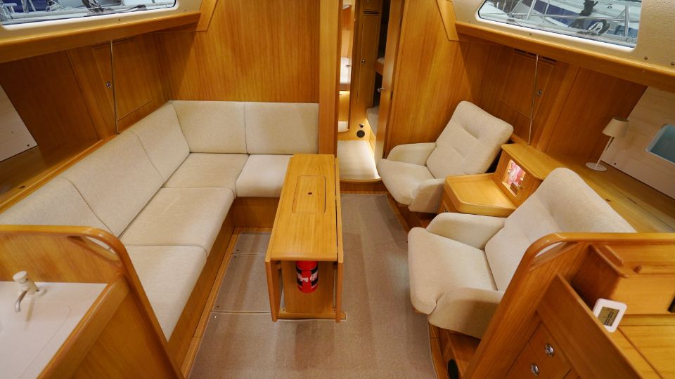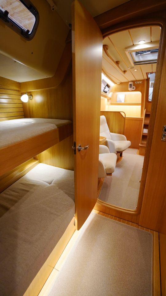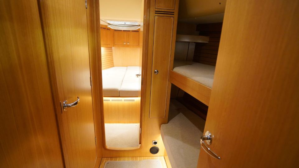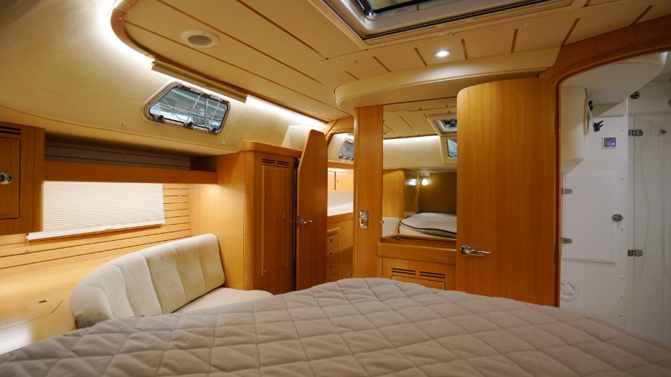 Interiören, utförd i europeisk ek, omfattar en ägarkabin akterut med en centrerad dubbelkoj samt eget badrum med dusch. Layouten inkluderar även ett längsgående pentry, en navigationsplats lättillgänglig vid nedgången samt en rymlig salong med en soffa och två fåtöljer. Föröver finns ytterligare två kabiner, en med V-koj och en med våningskojer, samt ett extra badrum med dusch.