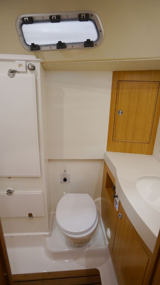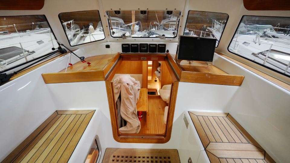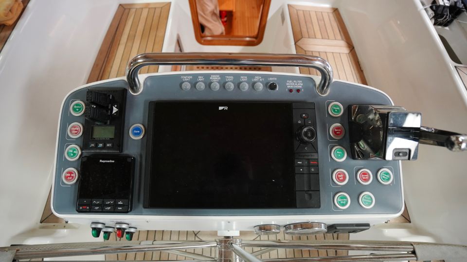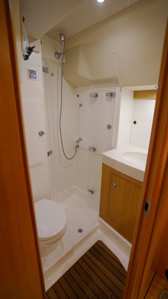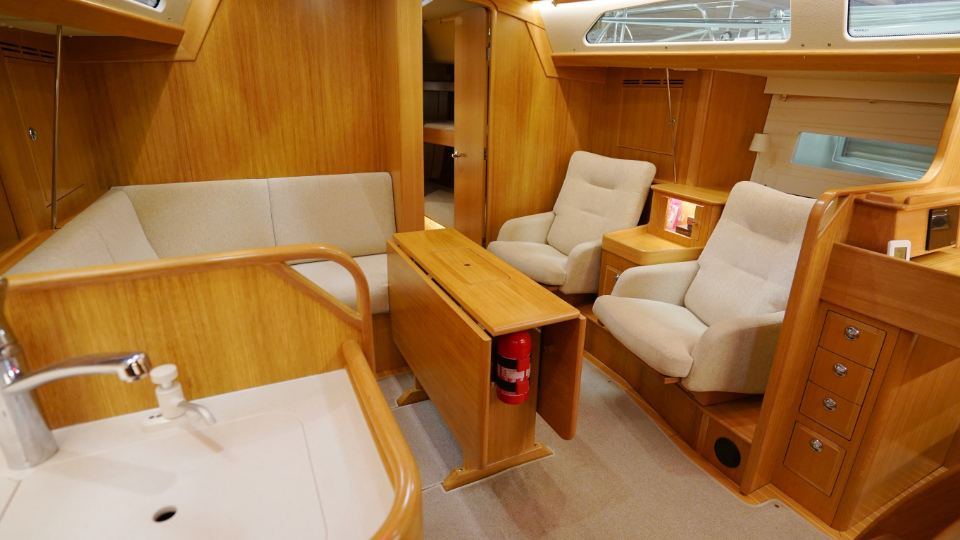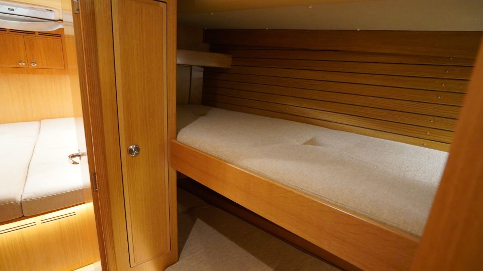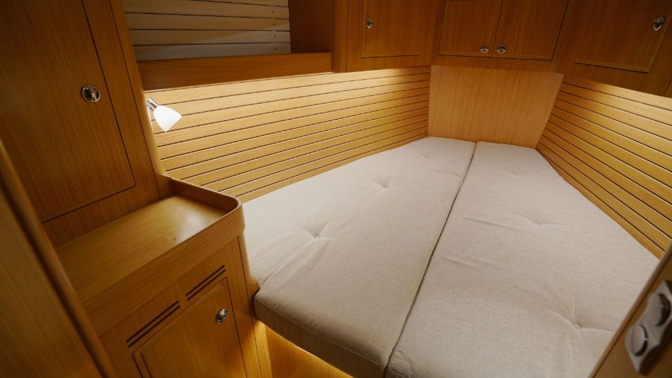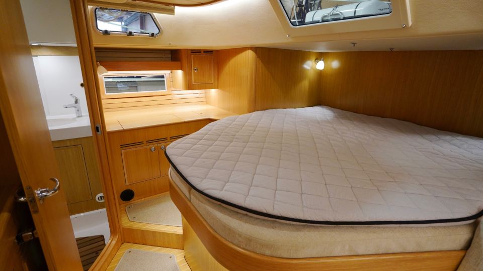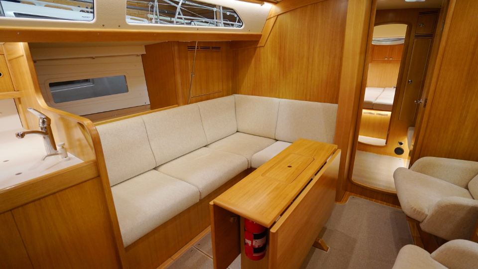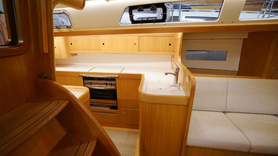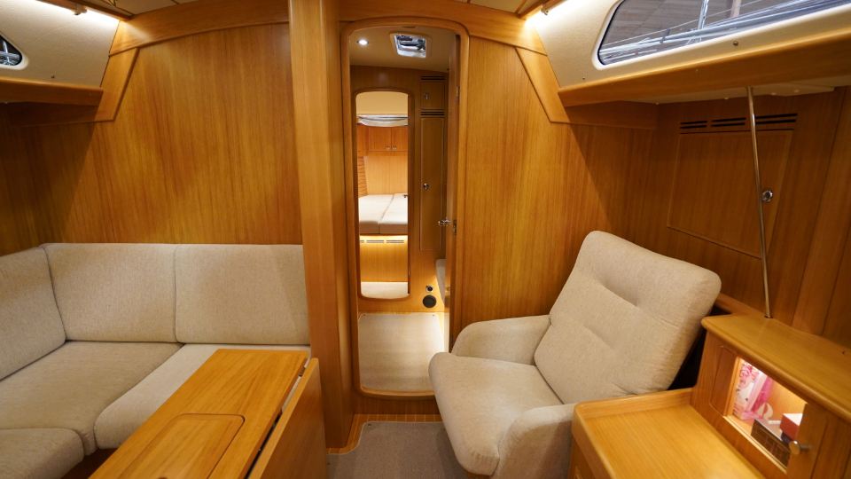 Interiören, utförd i europeisk ek, omfattar en ägarkabin akterut med en centrerad dubbelkoj samt eget badrum med dusch. Layouten inkluderar även ett längsgående pentry, en navigationsplats lättillgänglig vid nedgången samt en rymlig salong med en soffa och två fåtöljer. Föröver finns ytterligare två kabiner, en med V-koj och en med våningskojer, samt ett extra badrum med dusch.
