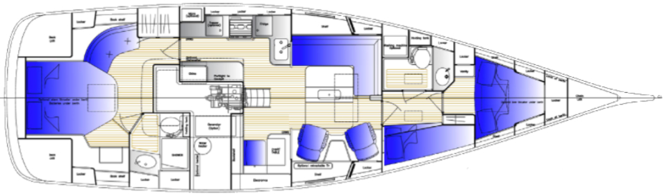 GARBO är utrustad med tre kabiner och sex kojplatser. Den gedigna tekniska utrustningslistan gör henne väl lämpad för oceansegling och längre vistelser ombord.