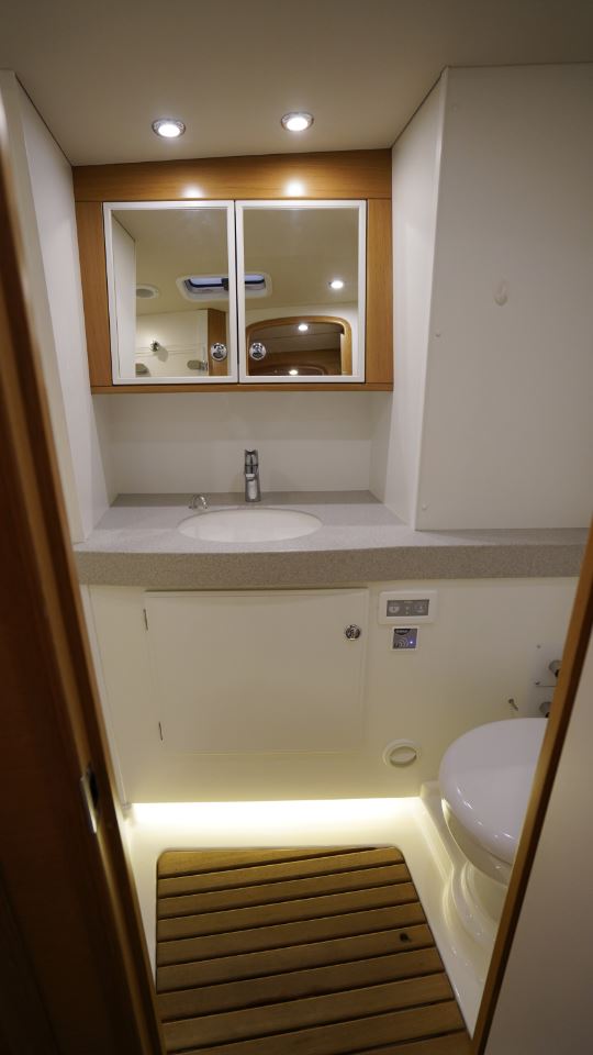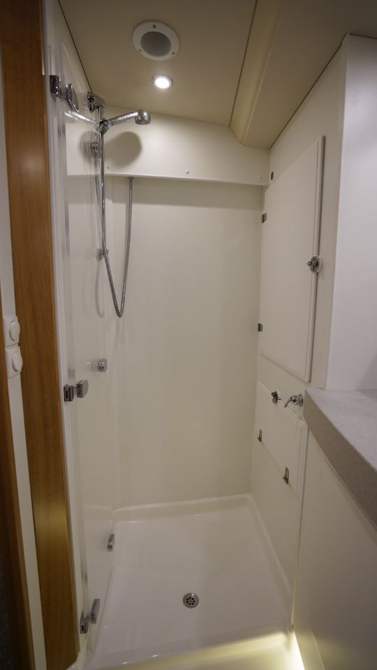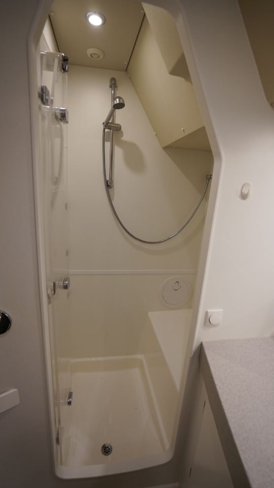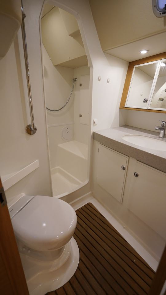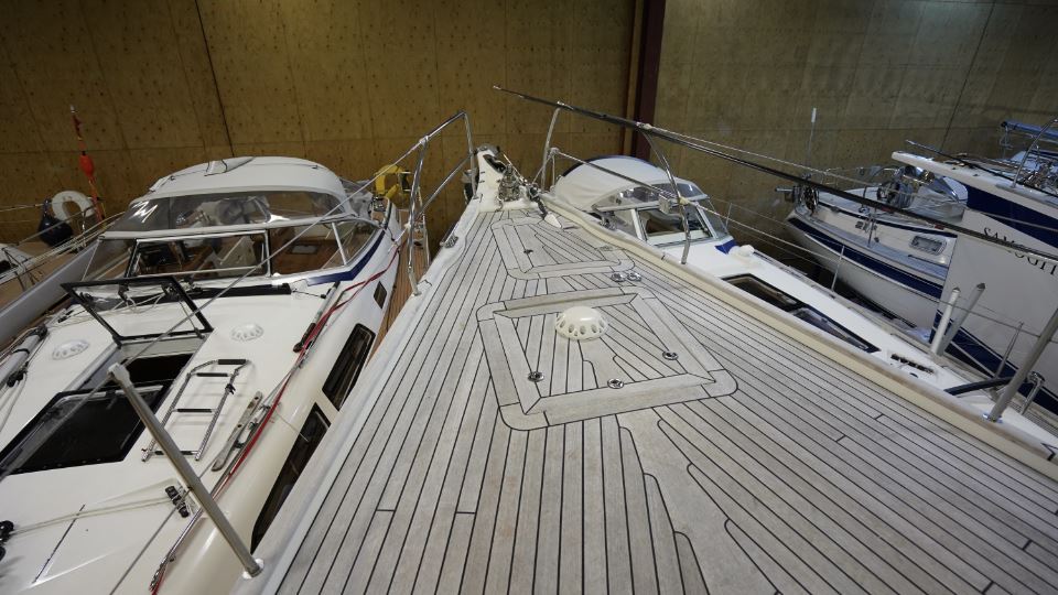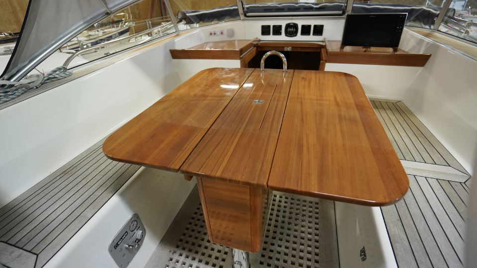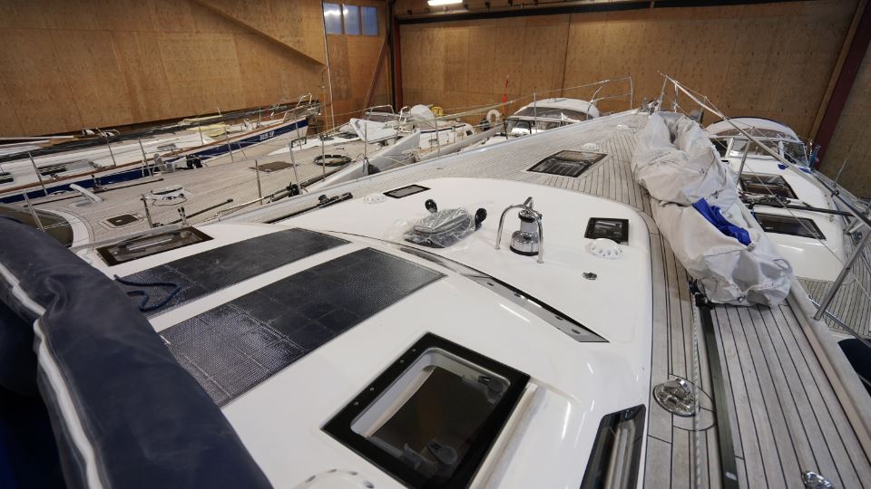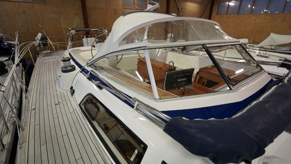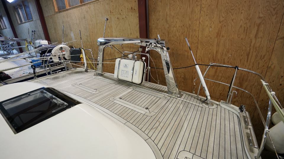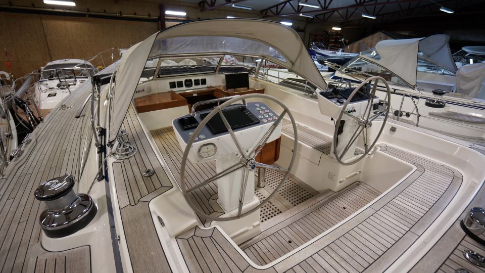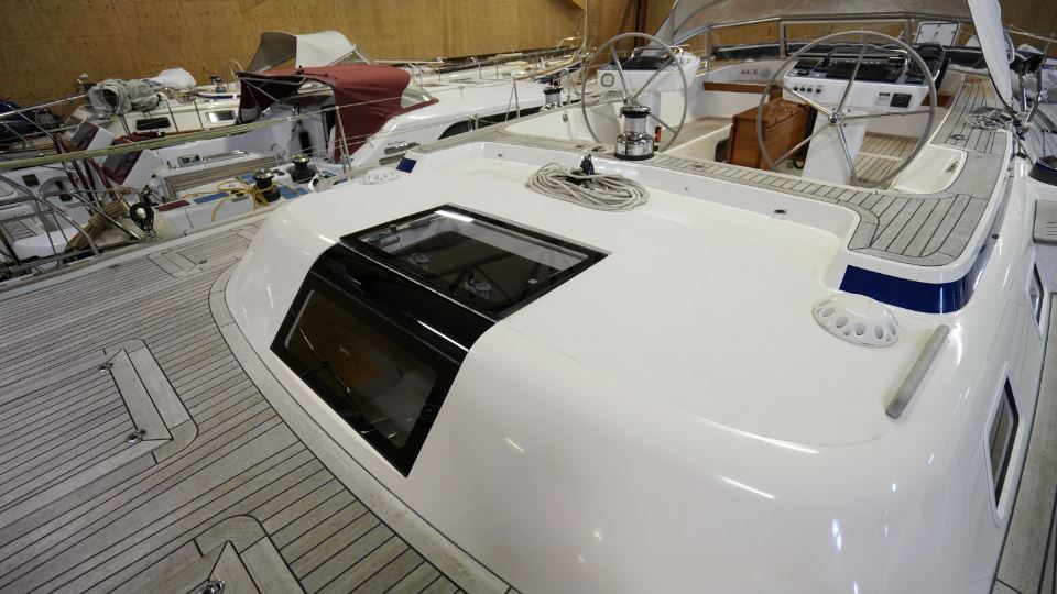På däck erbjuder BLÅ SKVALL en ren och välorganiserad layout med flushmonterade däcksluckor och generösa soldäck, inklusive bimini. Teak är lagd på däck, i sittbrunnen samt på den knappstyrda nedfällbara badplattformen. Förvaringskapaciteten är exceptionell, med cirka 10 000 liter fördelat på ett stort segelstuvfack i fören, ankarlåda, sittbrunnsstuv samt ett rymligt aktergarage. Dubbla rattar och dubbla roder ger exakt kontroll, medan infällbara bog- och akterpropellrar gör manövrering i trånga hamnar enkel. Båten är dessutom utrustad med Dockmate fjärrstyrt manöversystem, vilket gör att du fritt kan röra dig ombord och samtidigt manövrera med precision från för, akter eller längs sidan. Akterut finns elektriska dävertar för säker och enkel sjösättning samt upptagning av jollen.