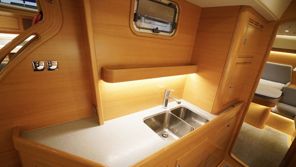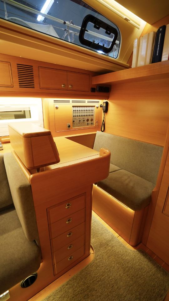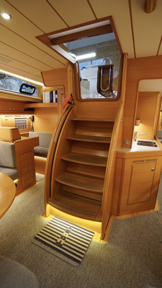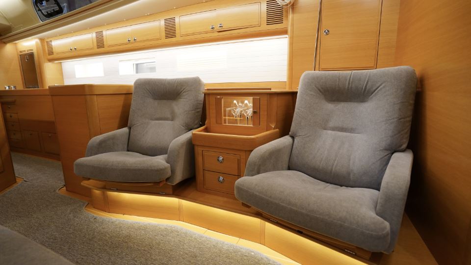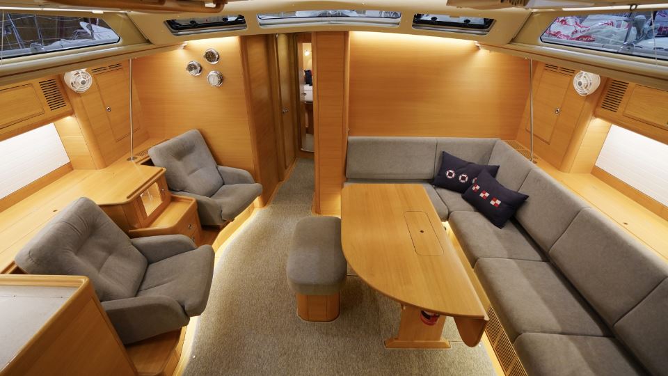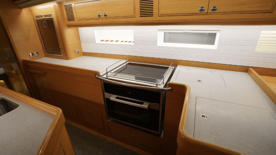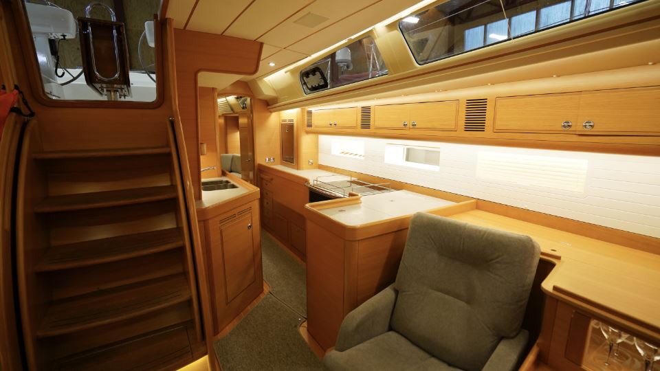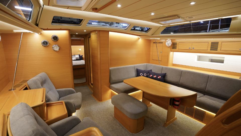 Under däck är interiören utförd i ljus europeisk ek. Salongen erbjuder en L-soffa, två bekväma fåtöljer samt en pall. En infällbar 50-tums TV är diskret integrerad i salongen. Båten har tre hytter med dubbelkojer. Under varma dagar uppskattas luftkonditionering ombord. Pentryt är utformat för långfärdssegling och är välutrustat med Miele induktionsspis med mikrovågsugn, tre toppmatade kyl/frysar samt ytterligare ett frontmatat kylskåp. I aktertoaletten finns tvätt/torkmaskin och båda toaletterna är utrustade med elektriska WC. Watermaker ger ytterligare självständighet under längre seglingar.