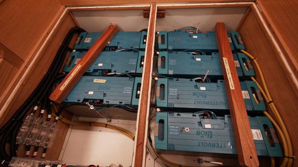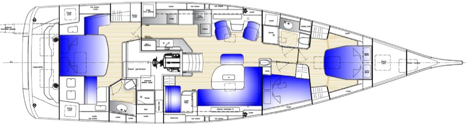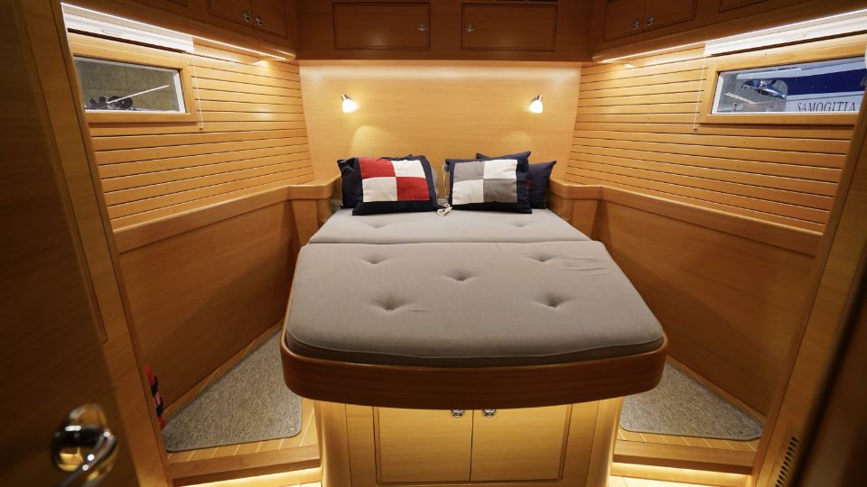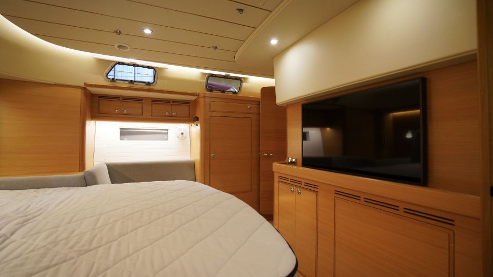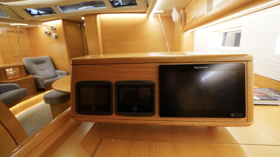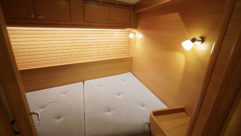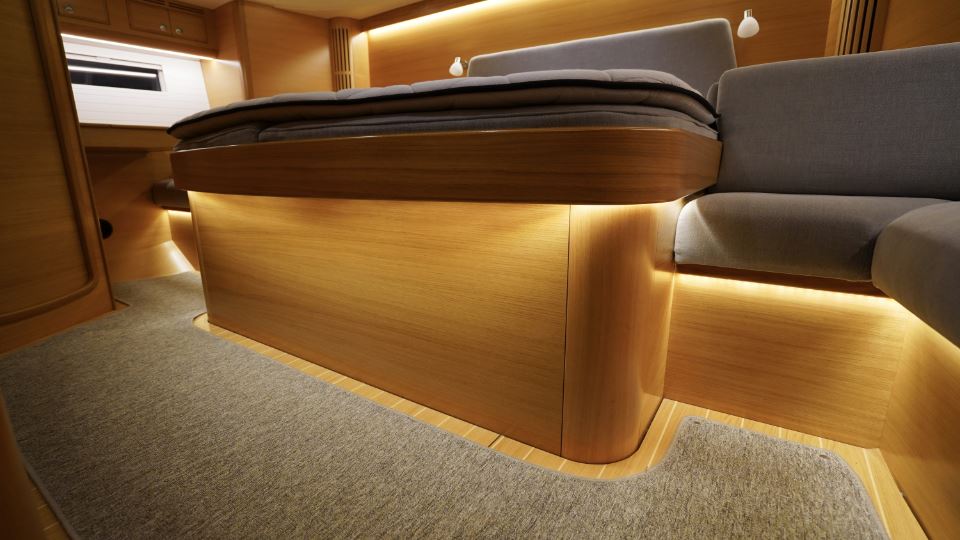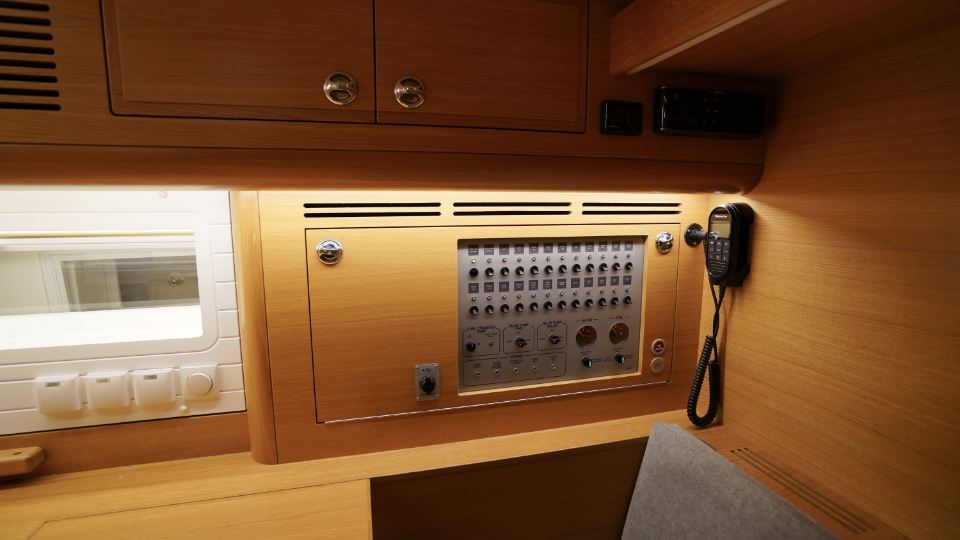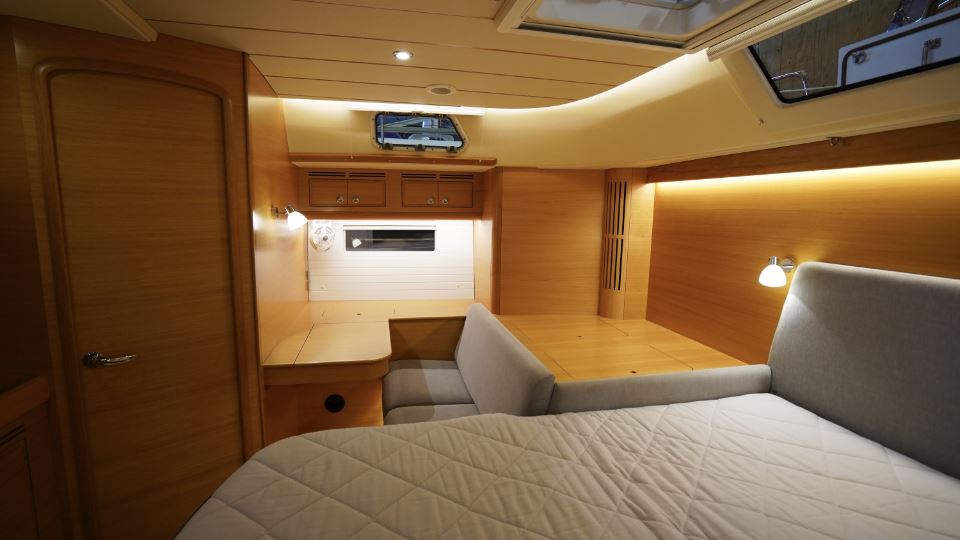 Under däck är interiören utförd i ljus europeisk ek. Salongen erbjuder en L-soffa, två bekväma fåtöljer samt en pall. En infällbar 50-tums TV är diskret integrerad i salongen. Båten har tre hytter med dubbelkojer. Under varma dagar uppskattas luftkonditionering ombord. Pentryt är utformat för långfärdssegling och är välutrustat med Miele induktionsspis med mikrovågsugn, tre toppmatade kyl/frysar samt ytterligare ett frontmatat kylskåp. I aktertoaletten finns tvätt/torkmaskin och båda toaletterna är utrustade med elektriska WC. Watermaker ger ytterligare självständighet under längre seglingar.