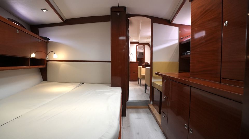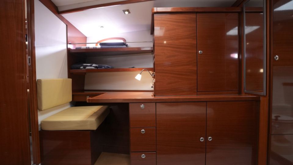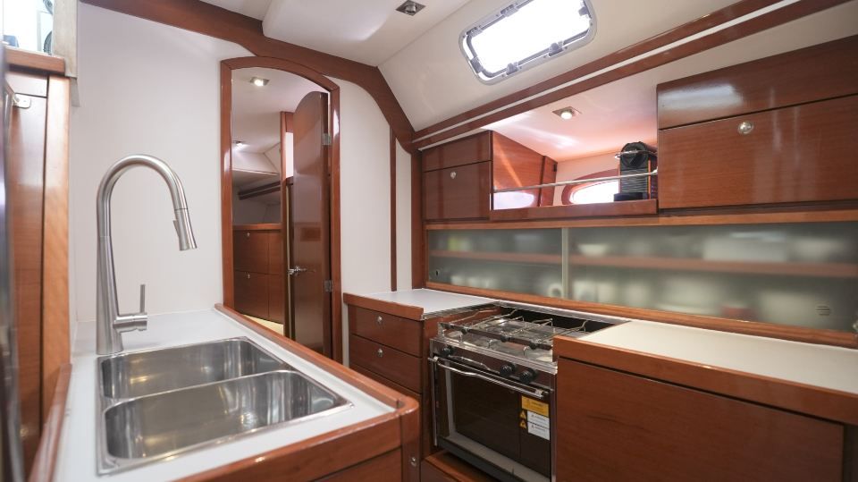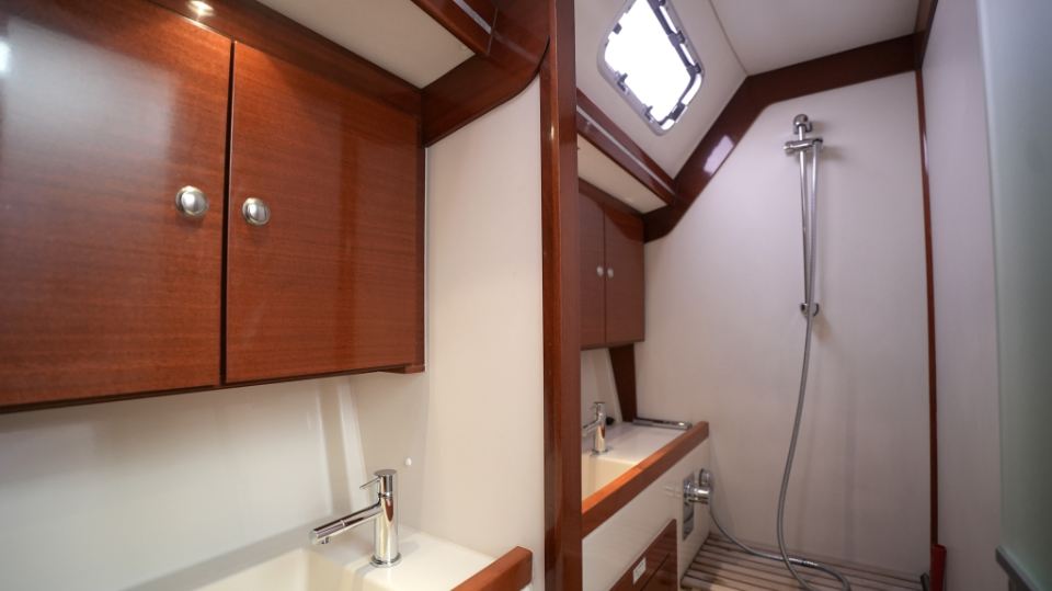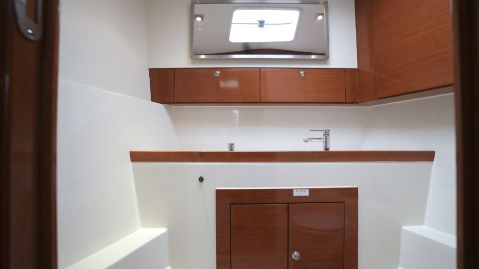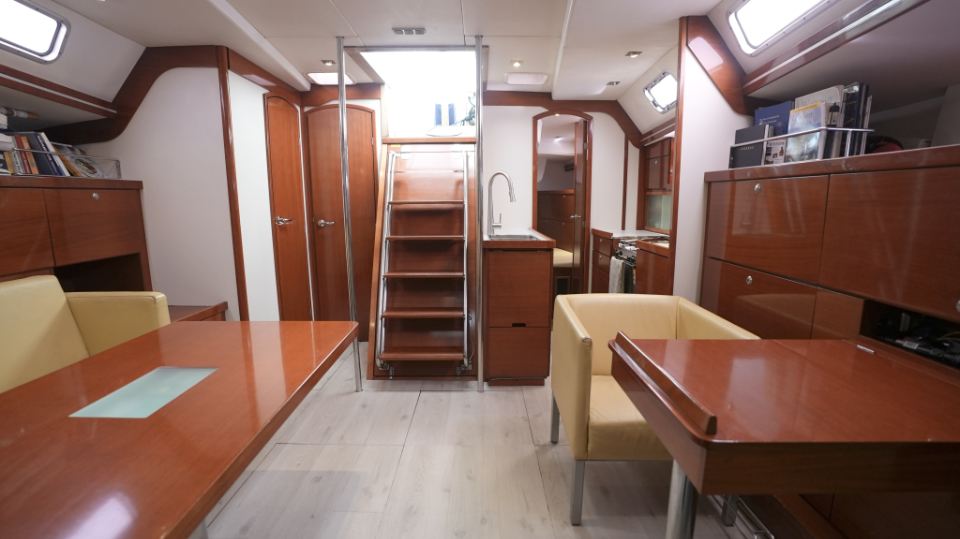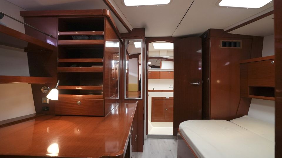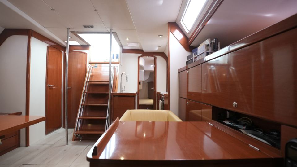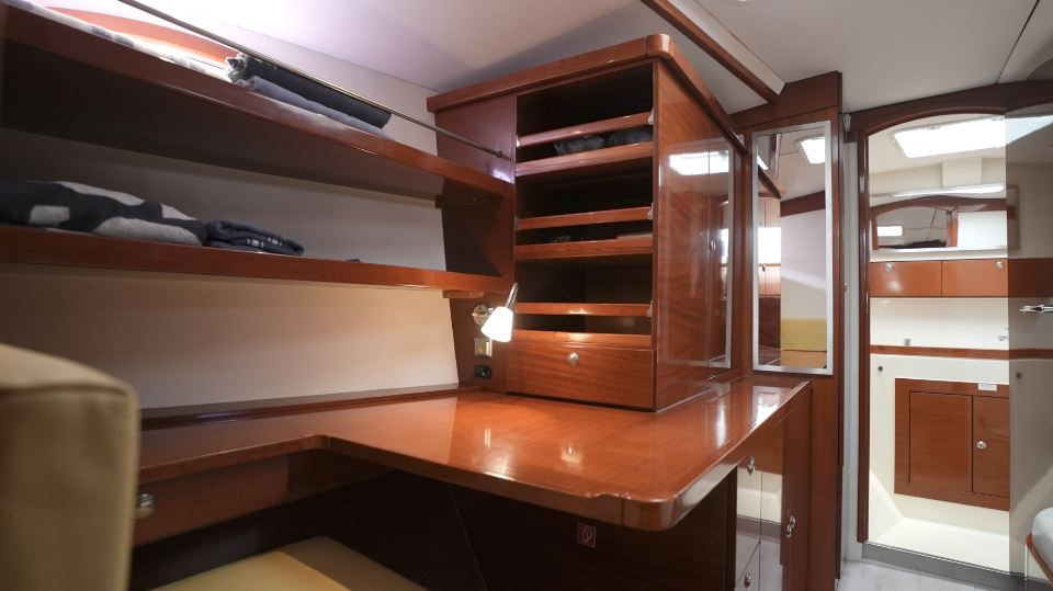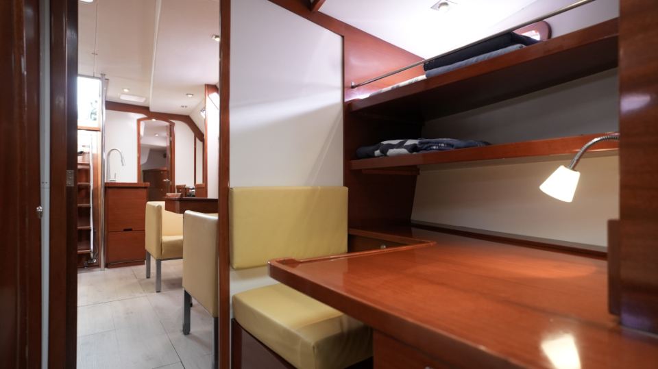 Under däck finns det tre kabiner, med ägarkabin i fören och två kabiner akterut. En tydlig styrka på båten är de generösa stuvutrymmena. Förvaringen är genomtänkt och väl fördelad, vilket gör det enkelt att hålla ordning även med full besättning och mycket utrustning ombord. Det bidrar till en interiör som känns luftig, prydlig och trivsam även under längre seglingar. Salongen upplevs ljus och rymlig tack vare stora skrovfönster och god ventilation. Pentryt är funktionellt och lätt att arbeta i, och navigationsplatsen är mer användbar än på många andra båtar där den ofta blir en ren arbetsstation. Här fungerar den lika naturligt som en del av livet ombord; fika, studier och umgänge. I ägarkabinen finns dessutom ett separat skrivbord, vilket ger en praktisk arbetsplats för den som vill kunna jobba remote.
