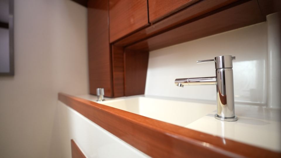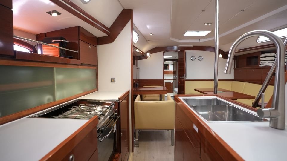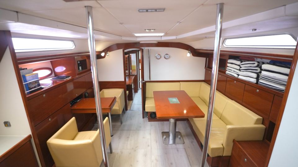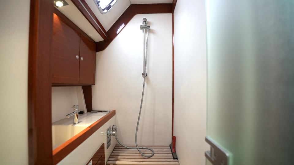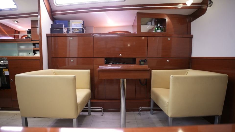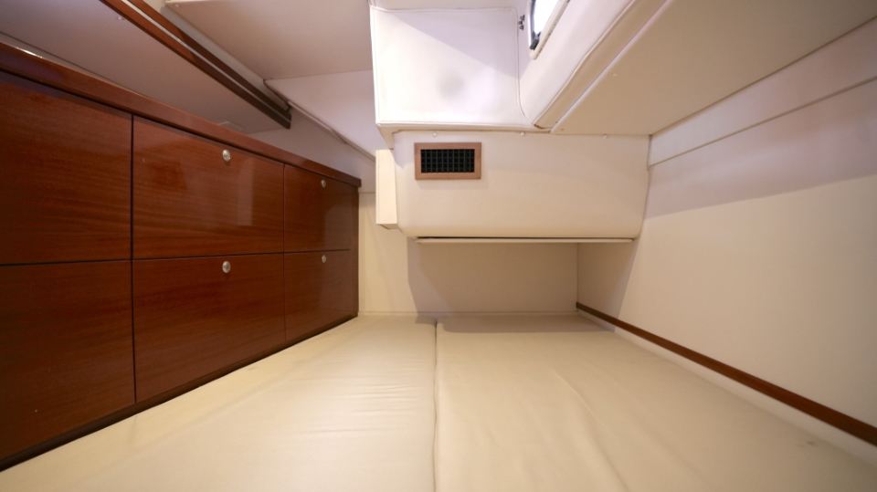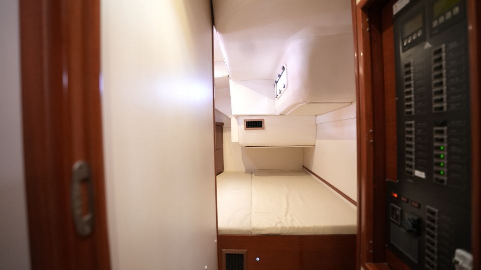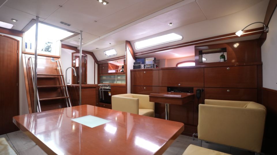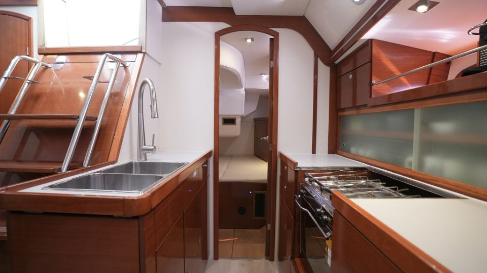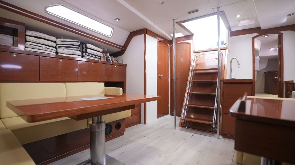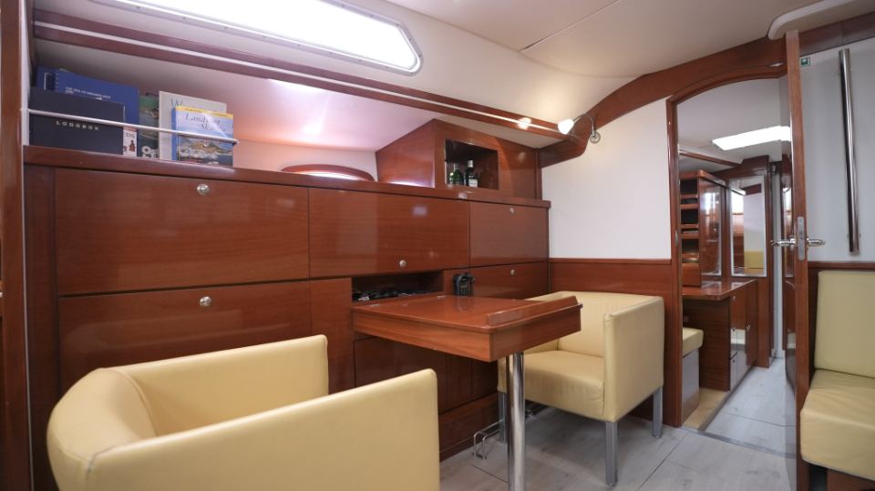 Under däck finns det tre kabiner, med ägarkabin i fören och två kabiner akterut. En tydlig styrka på båten är de generösa stuvutrymmena. Förvaringen är genomtänkt och väl fördelad, vilket gör det enkelt att hålla ordning även med full besättning och mycket utrustning ombord. Det bidrar till en interiör som känns luftig, prydlig och trivsam även under längre seglingar. Salongen upplevs ljus och rymlig tack vare stora skrovfönster och god ventilation. Pentryt är funktionellt och lätt att arbeta i, och navigationsplatsen är mer användbar än på många andra båtar där den ofta blir en ren arbetsstation. Här fungerar den lika naturligt som en del av livet ombord; fika, studier och umgänge. I ägarkabinen finns dessutom ett separat skrivbord, vilket ger en praktisk arbetsplats för den som vill kunna jobba remote.