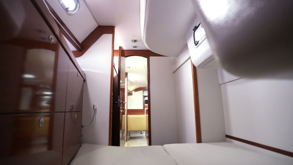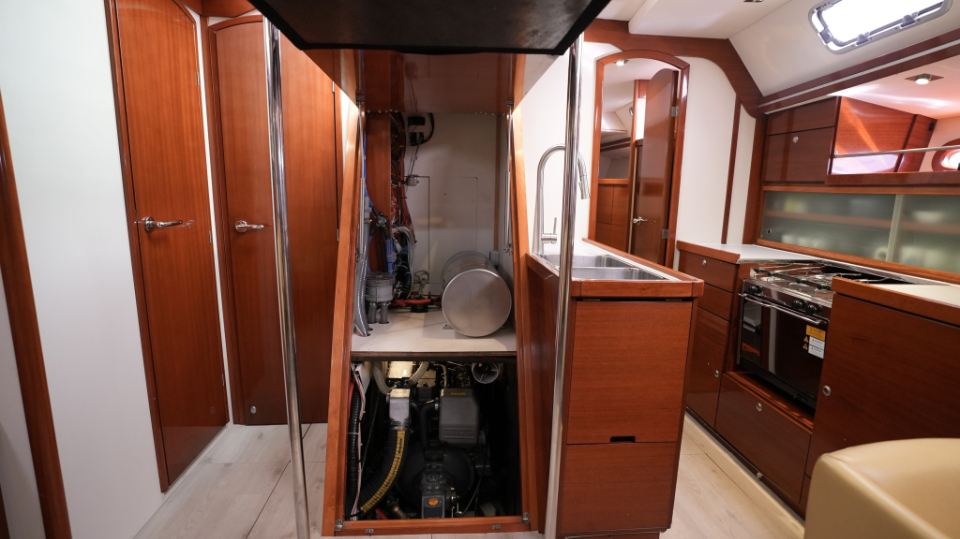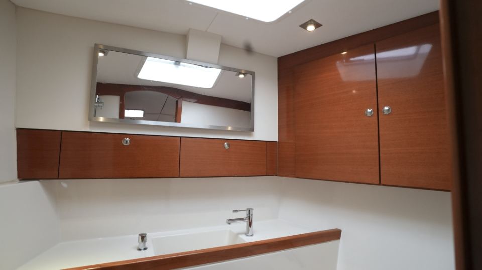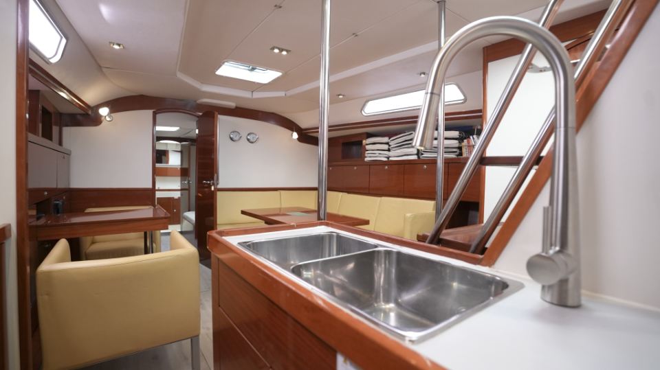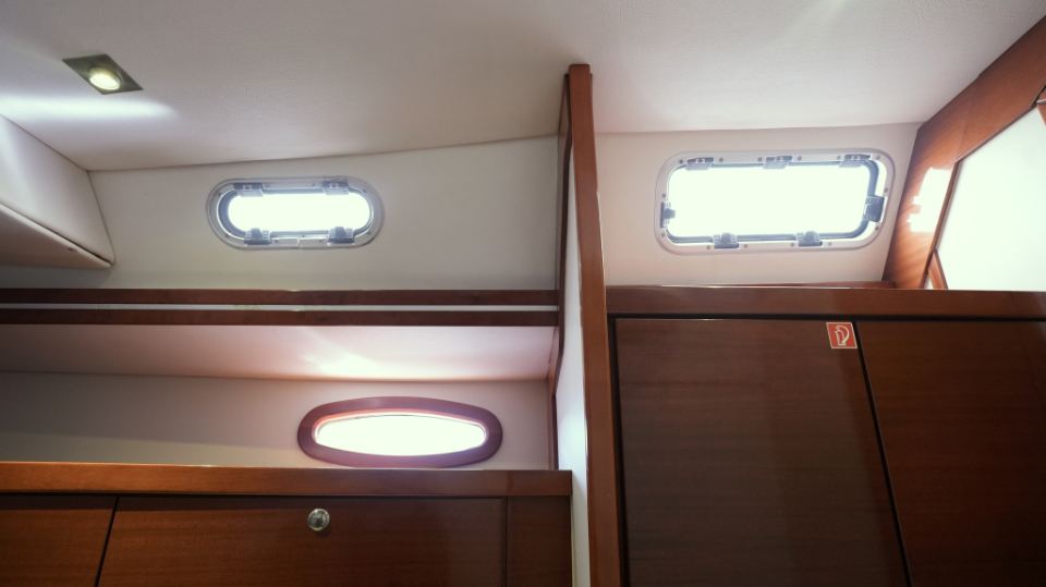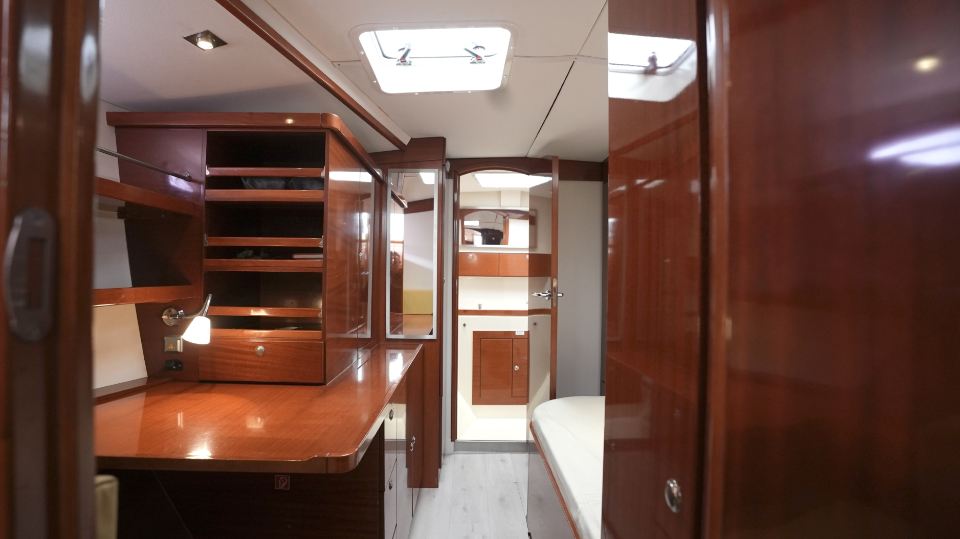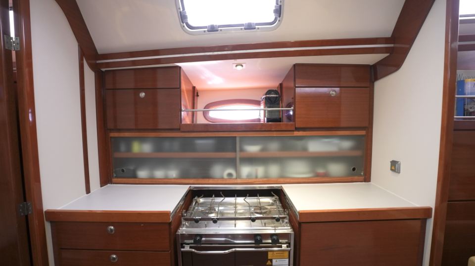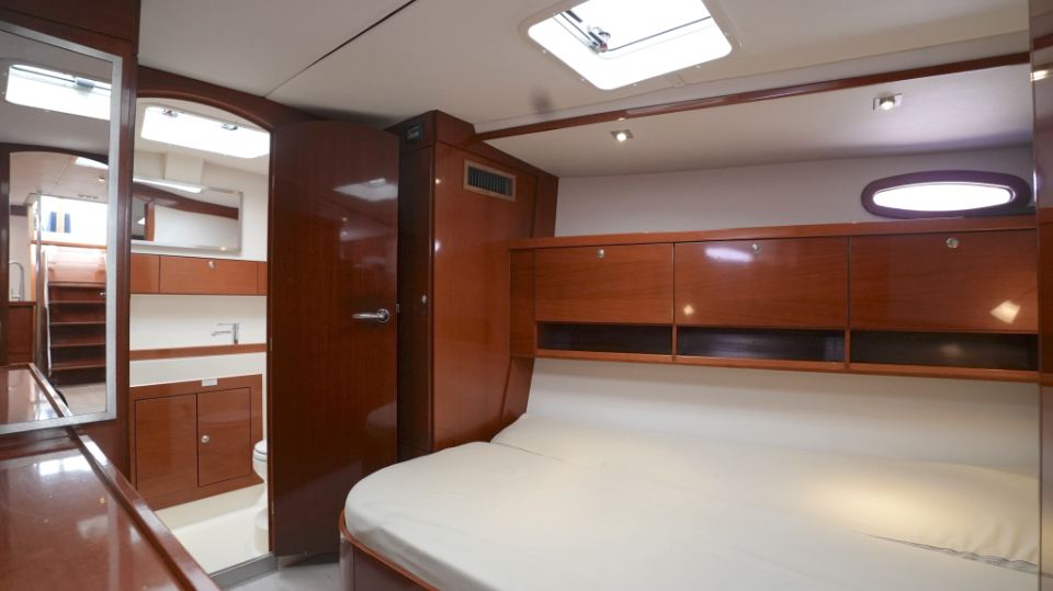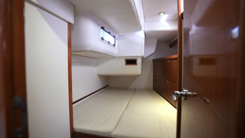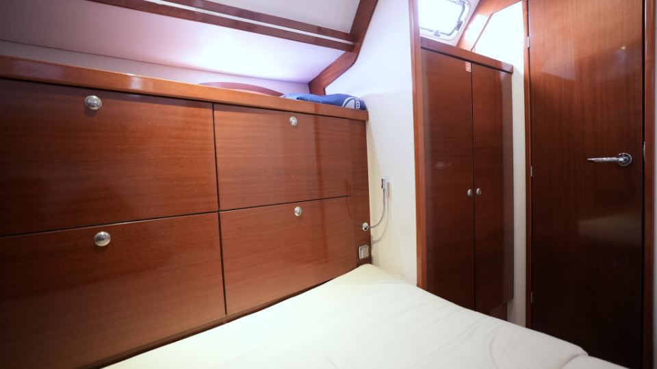 Under däck finns det tre kabiner, med ägarkabin i fören och två kabiner akterut. En tydlig styrka på båten är de generösa stuvutrymmena. Förvaringen är genomtänkt och väl fördelad, vilket gör det enkelt att hålla ordning även med full besättning och mycket utrustning ombord. Det bidrar till en interiör som känns luftig, prydlig och trivsam även under längre seglingar. Salongen upplevs ljus och rymlig tack vare stora skrovfönster och god ventilation. Pentryt är funktionellt och lätt att arbeta i, och navigationsplatsen är mer användbar än på många andra båtar där den ofta blir en ren arbetsstation. Här fungerar den lika naturligt som en del av livet ombord; fika, studier och umgänge. I ägarkabinen finns dessutom ett separat skrivbord, vilket ger en praktisk arbetsplats för den som vill kunna jobba remote.