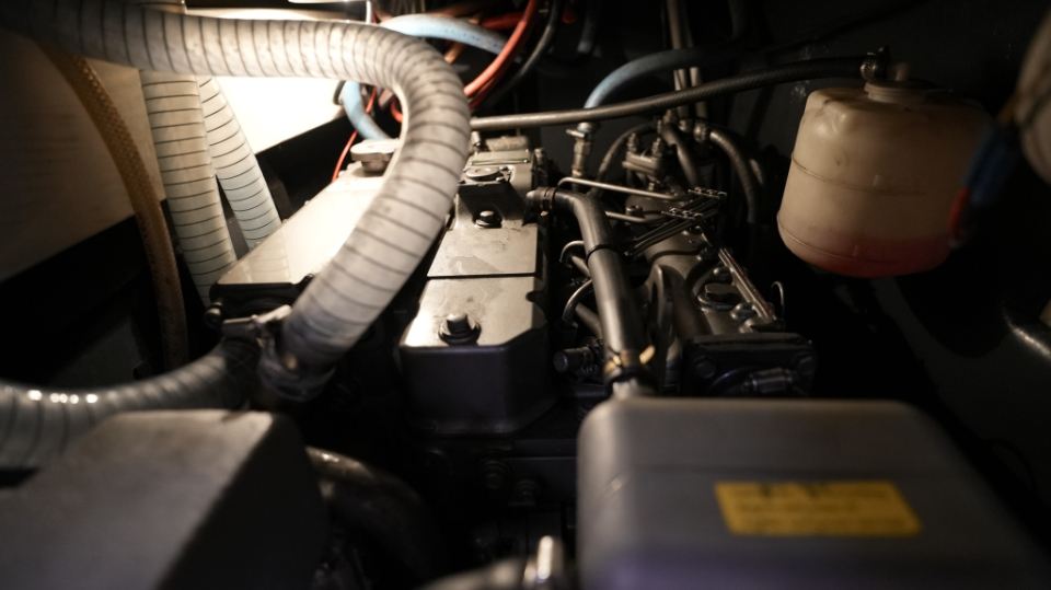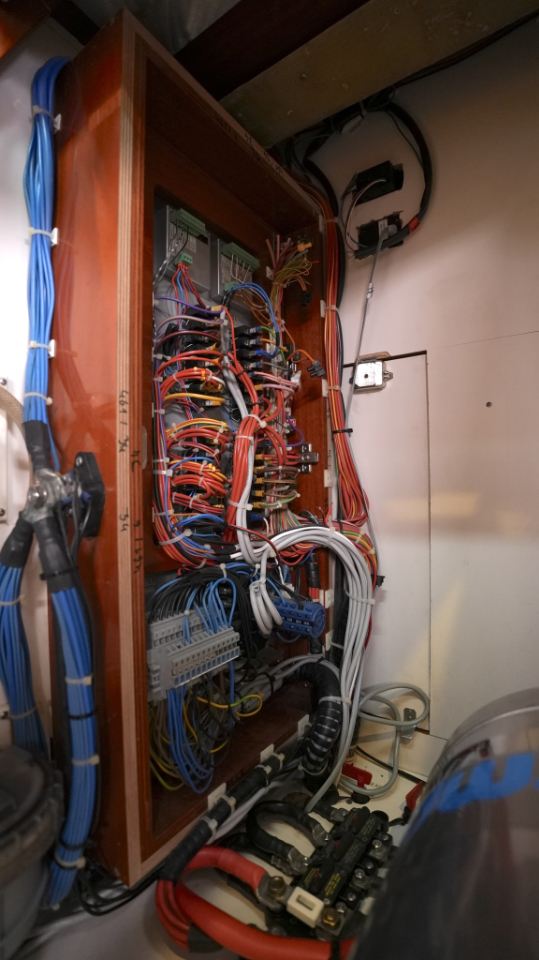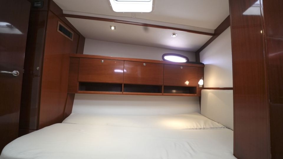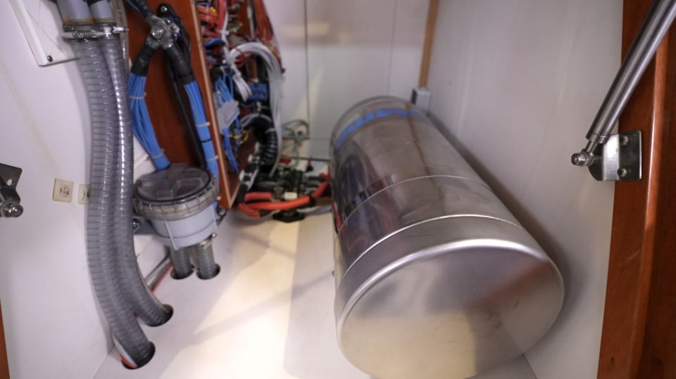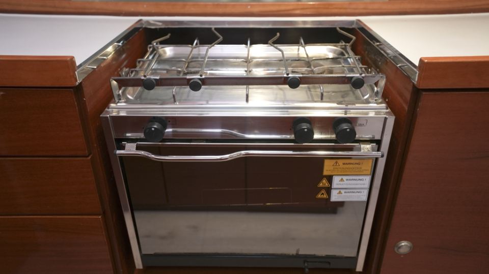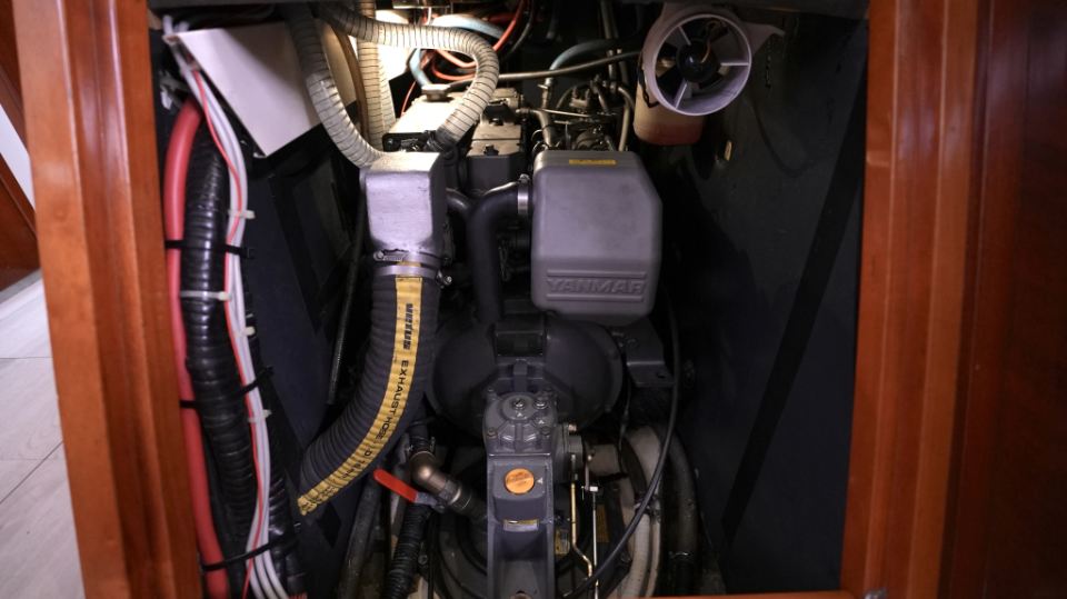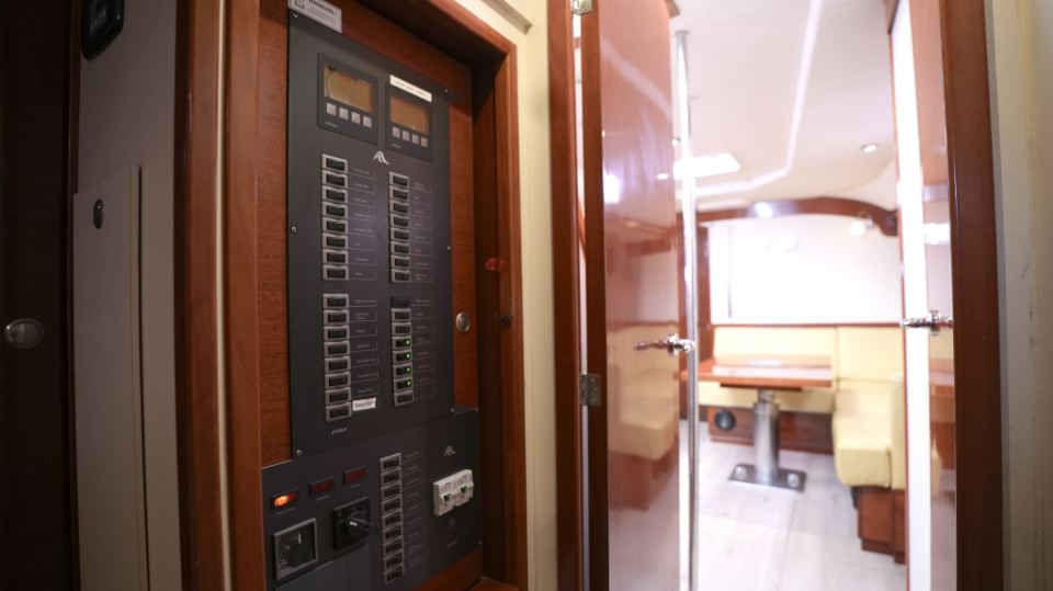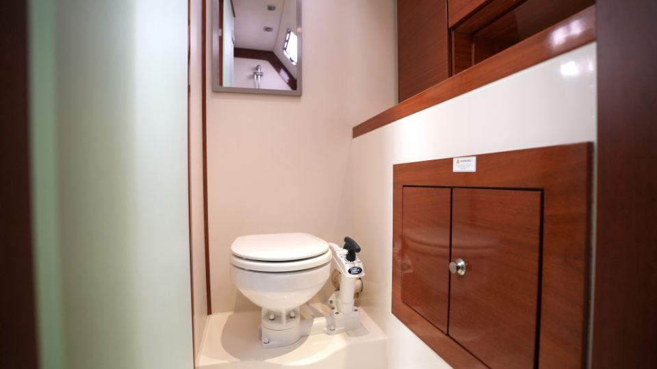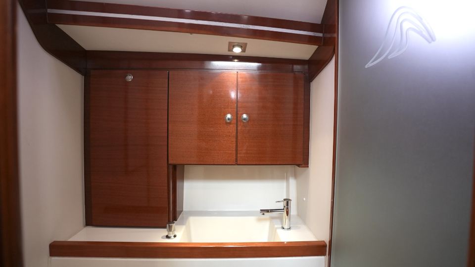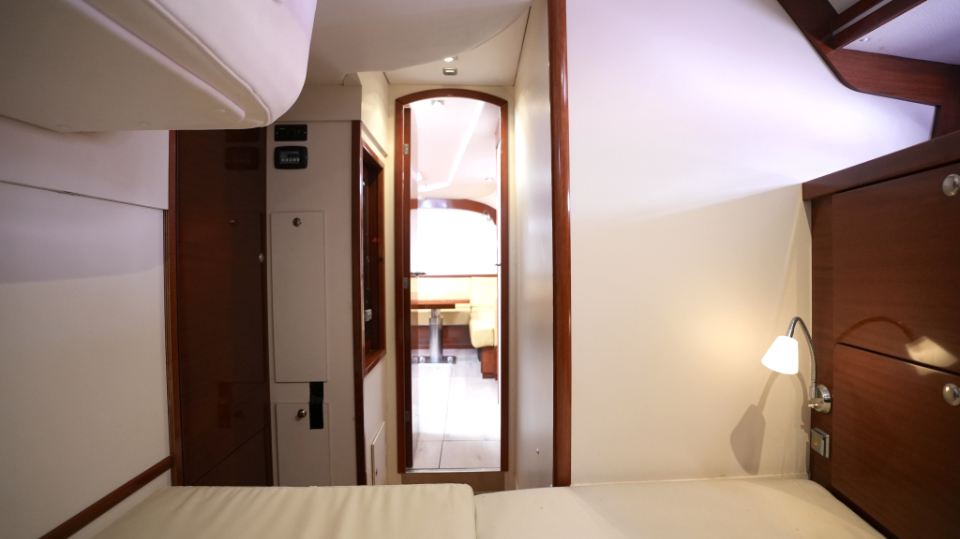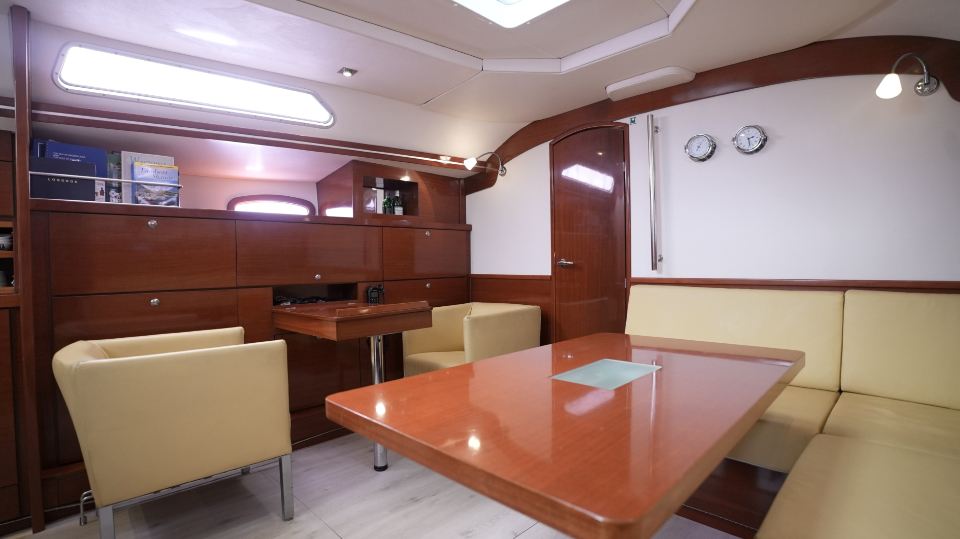 Under däck finns det tre kabiner, med ägarkabin i fören och två kabiner akterut. En tydlig styrka på båten är de generösa stuvutrymmena. Förvaringen är genomtänkt och väl fördelad, vilket gör det enkelt att hålla ordning även med full besättning och mycket utrustning ombord. Det bidrar till en interiör som känns luftig, prydlig och trivsam även under längre seglingar. Salongen upplevs ljus och rymlig tack vare stora skrovfönster och god ventilation. Pentryt är funktionellt och lätt att arbeta i, och navigationsplatsen är mer användbar än på många andra båtar där den ofta blir en ren arbetsstation. Här fungerar den lika naturligt som en del av livet ombord; fika, studier och umgänge. I ägarkabinen finns dessutom ett separat skrivbord, vilket ger en praktisk arbetsplats för den som vill kunna jobba remote.