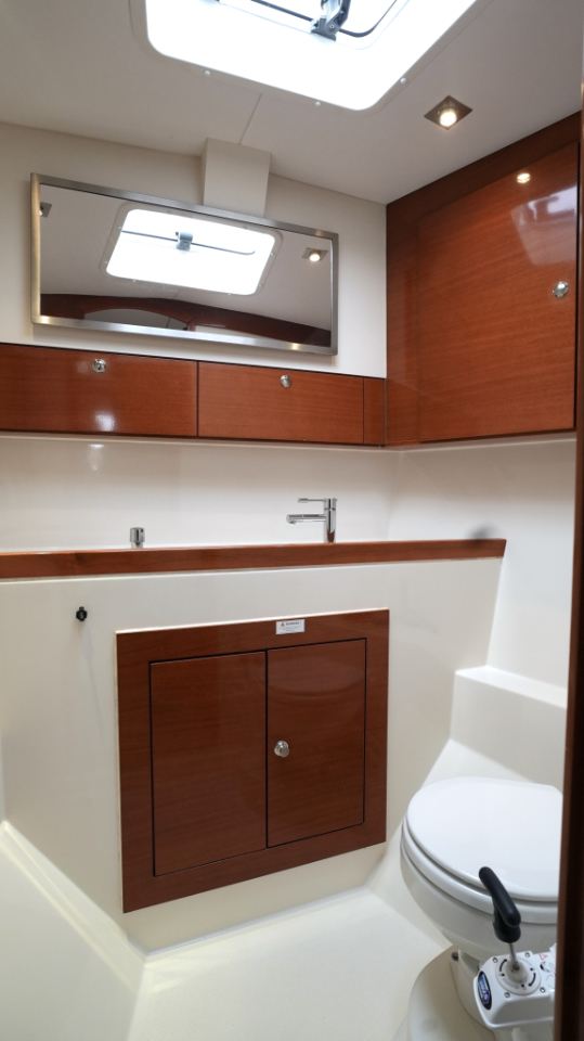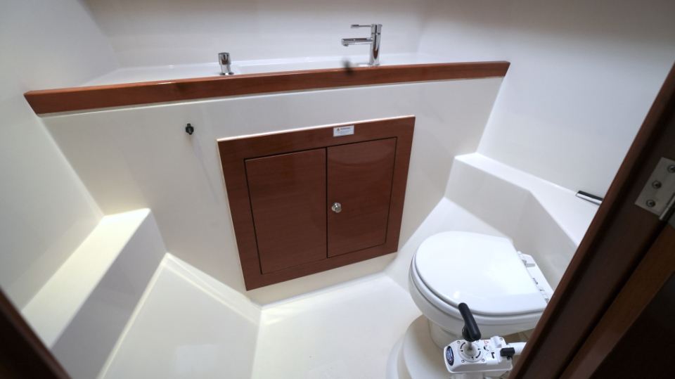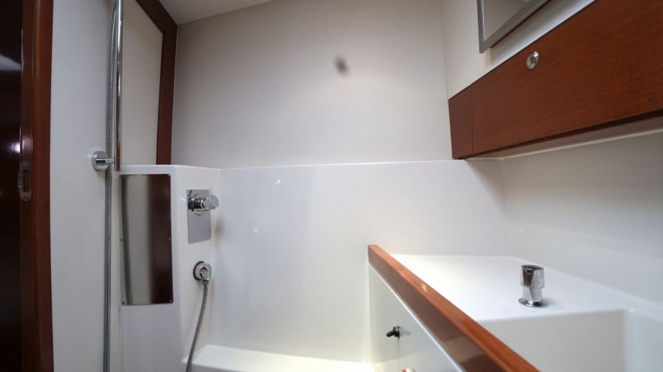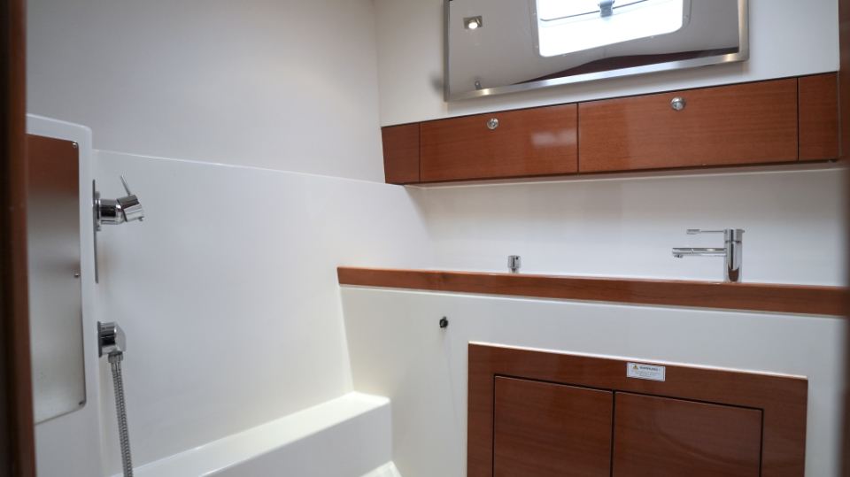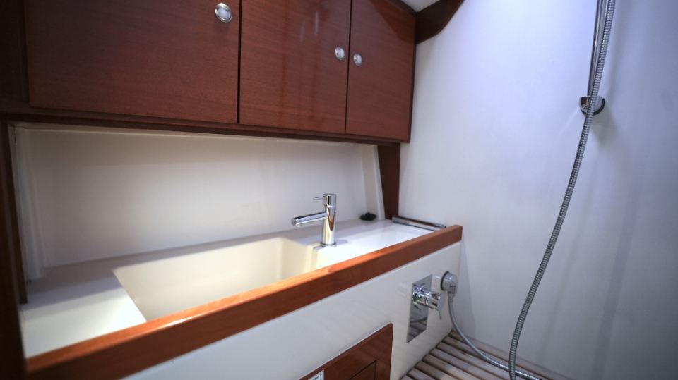 På däck är sittbrunnen rymlig med dubbla rattar och bekväma sittplatser. Majoriteten av den löpande riggen är dragen ner till sittbrunnen, vilket gör hanteringen enkel och säker. En nedfällbar badplattform i aktern ger bra access till vattnet och vid bad, ankring och i hamn. Fördäcket är rent och funktionellt och ankaret fälls ner i kättingboxen, något som både höjer estetiken men också minska pitchen samt minskar risken för att fastna i saker i trånga situationer