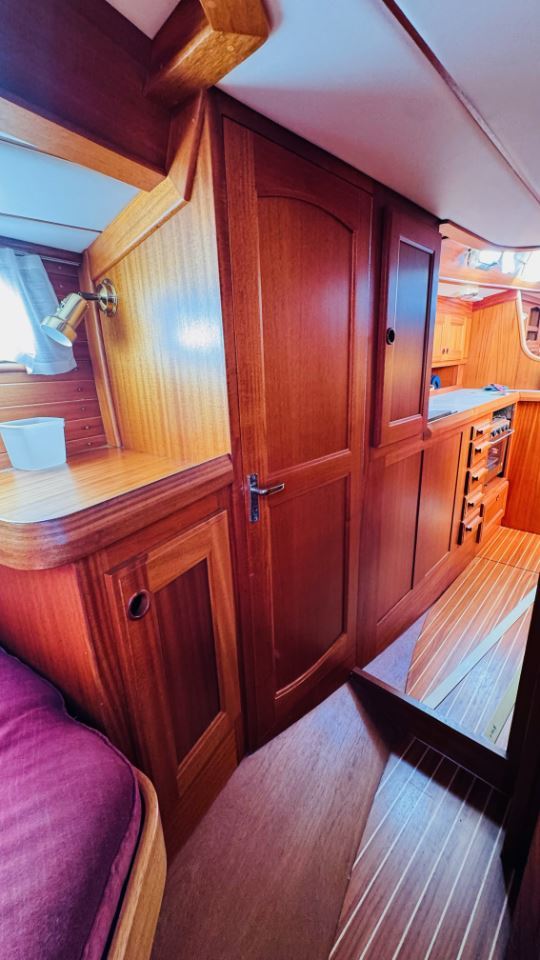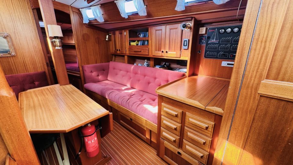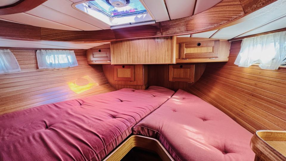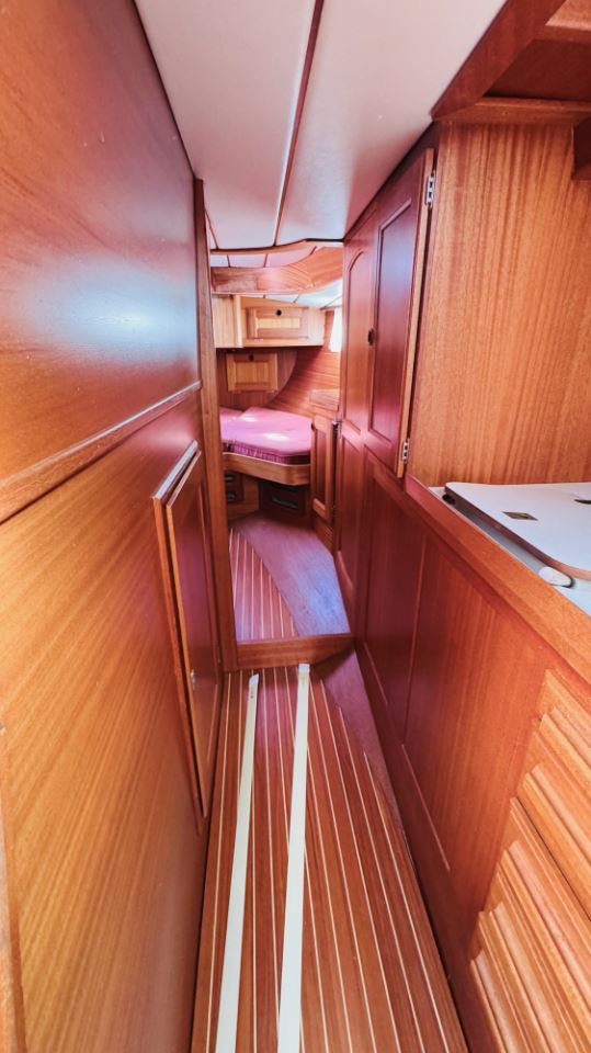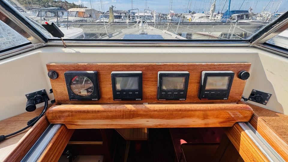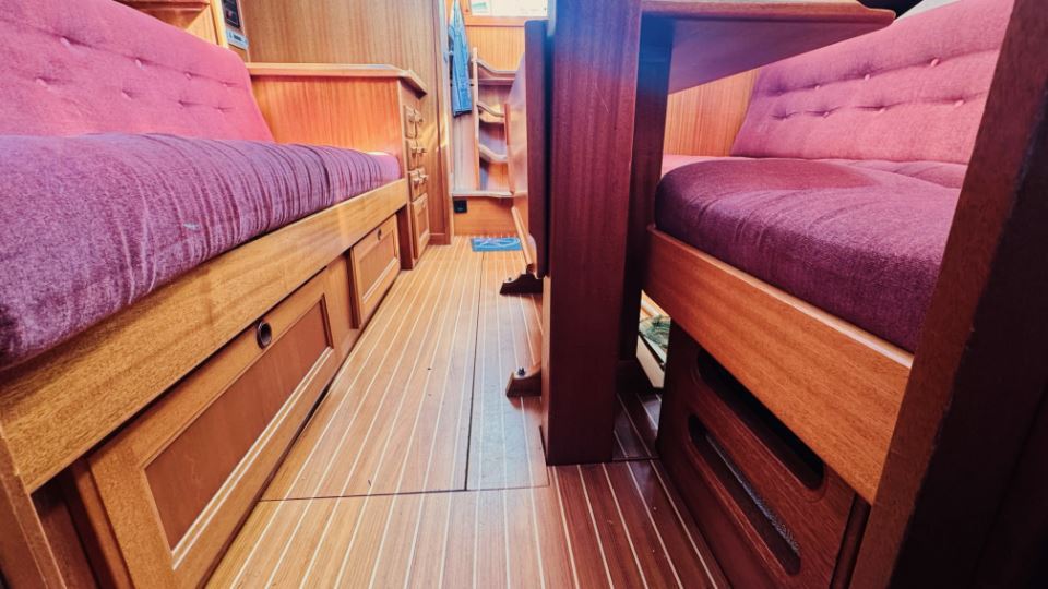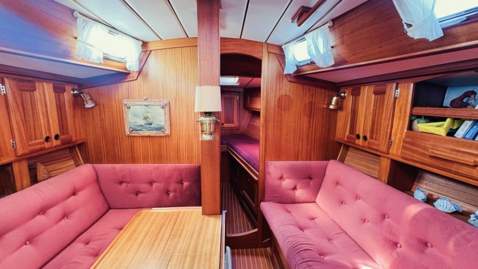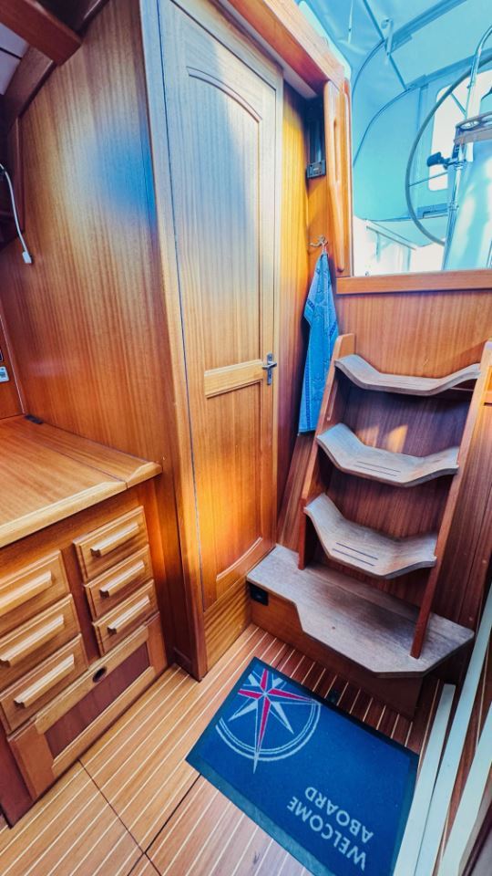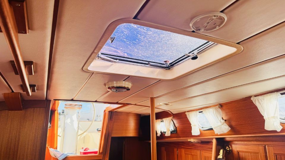 Invändigt erbjuder båten en tvåkabinslayout med en ägarkabin akterut och en gästkabin förut. Det längsgående pentryt, toaletten och navigationsplatsen är placerade direkt vid nedgångstrappan. Inredningen är tillverkad i mahogny av hög kvalitet, vilket ger en varm och klassisk känsla ombord.