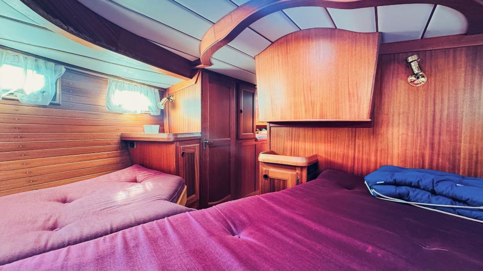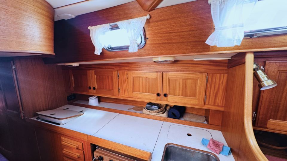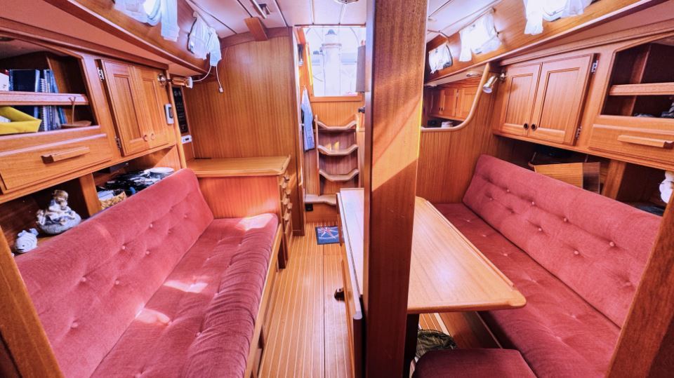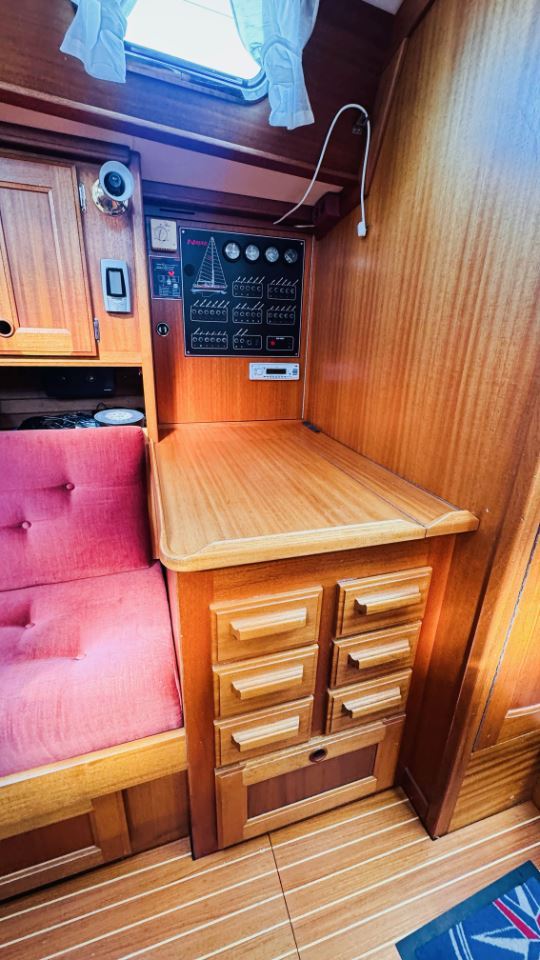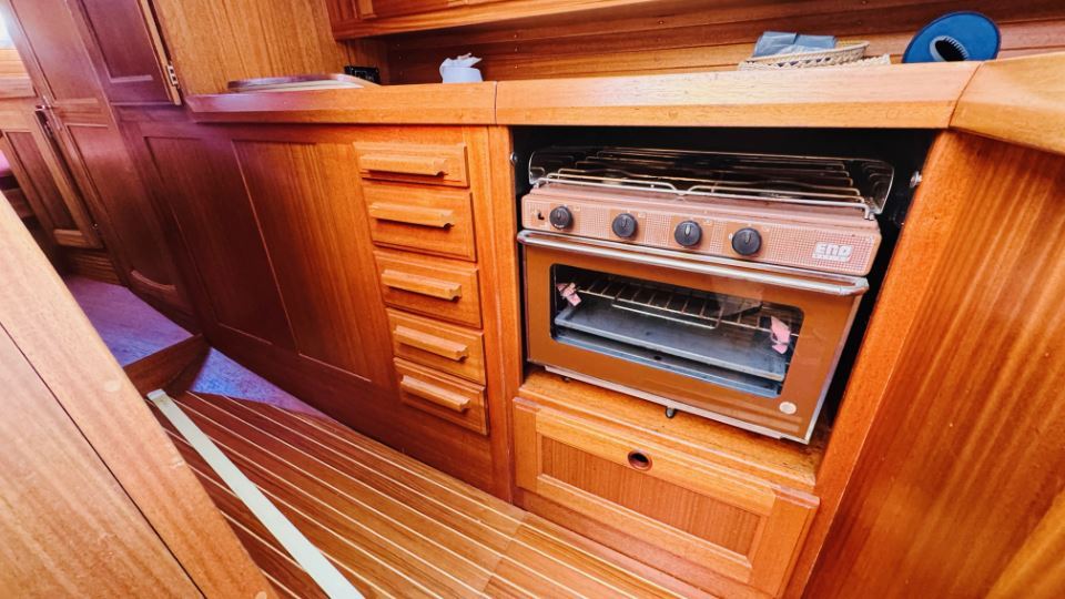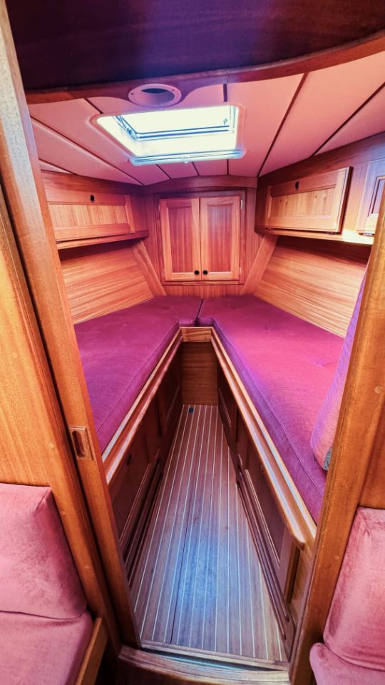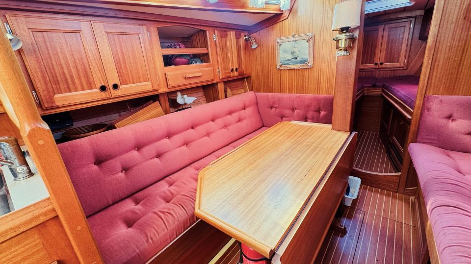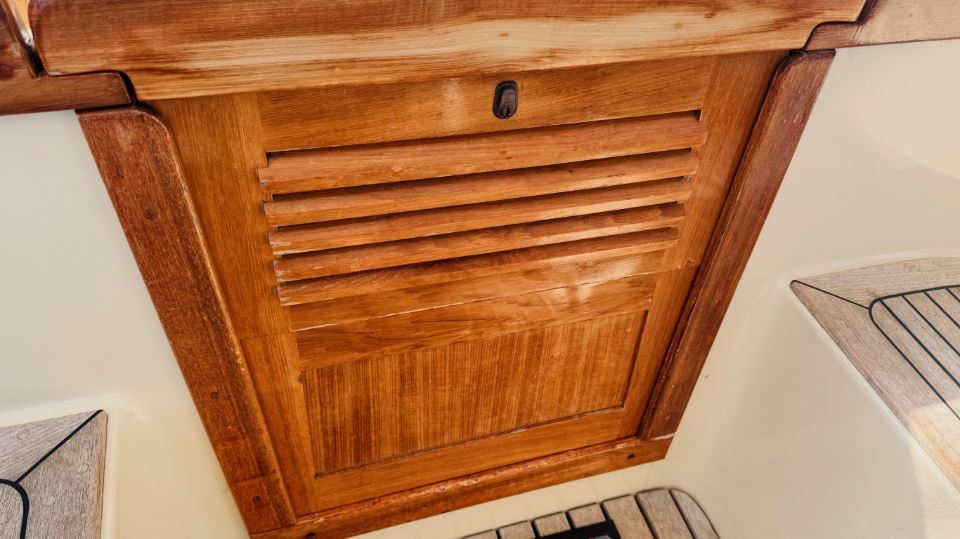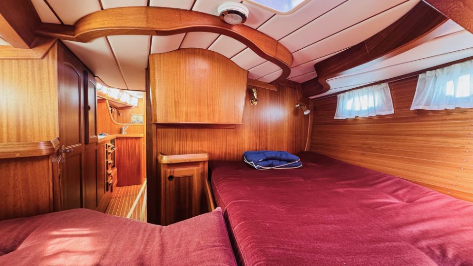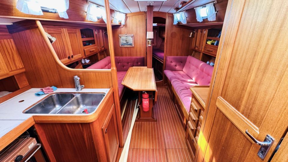 Invändigt erbjuder båten en tvåkabinslayout med en ägarkabin akterut och en gästkabin förut. Det längsgående pentryt, toaletten och navigationsplatsen är placerade direkt vid nedgångstrappan. Inredningen är tillverkad i mahogny av hög kvalitet, vilket ger en varm och klassisk känsla ombord.