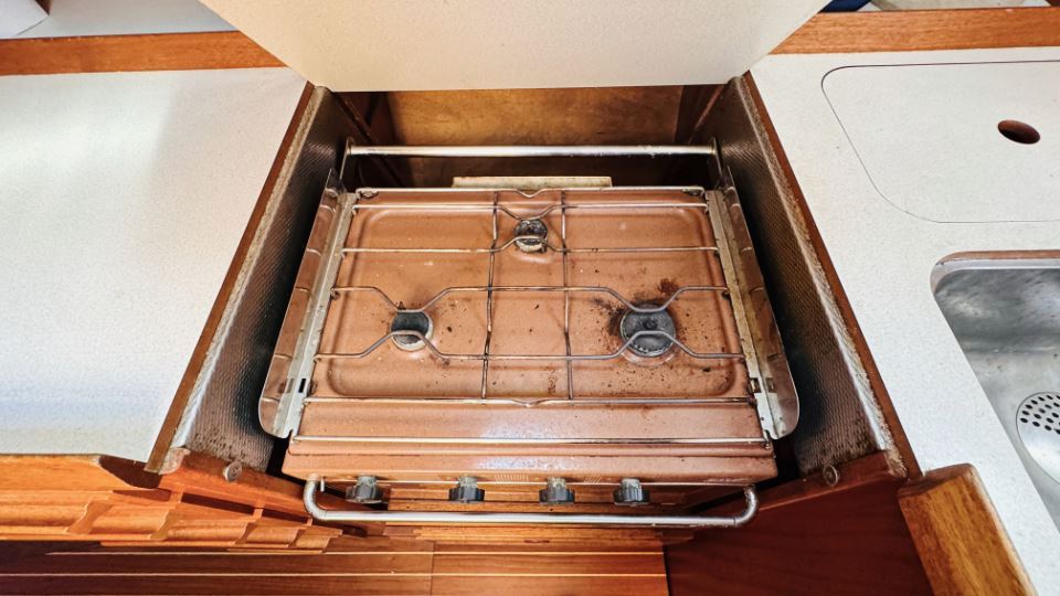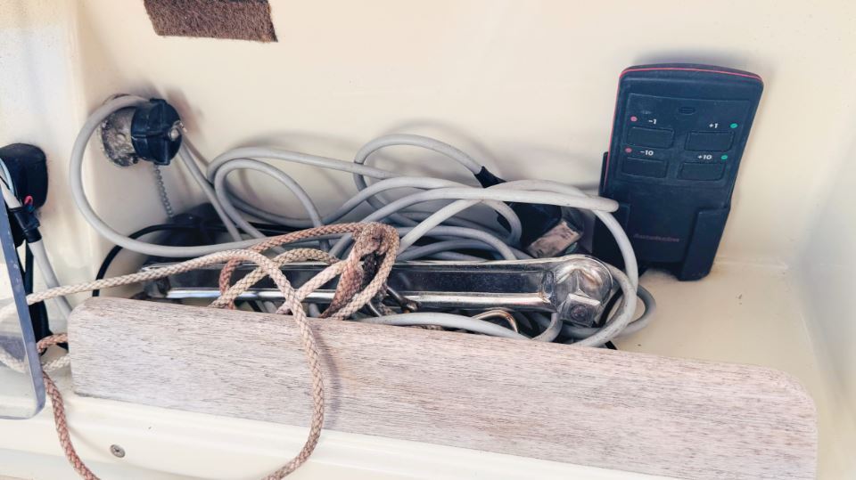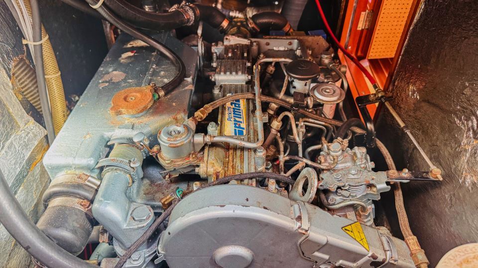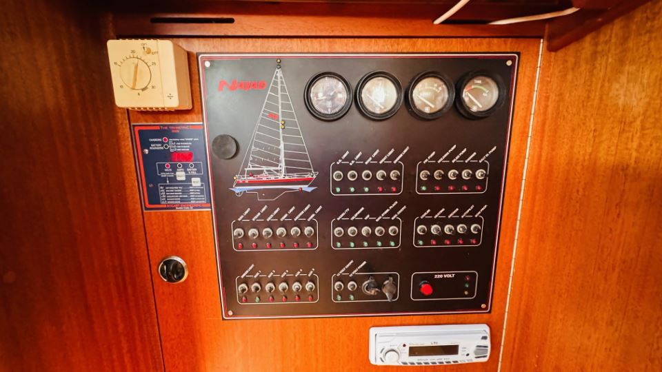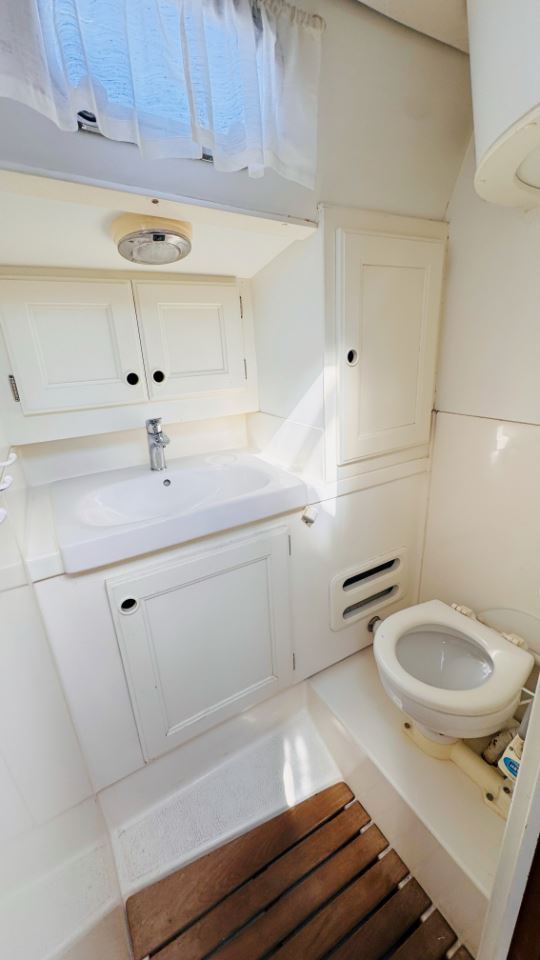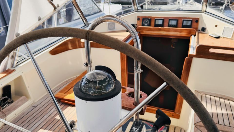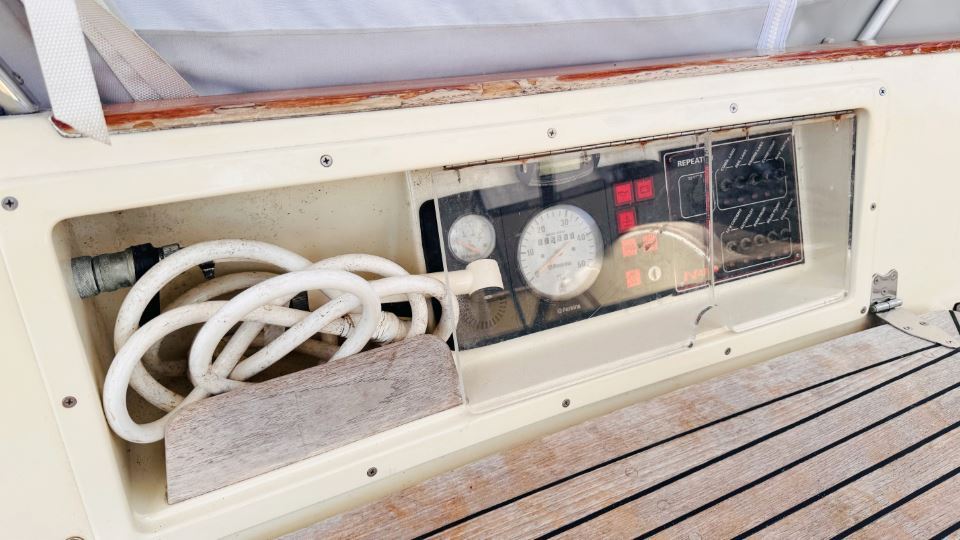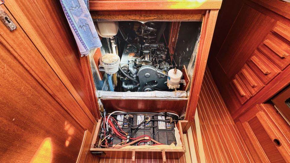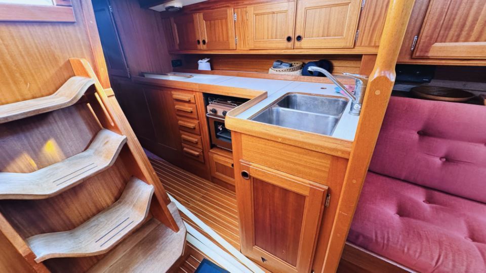 Invändigt erbjuder båten en tvåkabinslayout med en ägarkabin akterut och en gästkabin förut. Det längsgående pentryt, toaletten och navigationsplatsen är placerade direkt vid nedgångstrappan. Inredningen är tillverkad i mahogny av hög kvalitet, vilket ger en varm och klassisk känsla ombord.