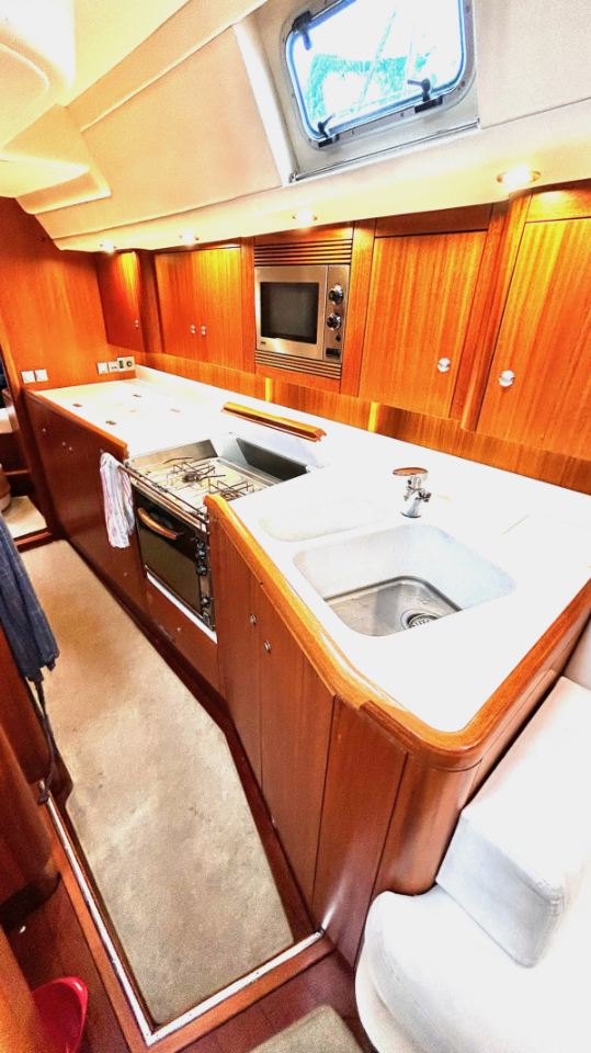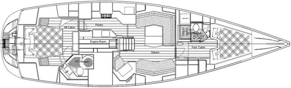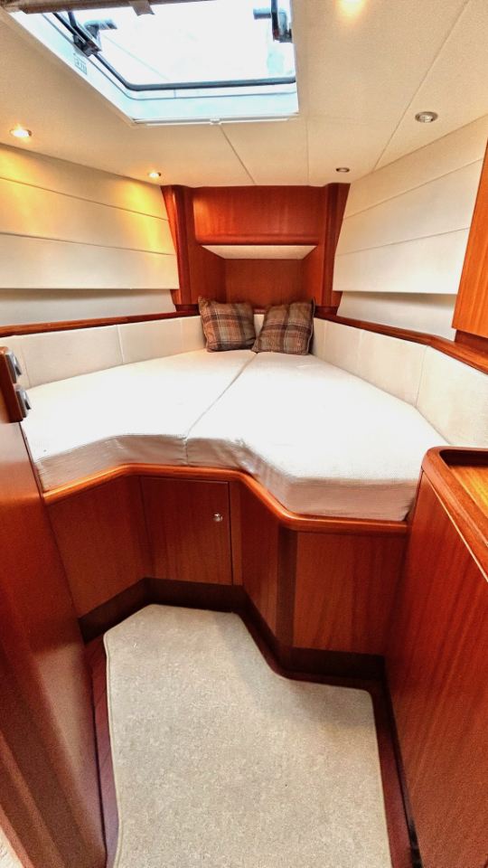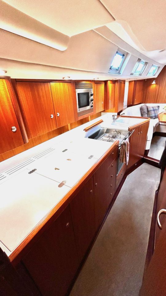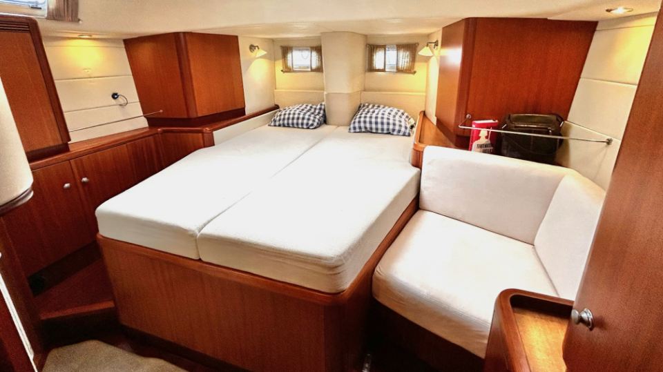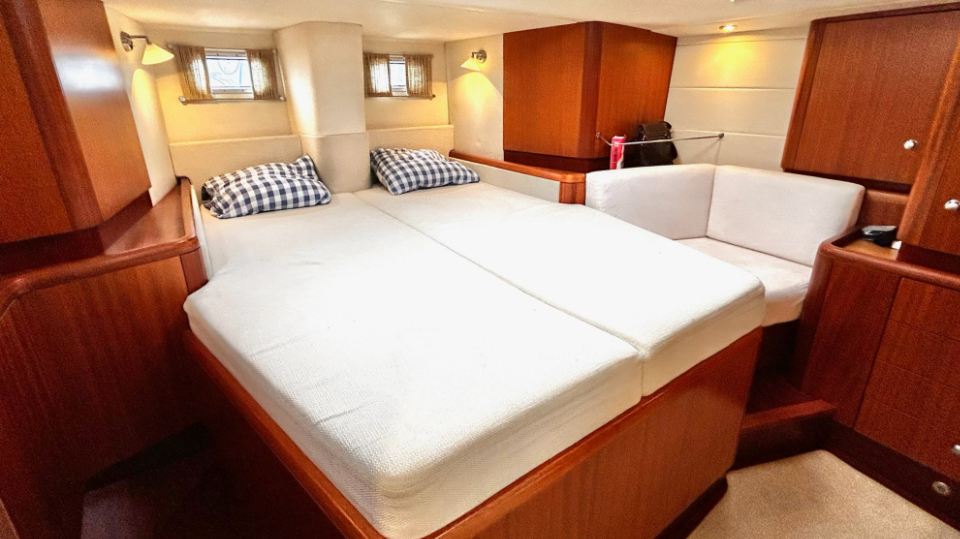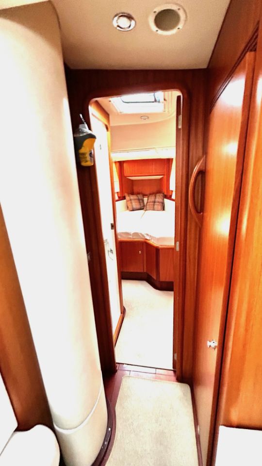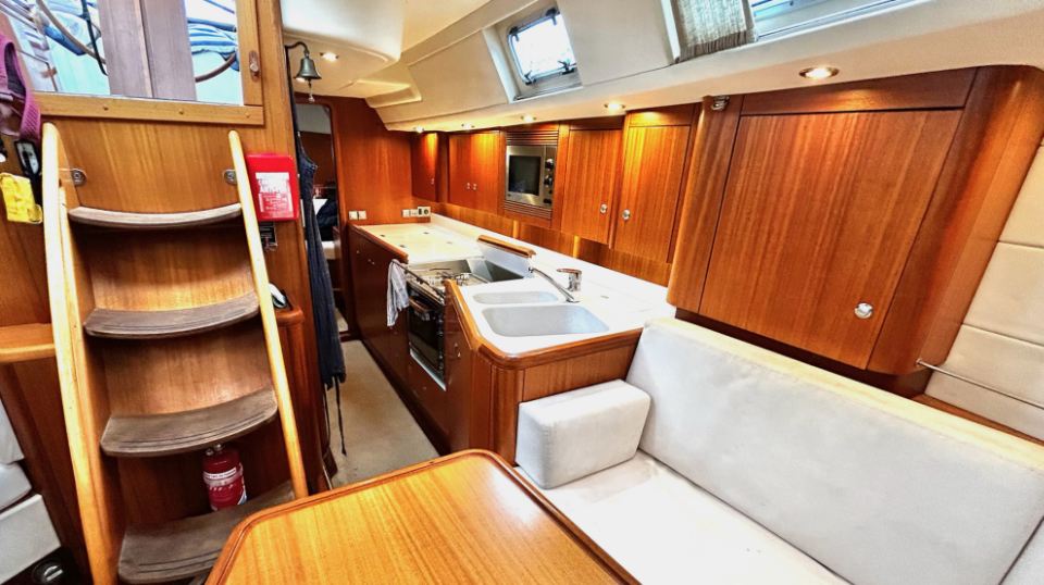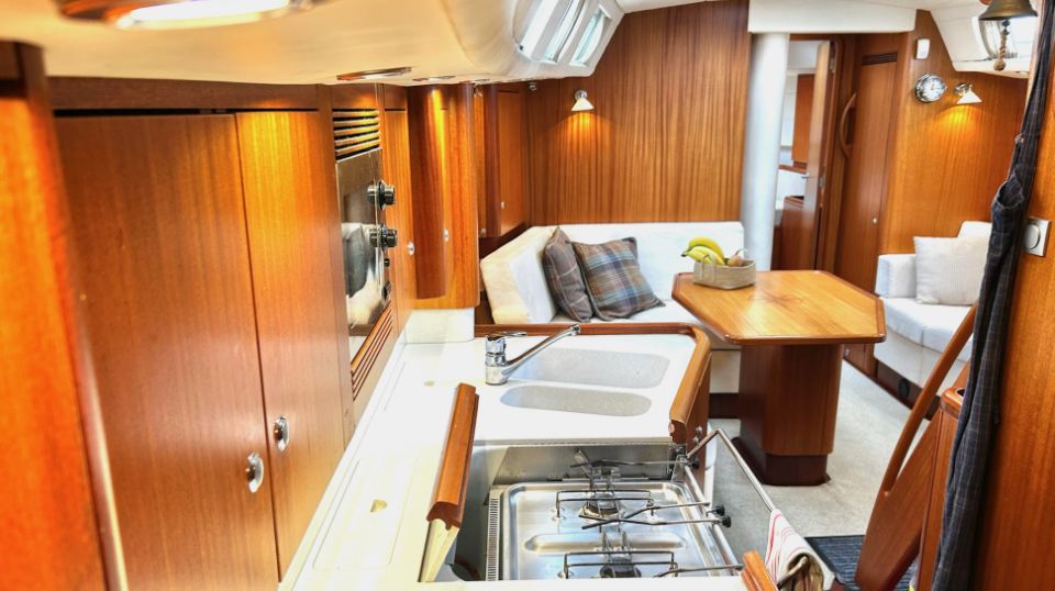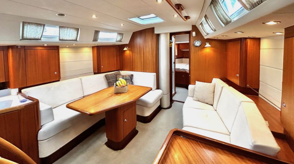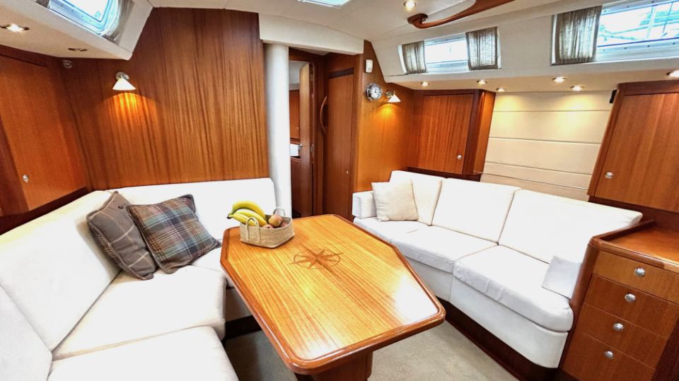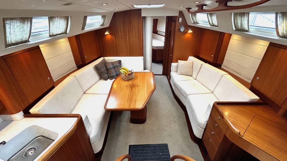 Interiören har en rymlig ägarhytt akterut med dubbelkoj samt en privat toalett med dusch. Gästhytten i fören har också dubbelkoj, egen toalett med dusch och gott om förvaringsutrymme. Ett längsgående, sjögående pentry är placerat till babord om nedgången och sträcker sig akterut, medan navigationsplatsen med en bekväm sittplats är placerad direkt till styrbord om ingången. Salongen är disponerad med en L-formad soffa till babord och en rak soffa till styrbord, en utmärkt planlösning för längre oceanseglingar.
