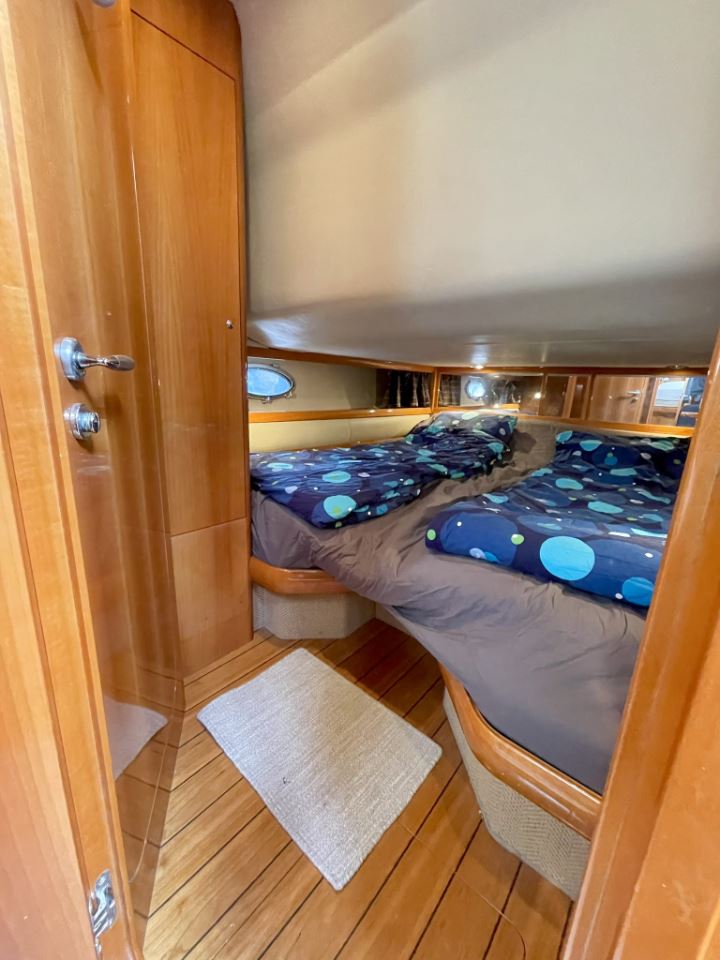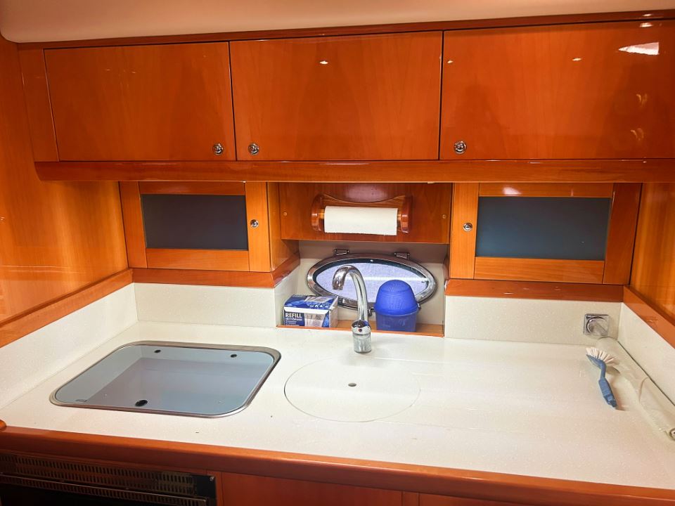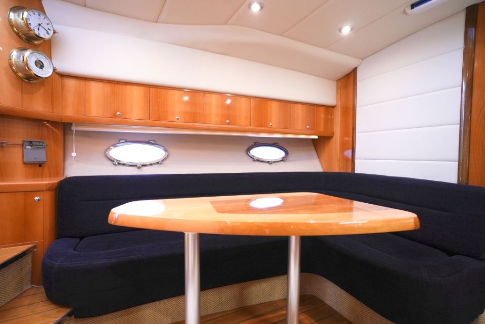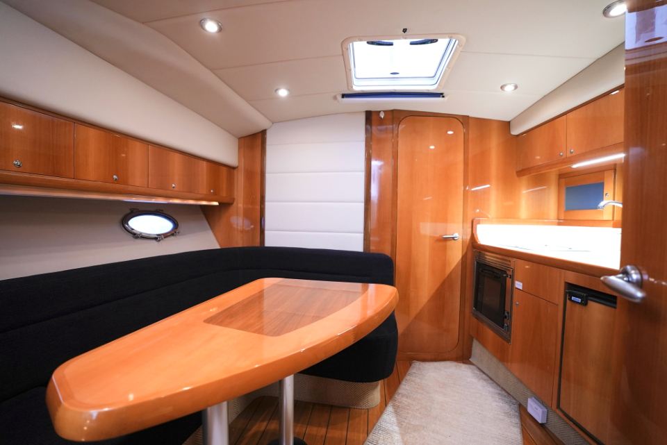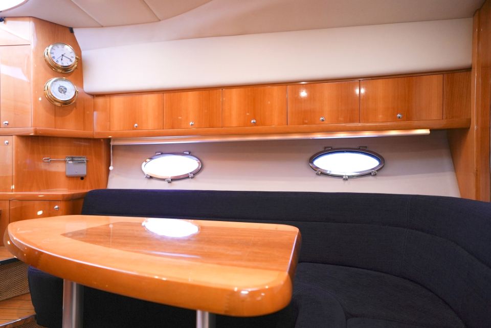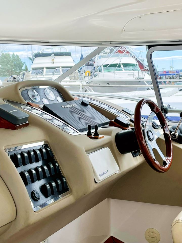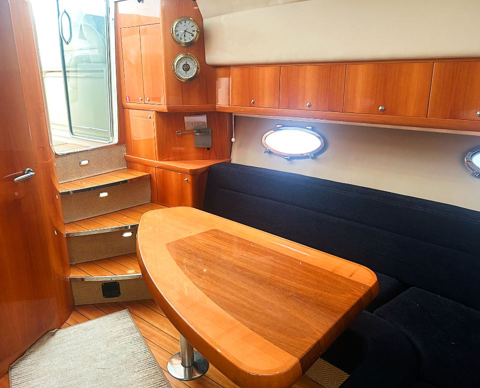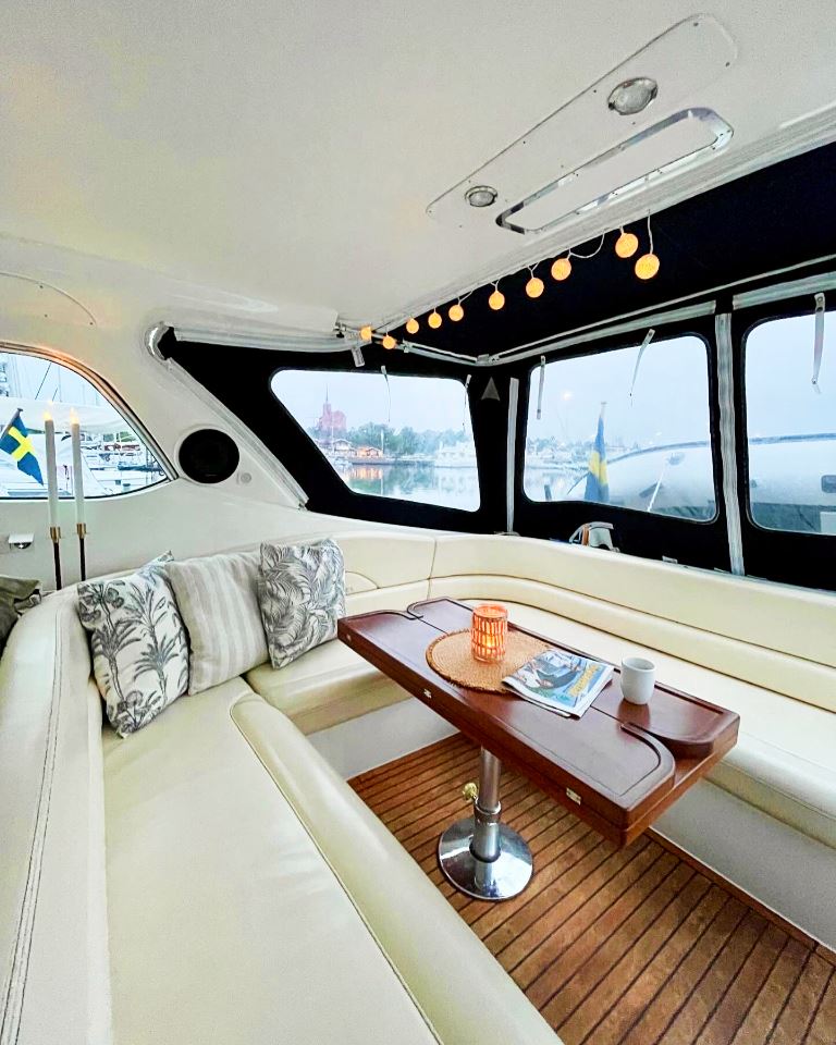 Båten har en välutrustad och genomtänkt nivå av navigations och elsystem med plotter, radar, AIS, autopilot, bog och akterpropeller, inverter, bränslecell och solpanel, vilket gör den mycket lämpad för längre turer och vistelser utan tillgång till landström. Invändigt möts man av högblank körsbärsträ, läderdetaljer och ljusa innertak som ger den typiska Windy-känslan av kvalitet och rymd. Två riktiga kabiner och en praktisk salong ger gott om plats för familj och gäster.